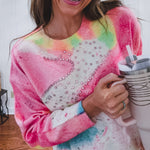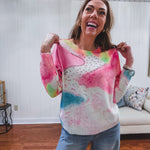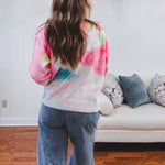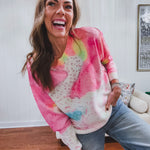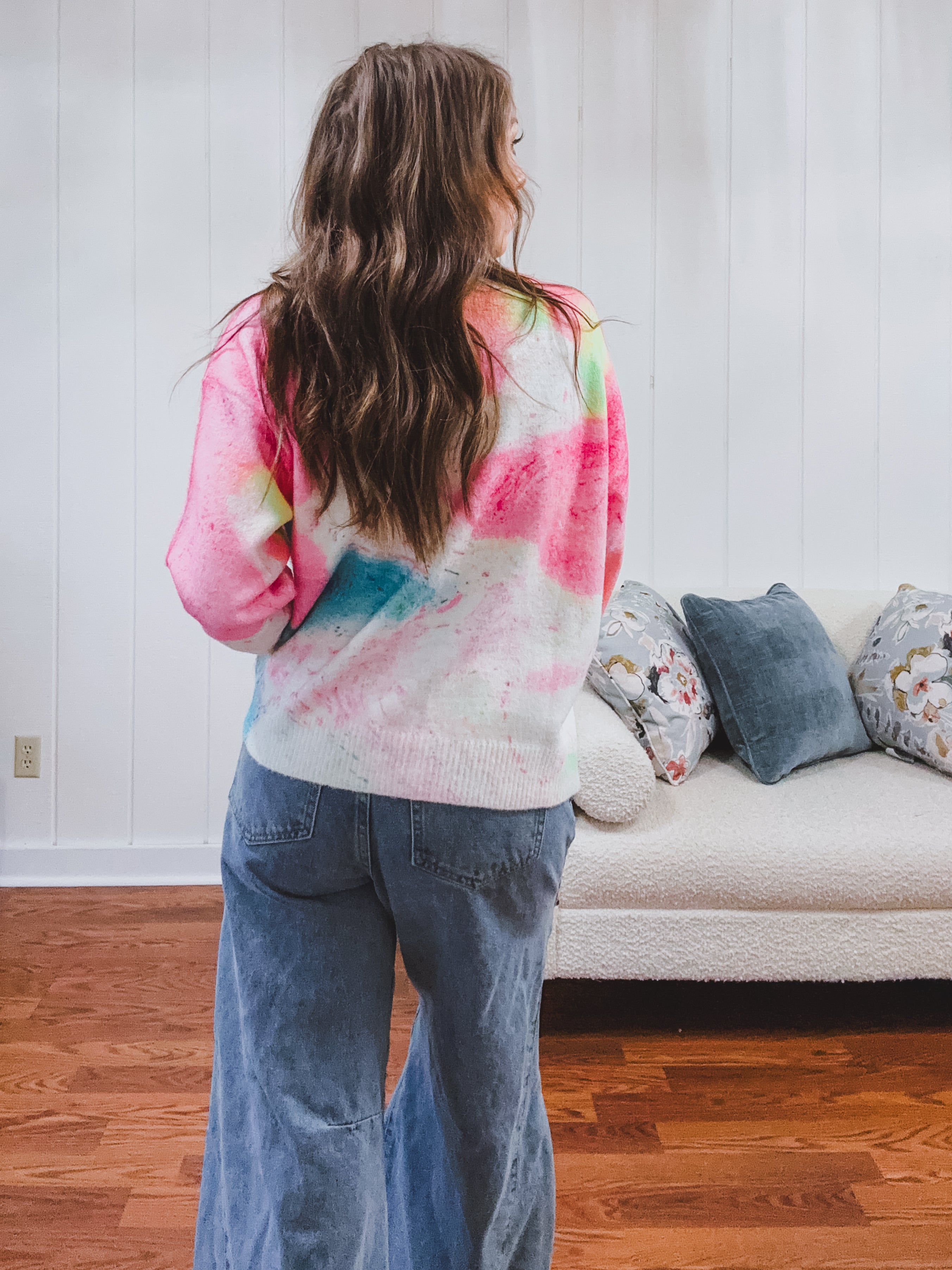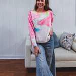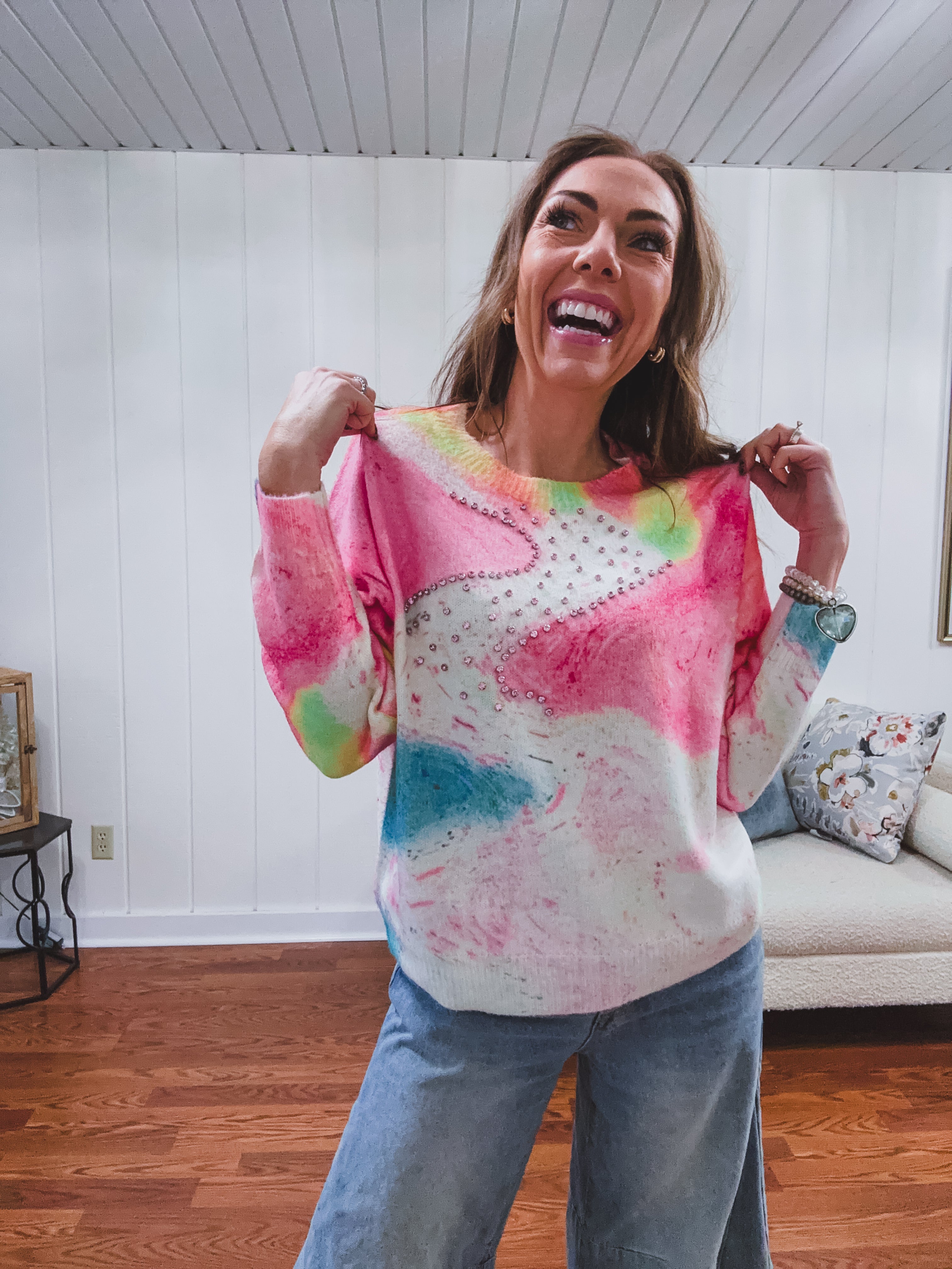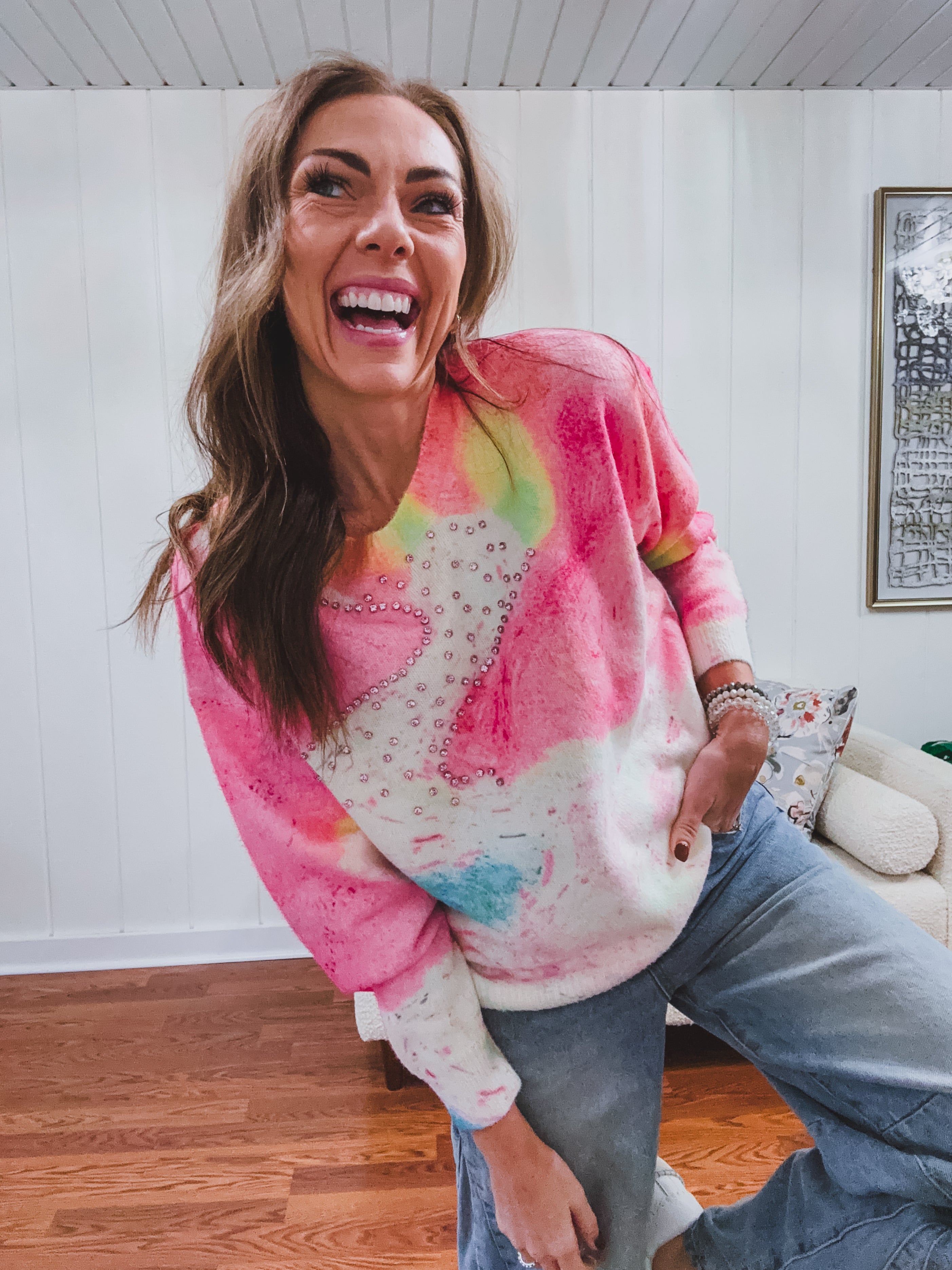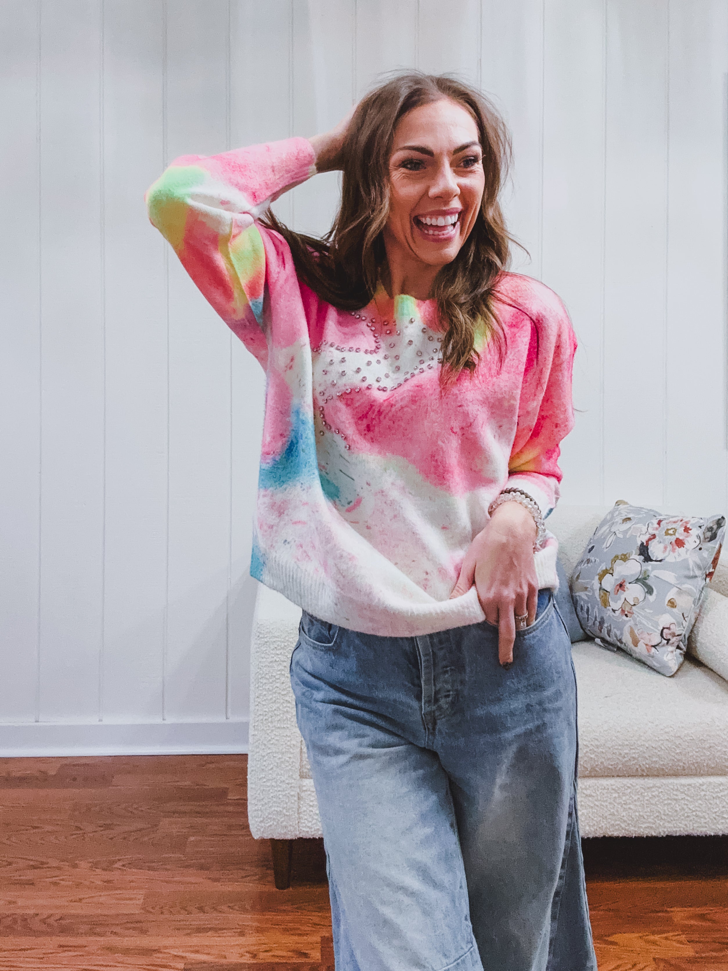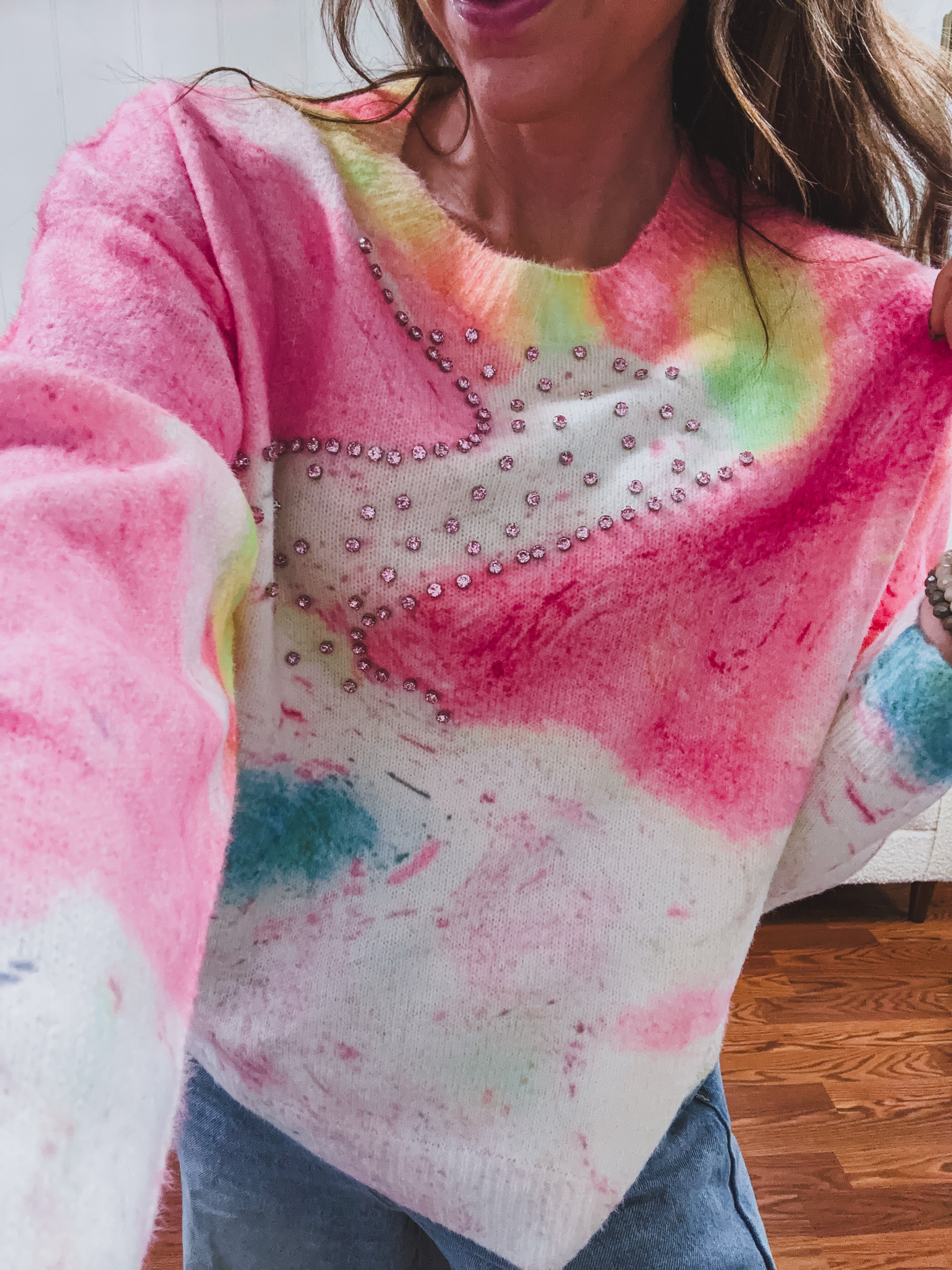 Rock a dreamy blend of soft pastels with this crew neck sweater featuring swirling pink, yellow, and cream tones accented by sparkly pink rhinestones. Perfect for channeling retro-cool energy, it's the fuzzy, fun companion your denim collection has been waiting for—because sometimes you've gotta let loose and embrace the whimsy.