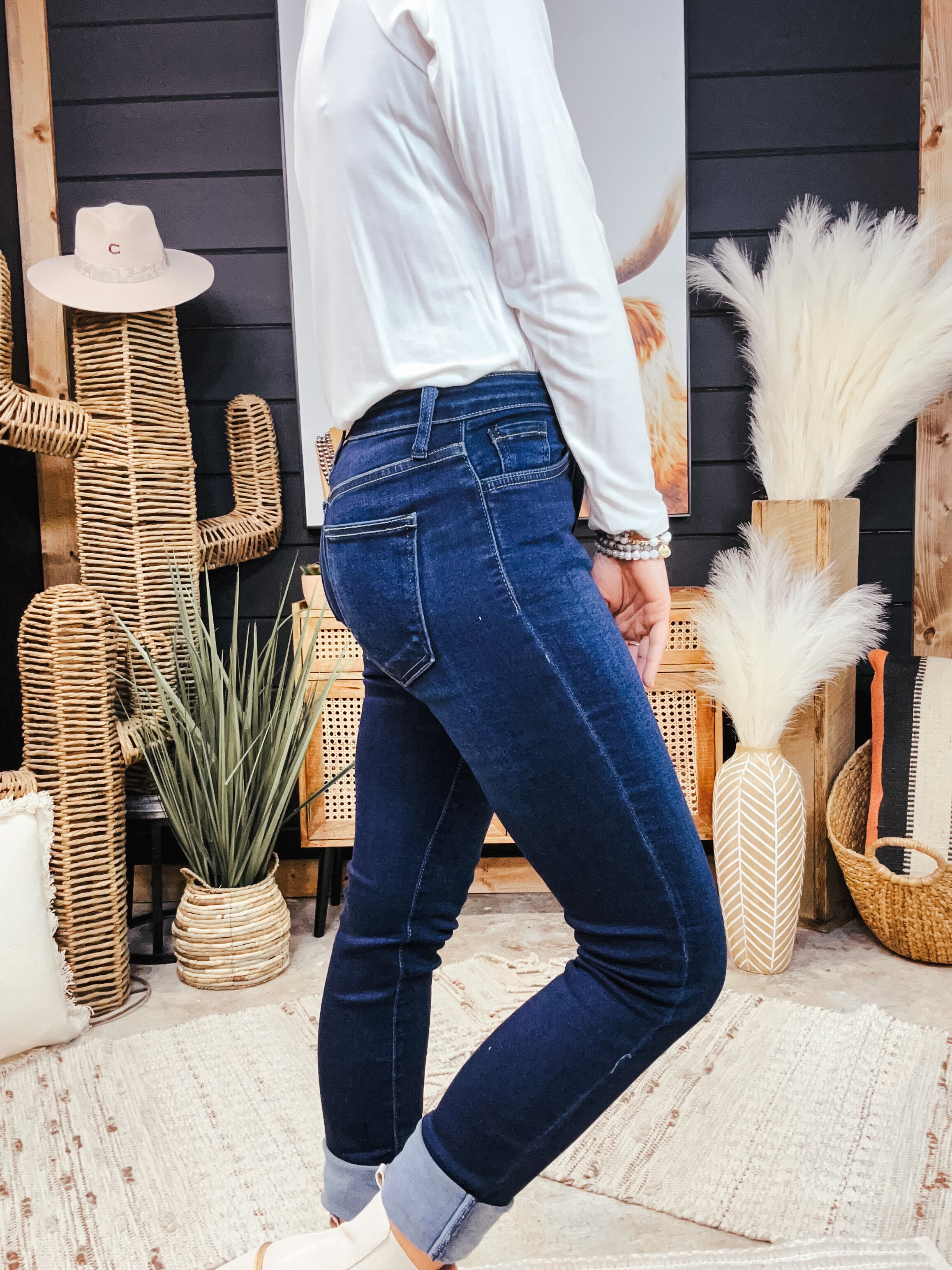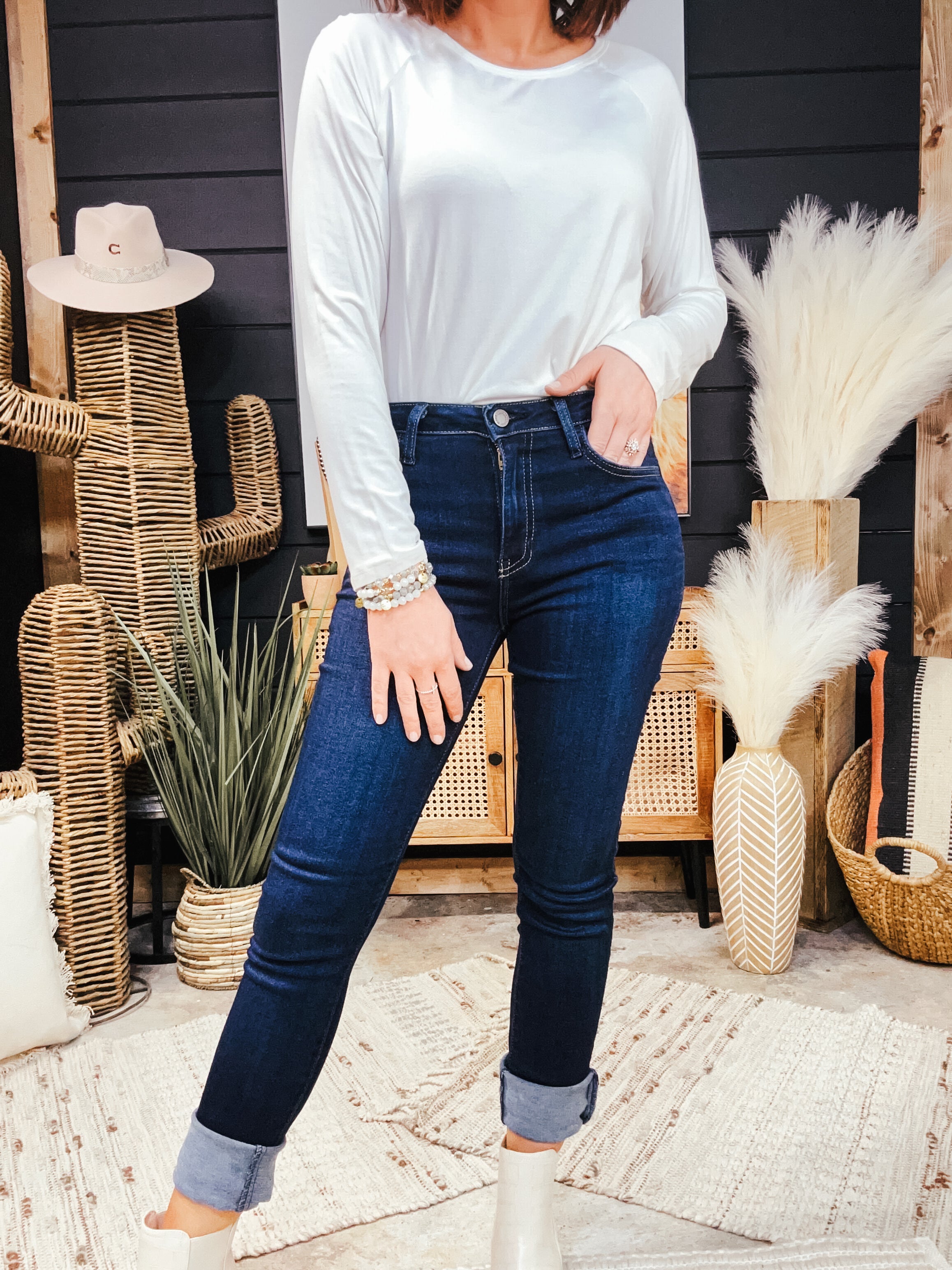 Are you tired of searching for the perfect pair of jeans that fit your long legs? Your search ends here with these Just Black Denim jeans in a stunning dark wash. No distressing, a slim, straight leg, and the option to cuff make these jeans a must-have, not to mention the amazing stretch and trendy style.