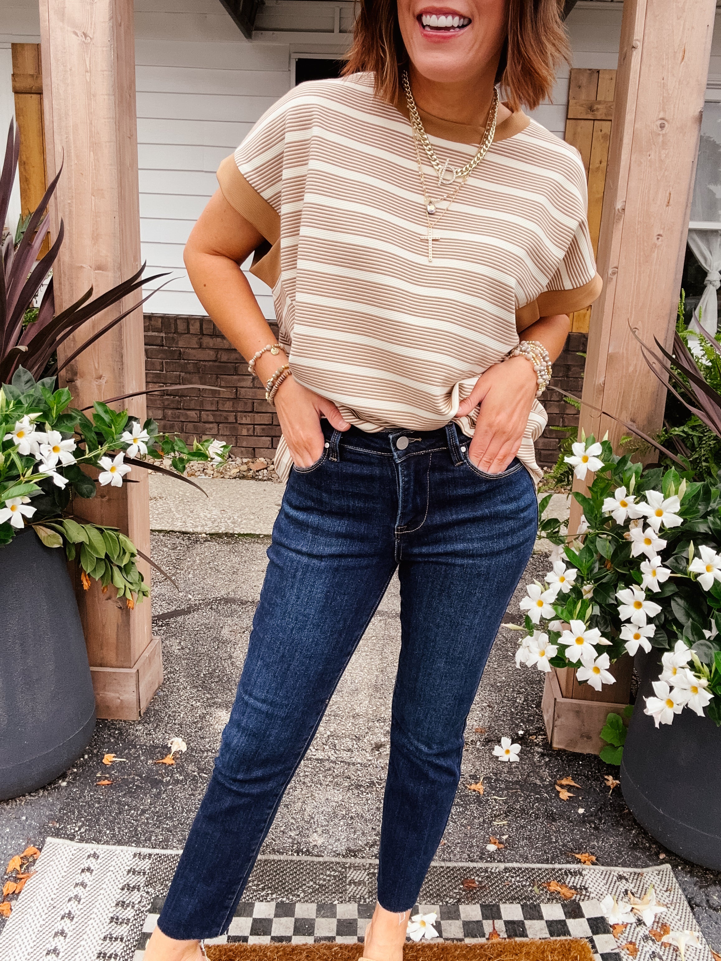 Unleash your fashionista side in this flawless pair of dark wash denim! With just the right amount of stretch and a customizable raw hem, these non-distressed jeans will elevate your fall wardrobe. Don't miss out on the must-have denim of the season!