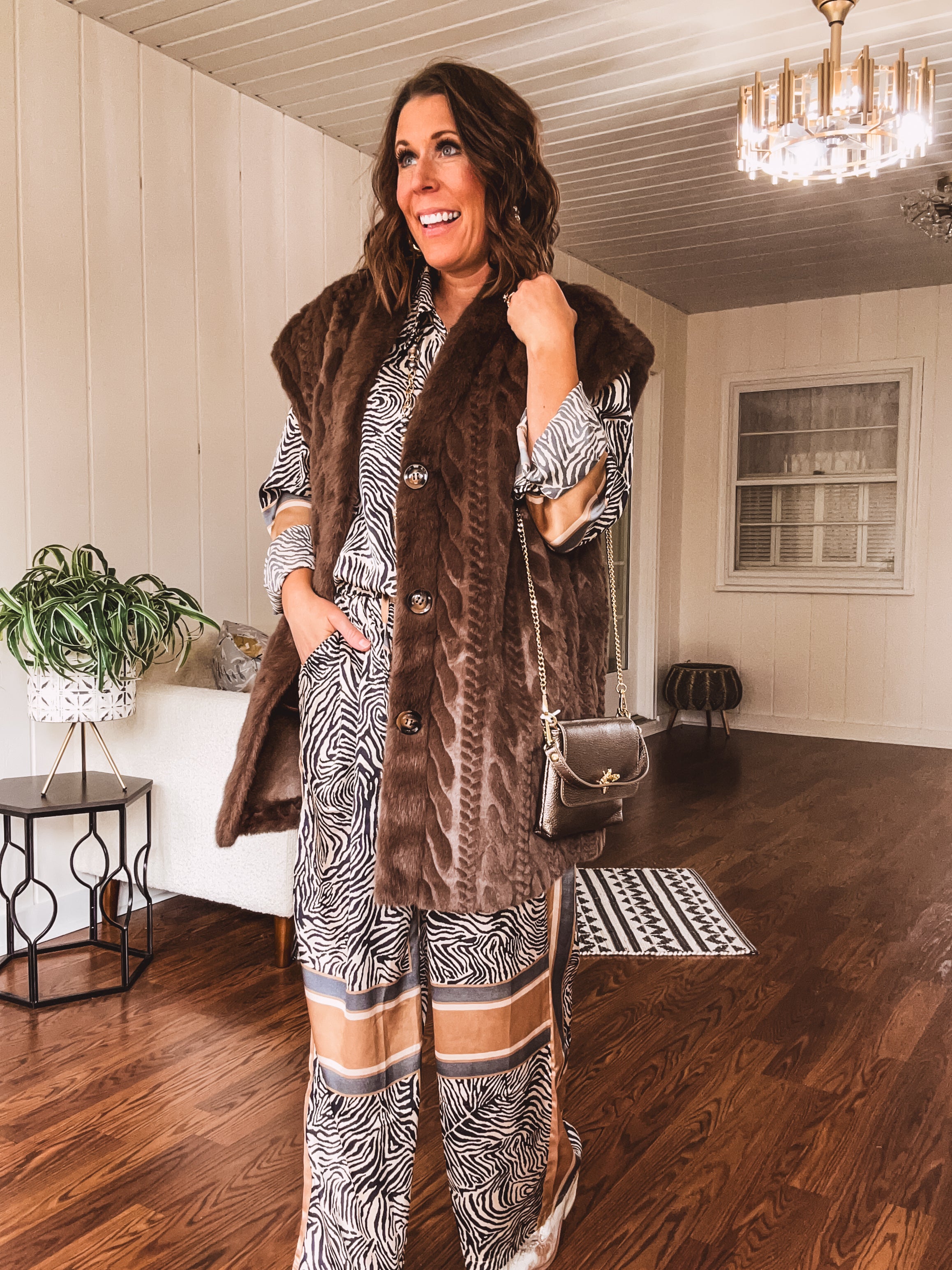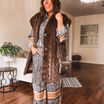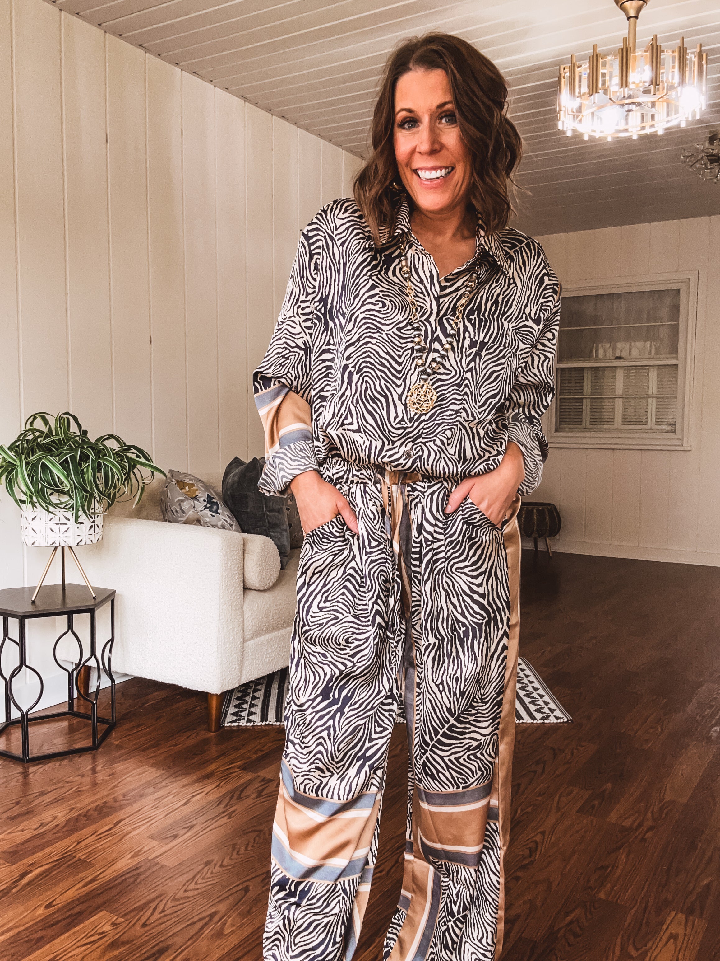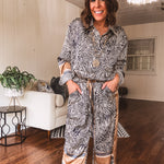 Embrace your bold side in this button up blouse that blends comfort with serious style. The silky, flowing fabric moves beautifully, while the striking zebra print—accented with warm tan and ivory trim—makes an instant statement. Perfect for a night out, casual brunch, or relaxed days at home, this top delivers effortless versatility. Mix and match or go full-on fierce by pairing it with the coordinating wide leg pants for a complete look that says you're ready for anything.