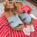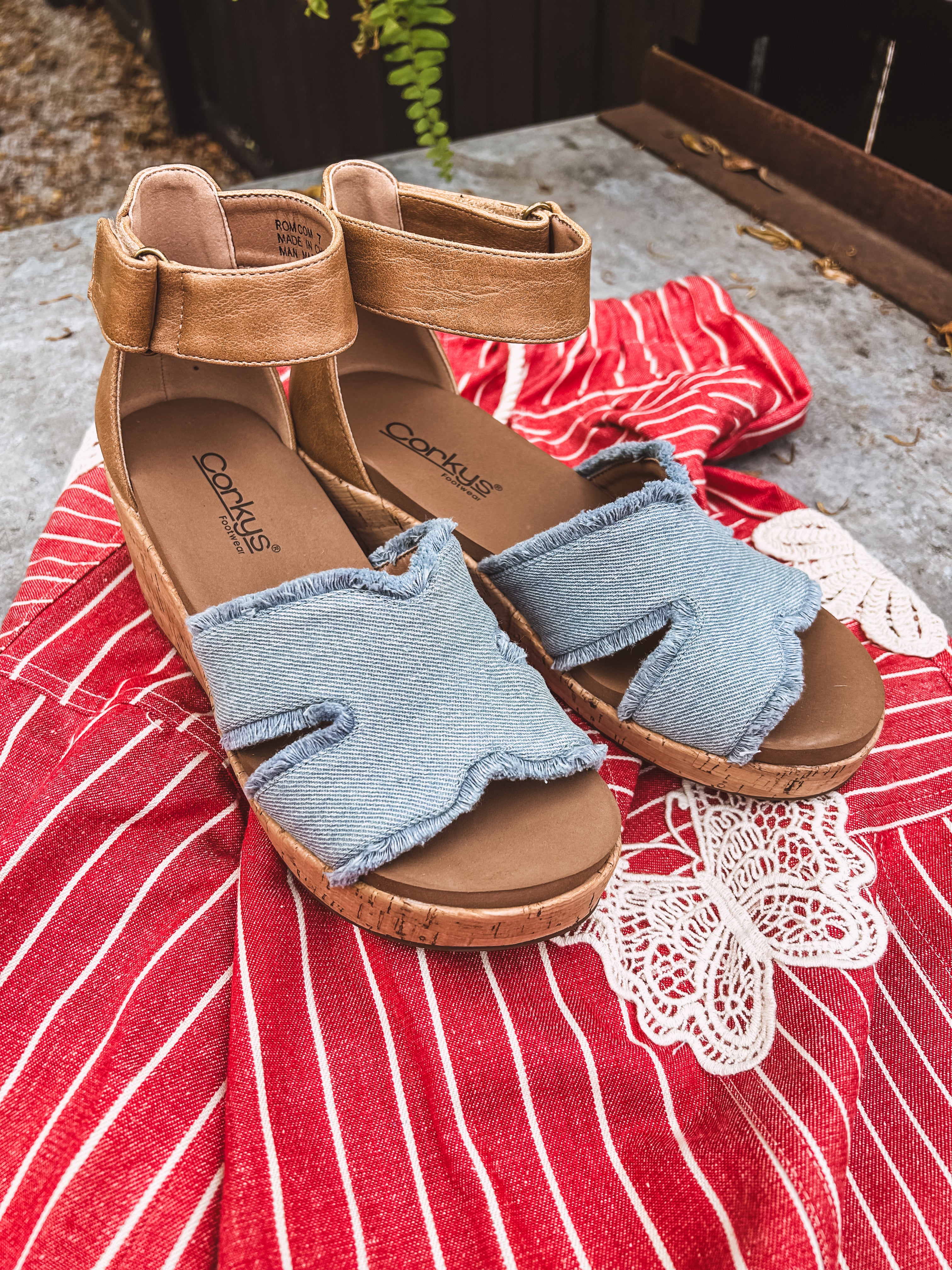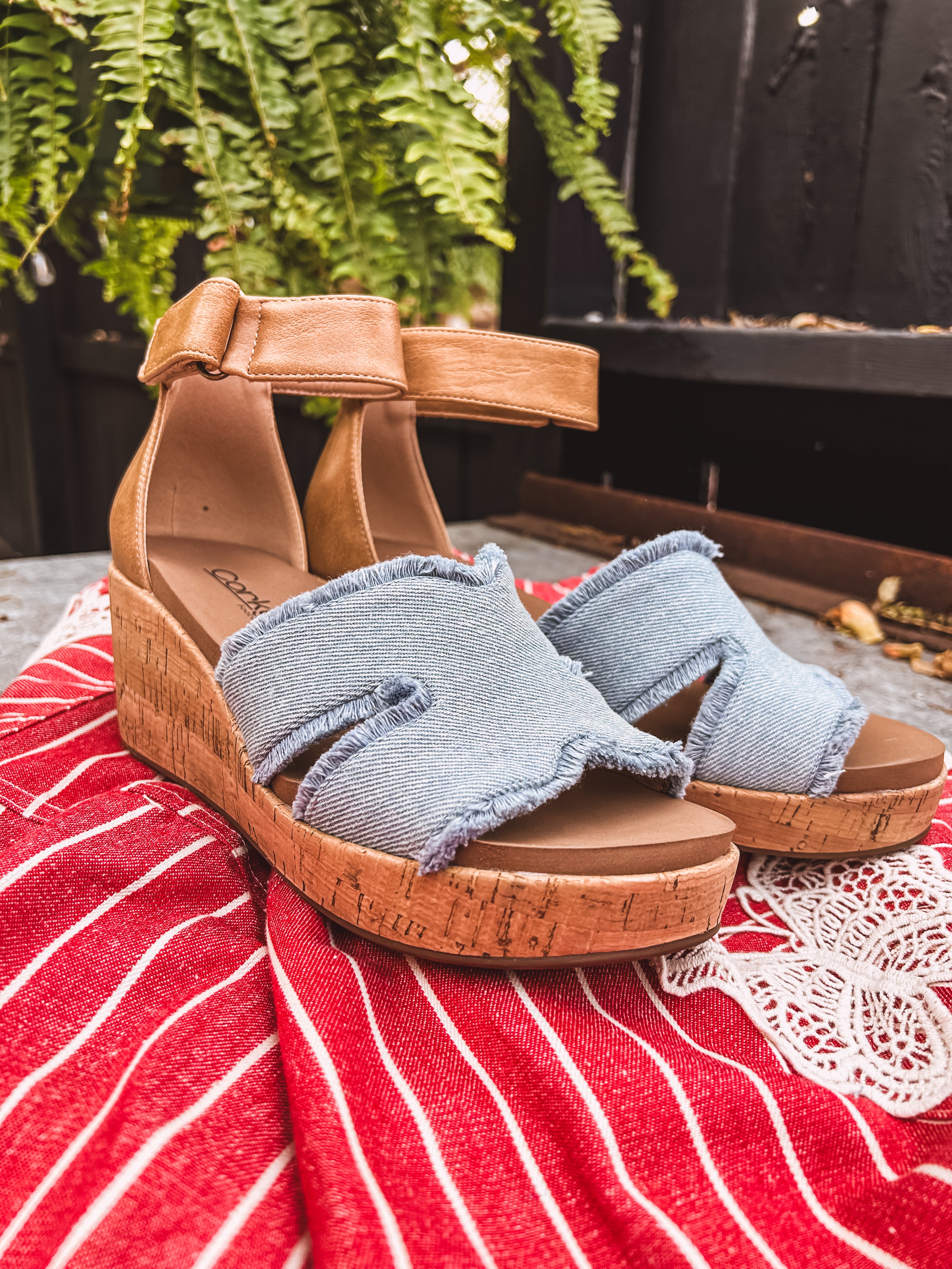 Slip into these sassy wedges with Corky's signature foam footbed and cork sole! The Rom Com in Blue Denim rocks a leather ankle strap with velcro for easy-peasy adjustments and maximum comfort. The denim upper creates a fun combo that adds pizzazz to any outfit - pair with your favorite dress or jeans for a look that screams confidence and style!