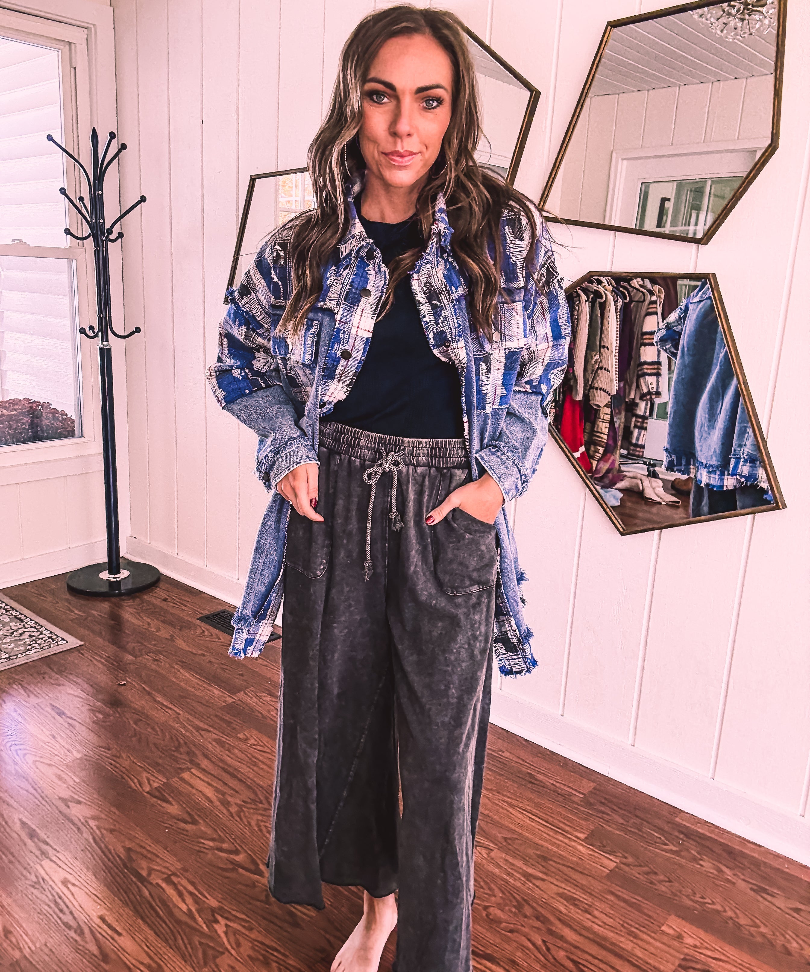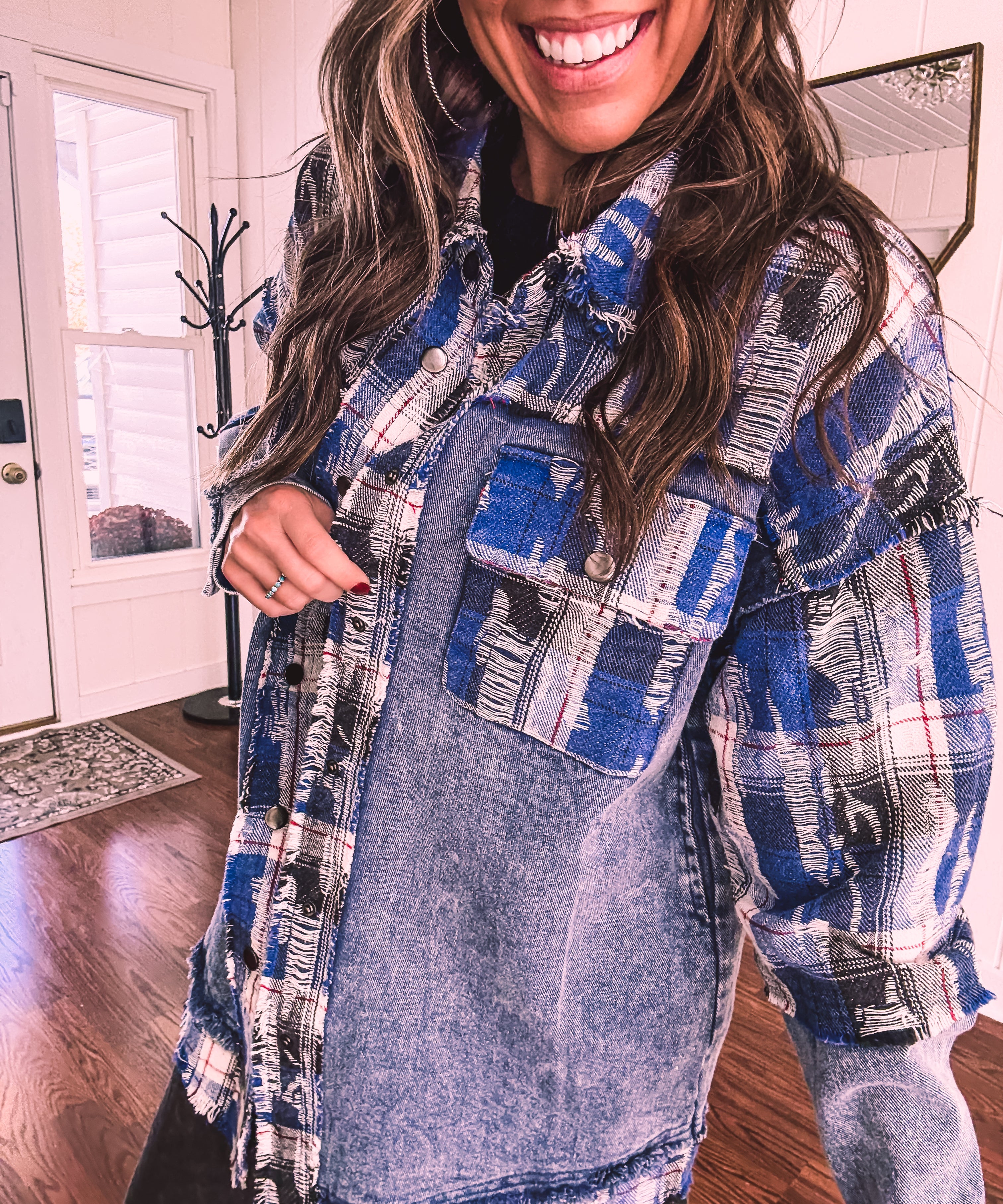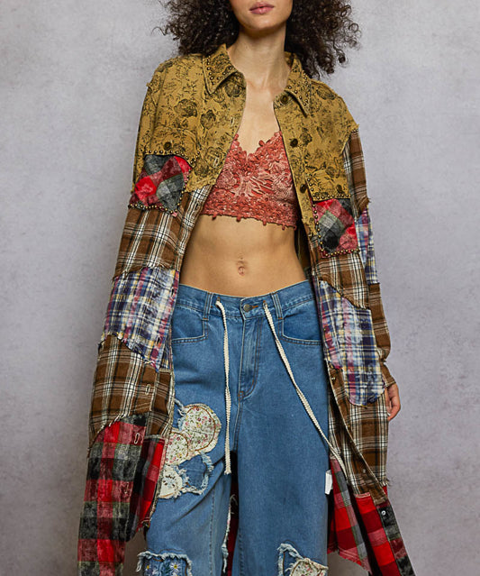 Red Button it Up Plaid Denim Mix Patchwork Shacket