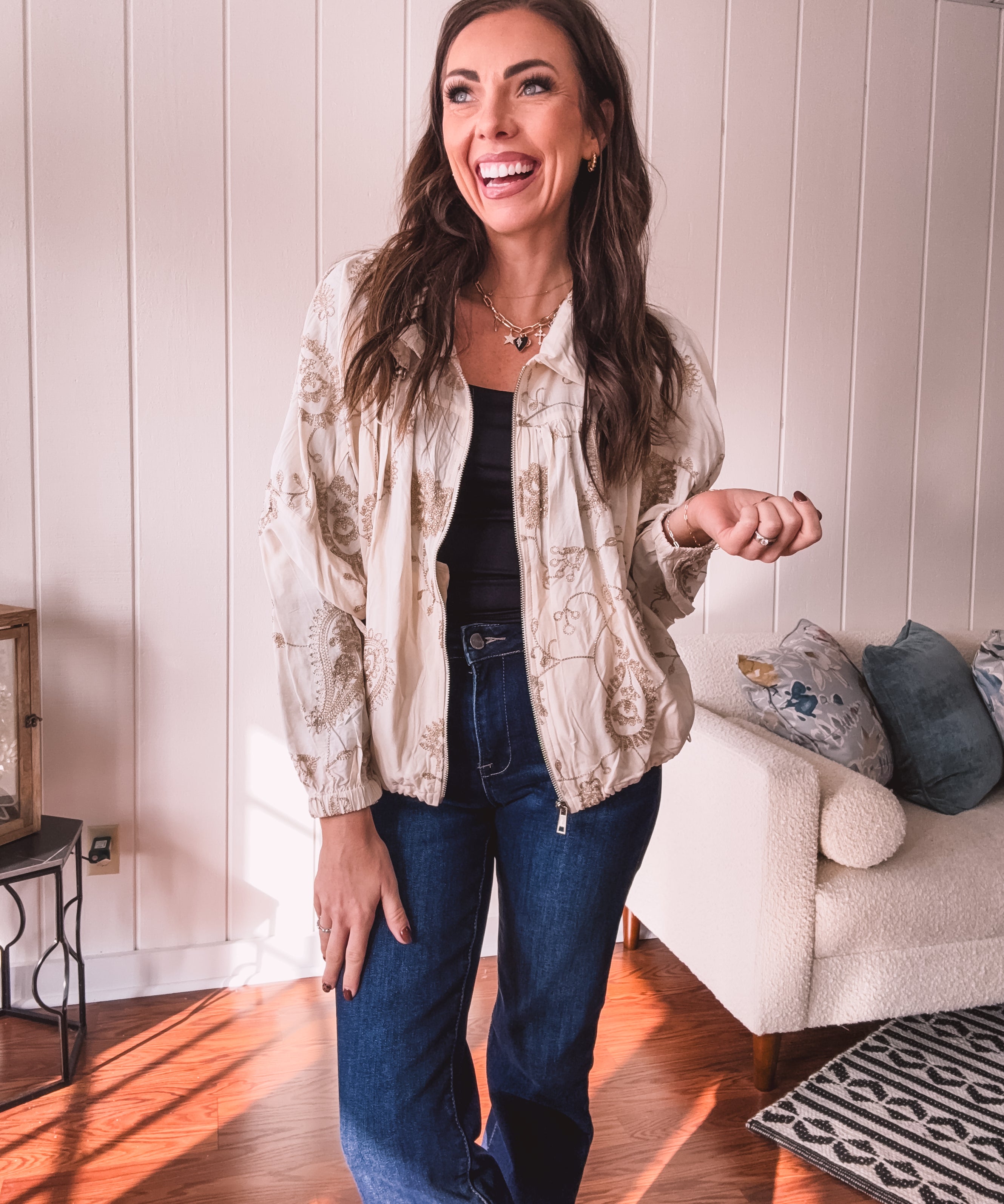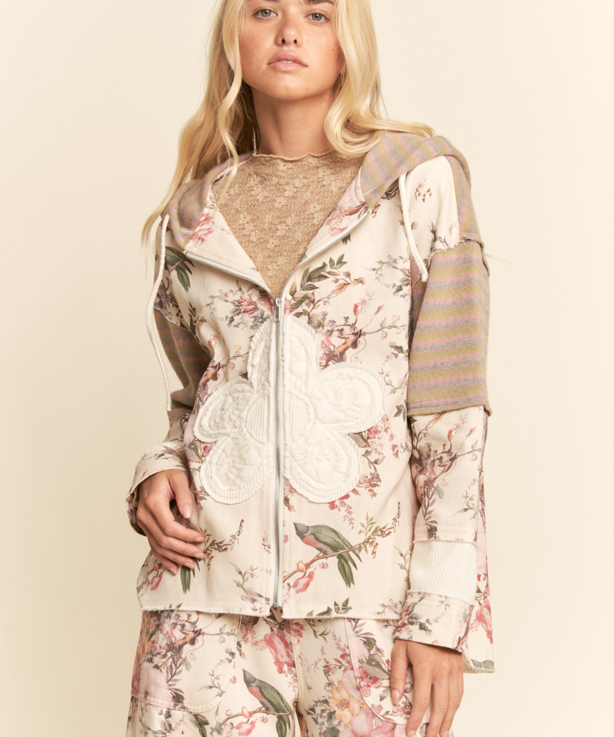 Cream Boho Elegance Floral Zip Jacket