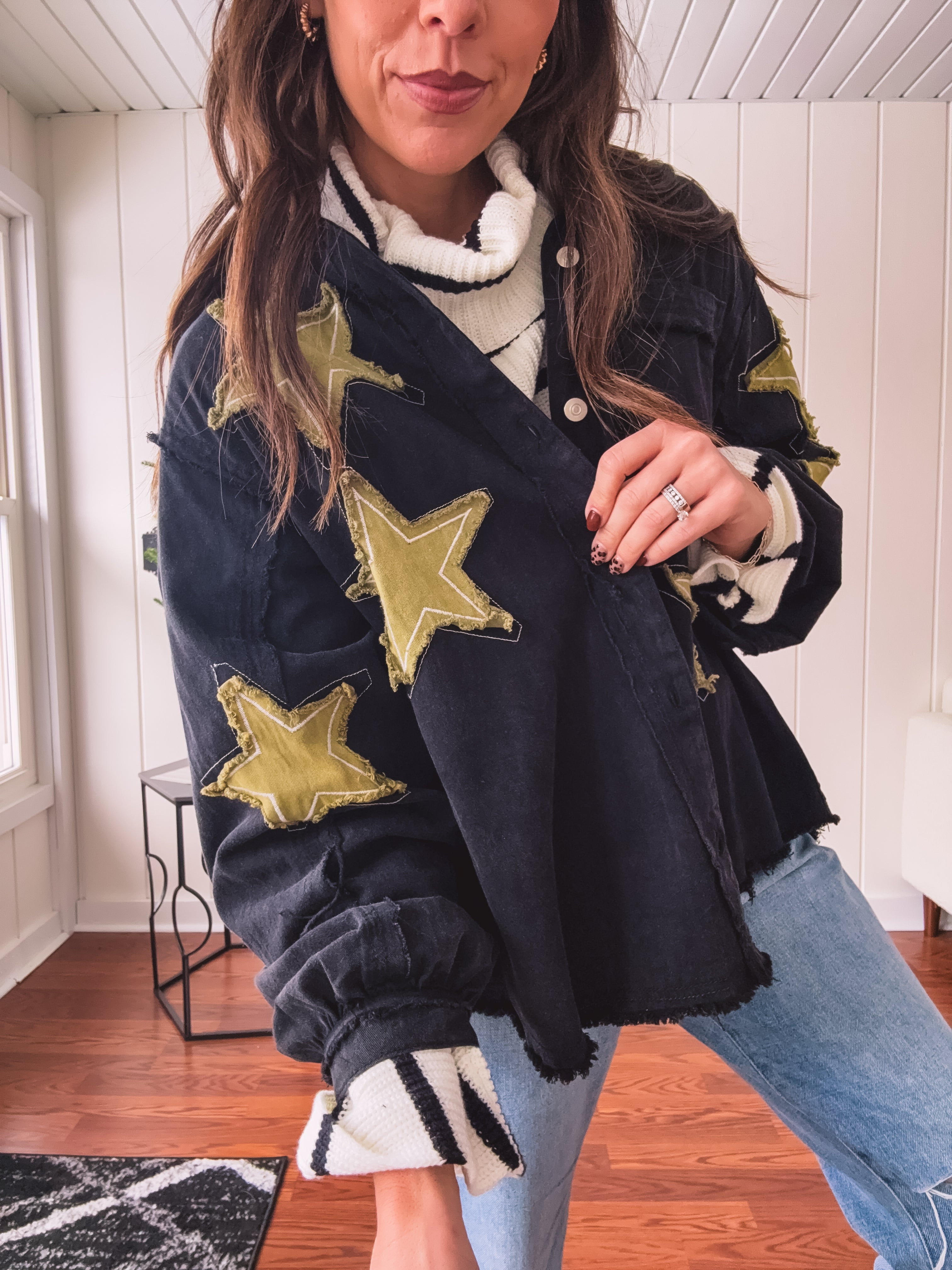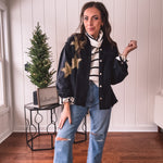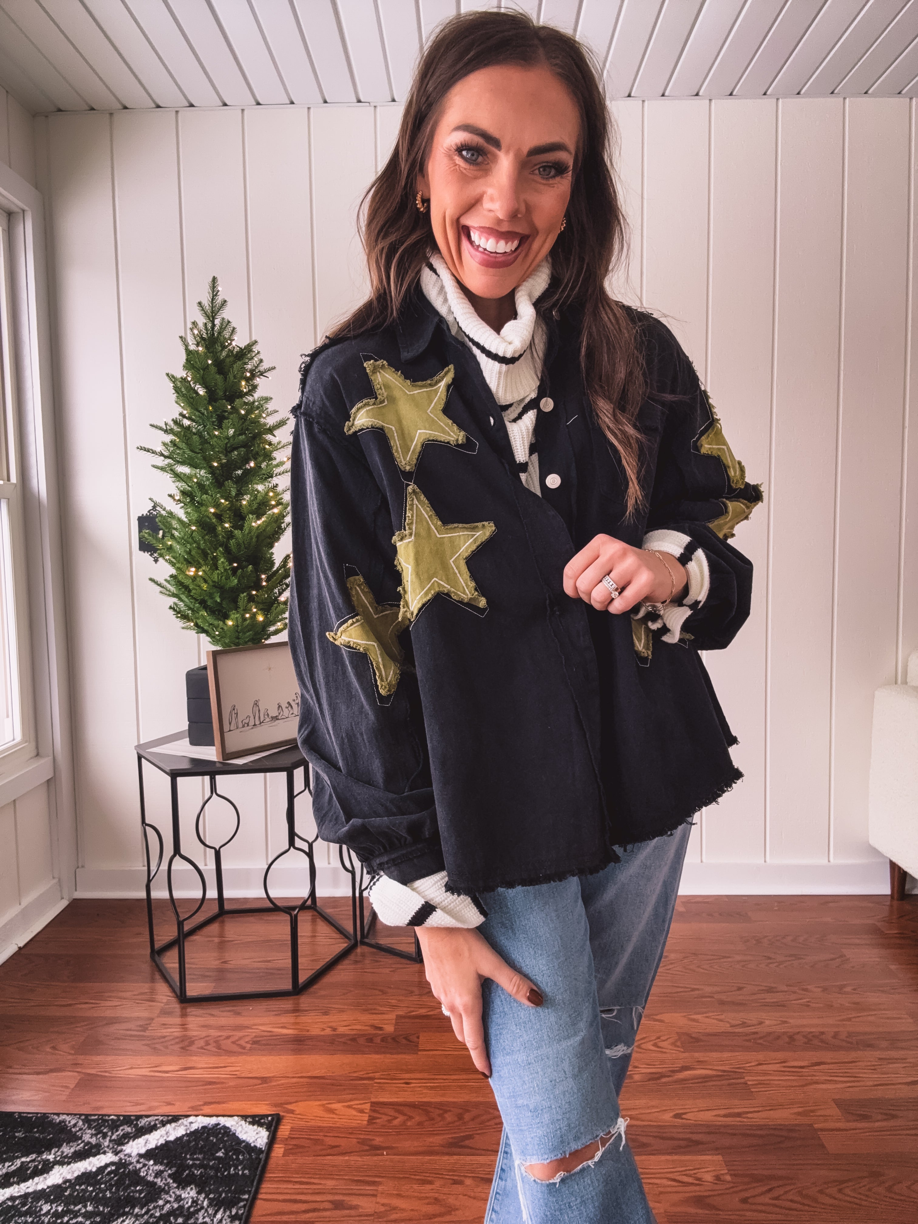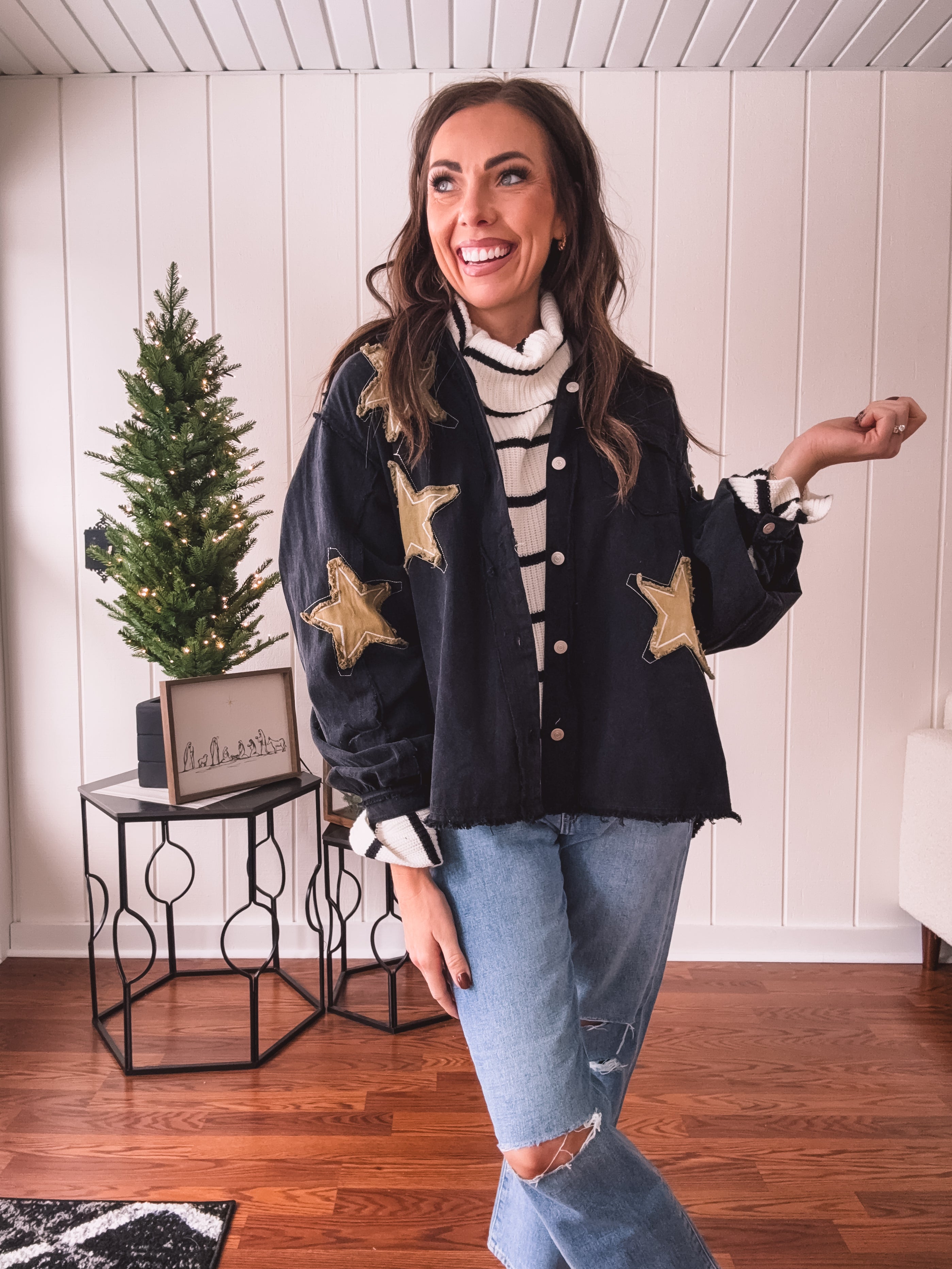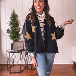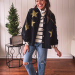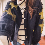 The Black + Gold Star Patchwork Jacket brings that festive sparkle to your everyday rotation. Mix metallic gold stars with sleek black for a look that's fancy enough for celebrations but cool enough to wear year-round. Layer it over your go-to basics and instantly elevate any outfit with a touch of shimmer and personality. Who says holiday vibes have to wait for December?