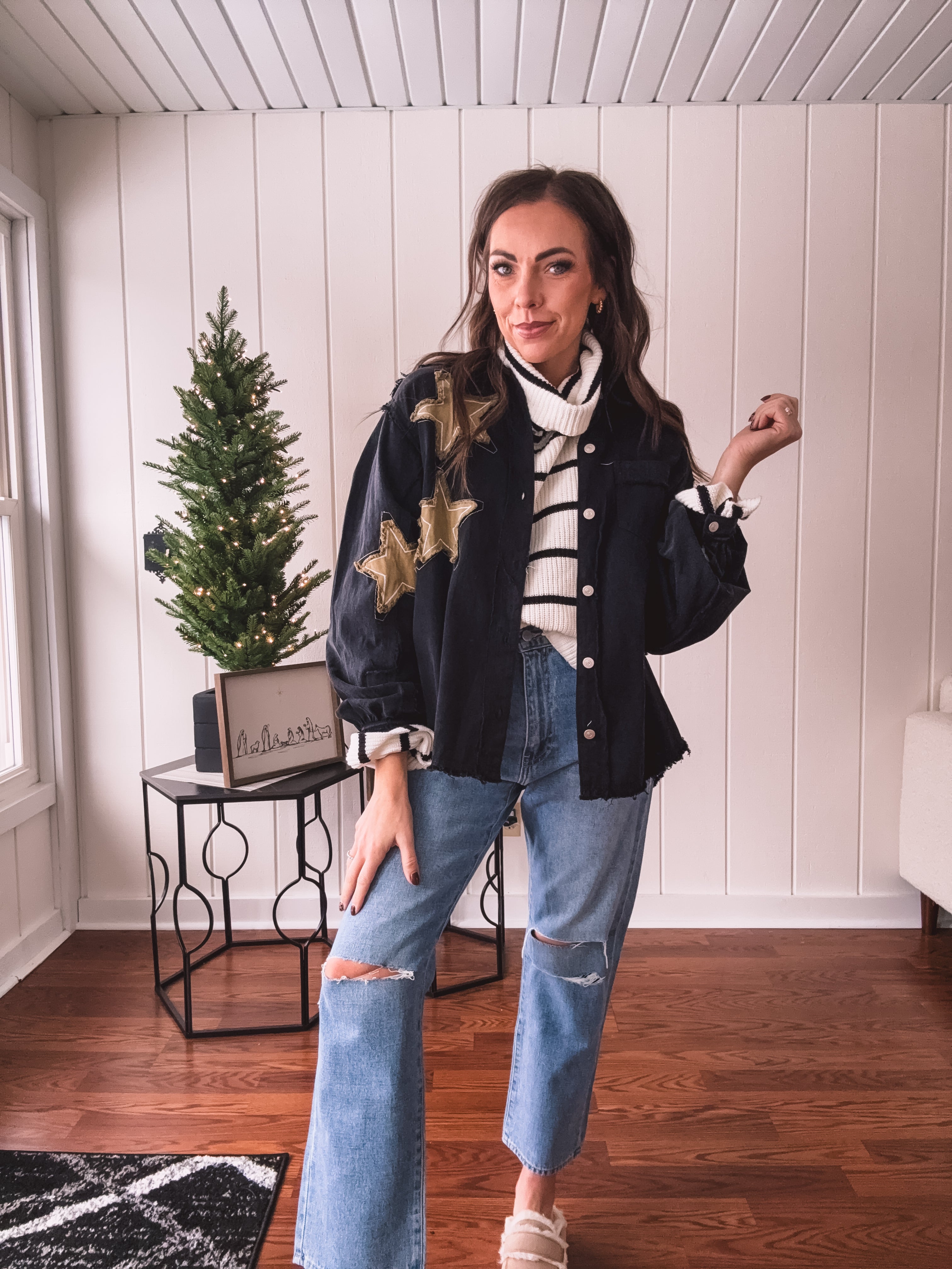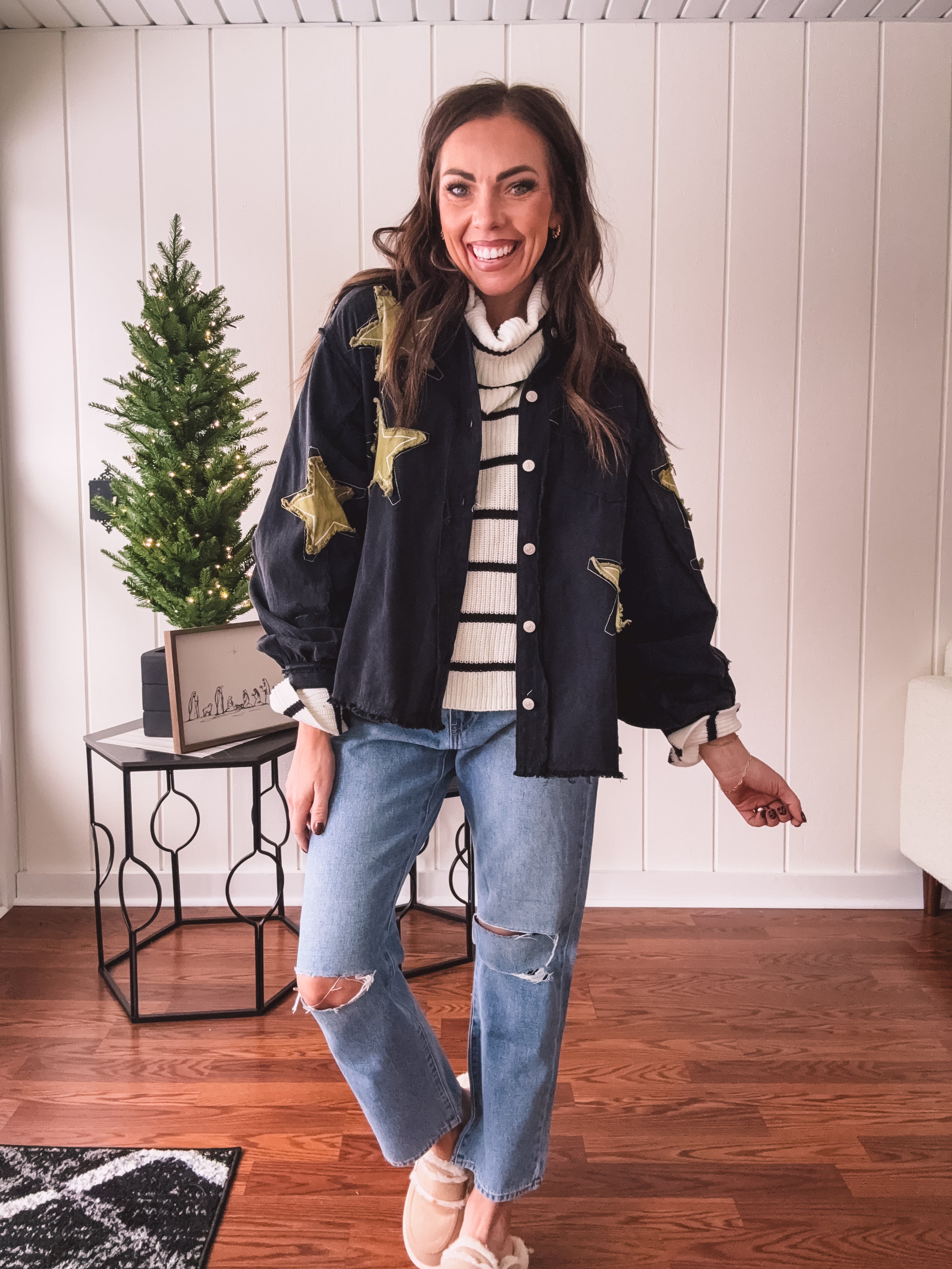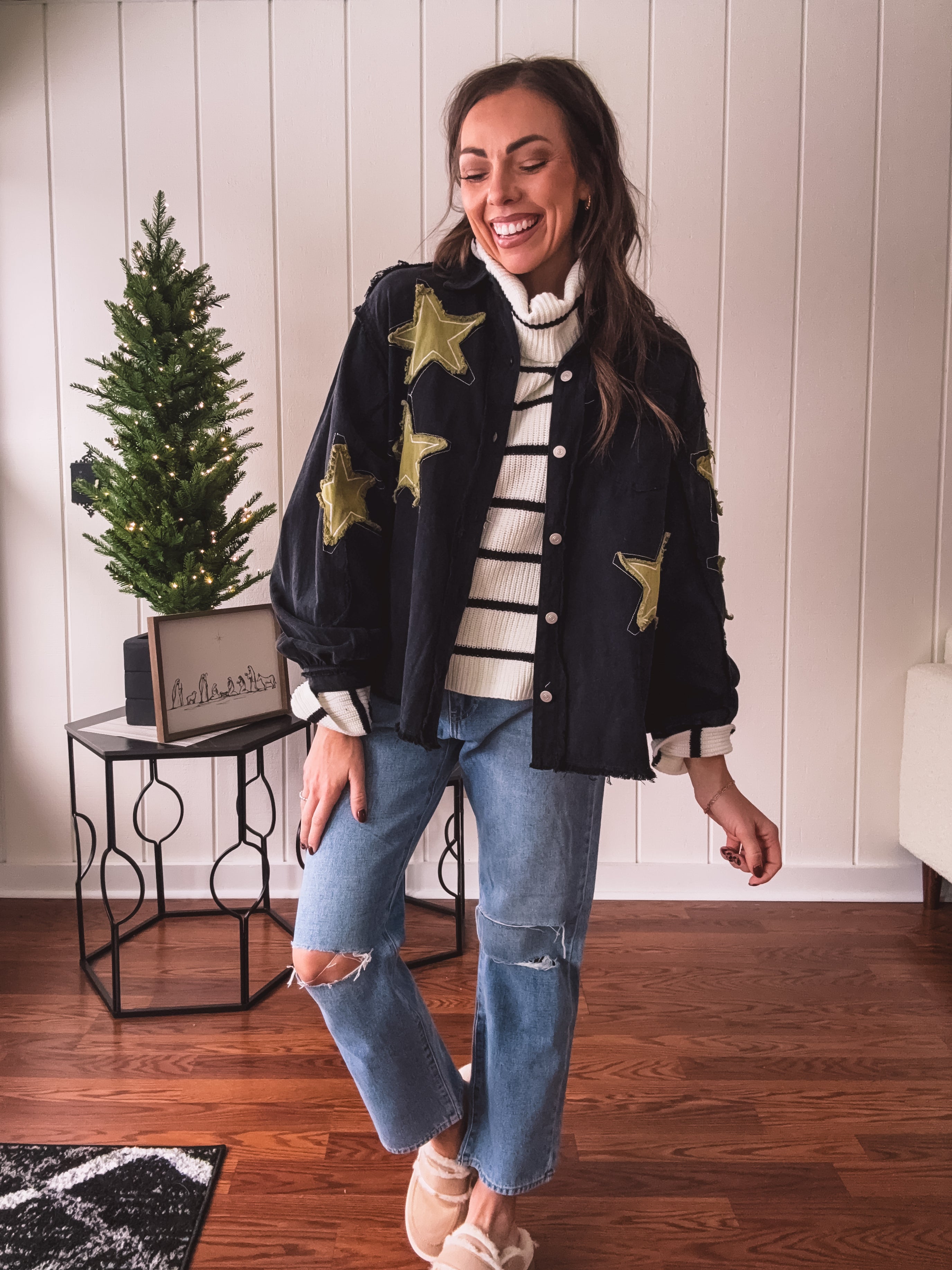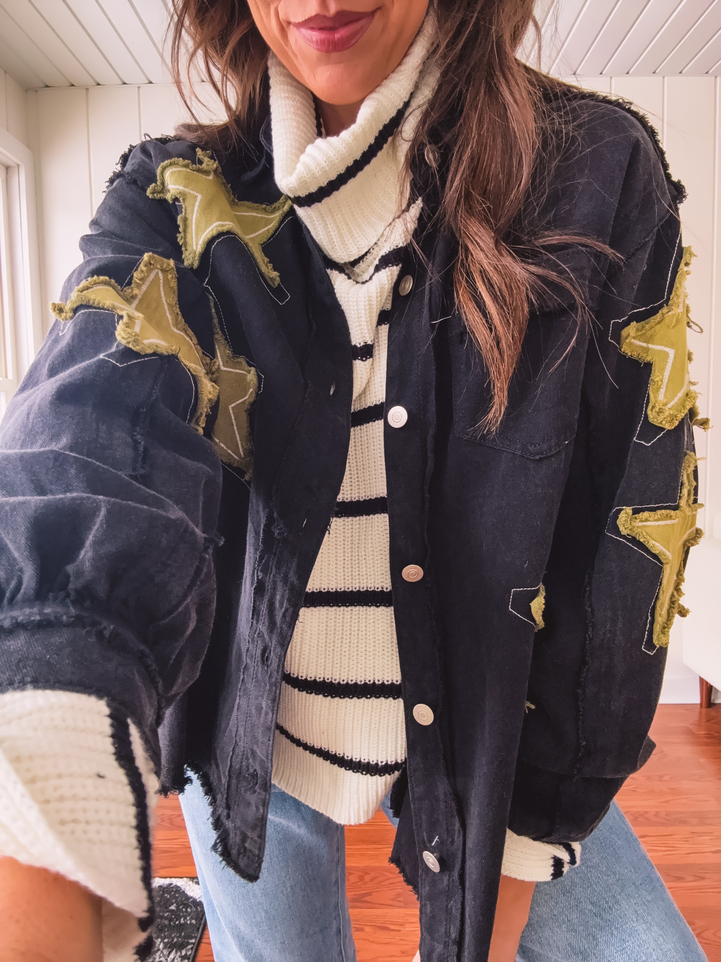 The Black + Gold Star Patchwork Jacket brings that festive sparkle to your everyday rotation. Mix metallic gold stars with sleek black for a look that's fancy enough for celebrations but cool enough to wear year-round. Layer it over your go-to basics and instantly elevate any outfit with a touch of shimmer and personality. Who says holiday vibes have to wait for December?