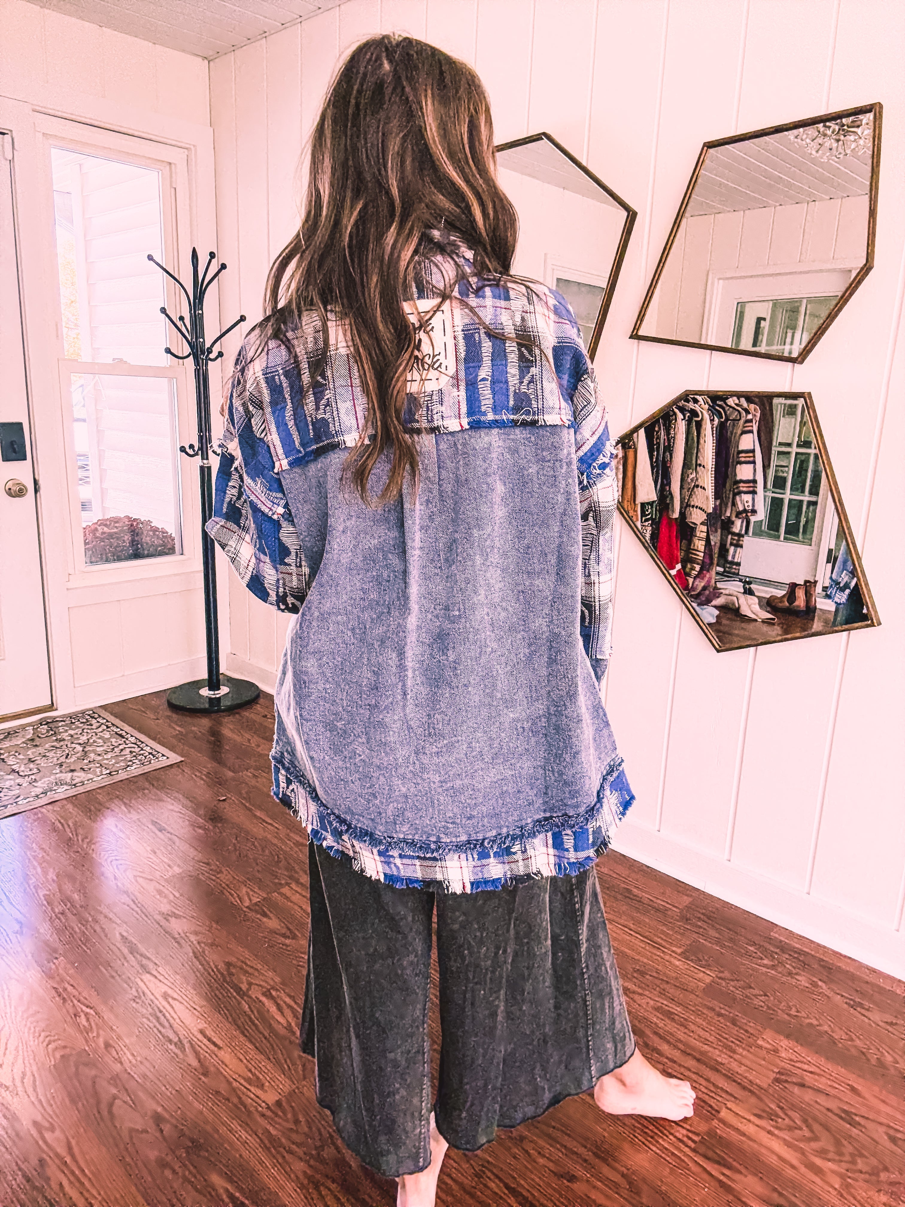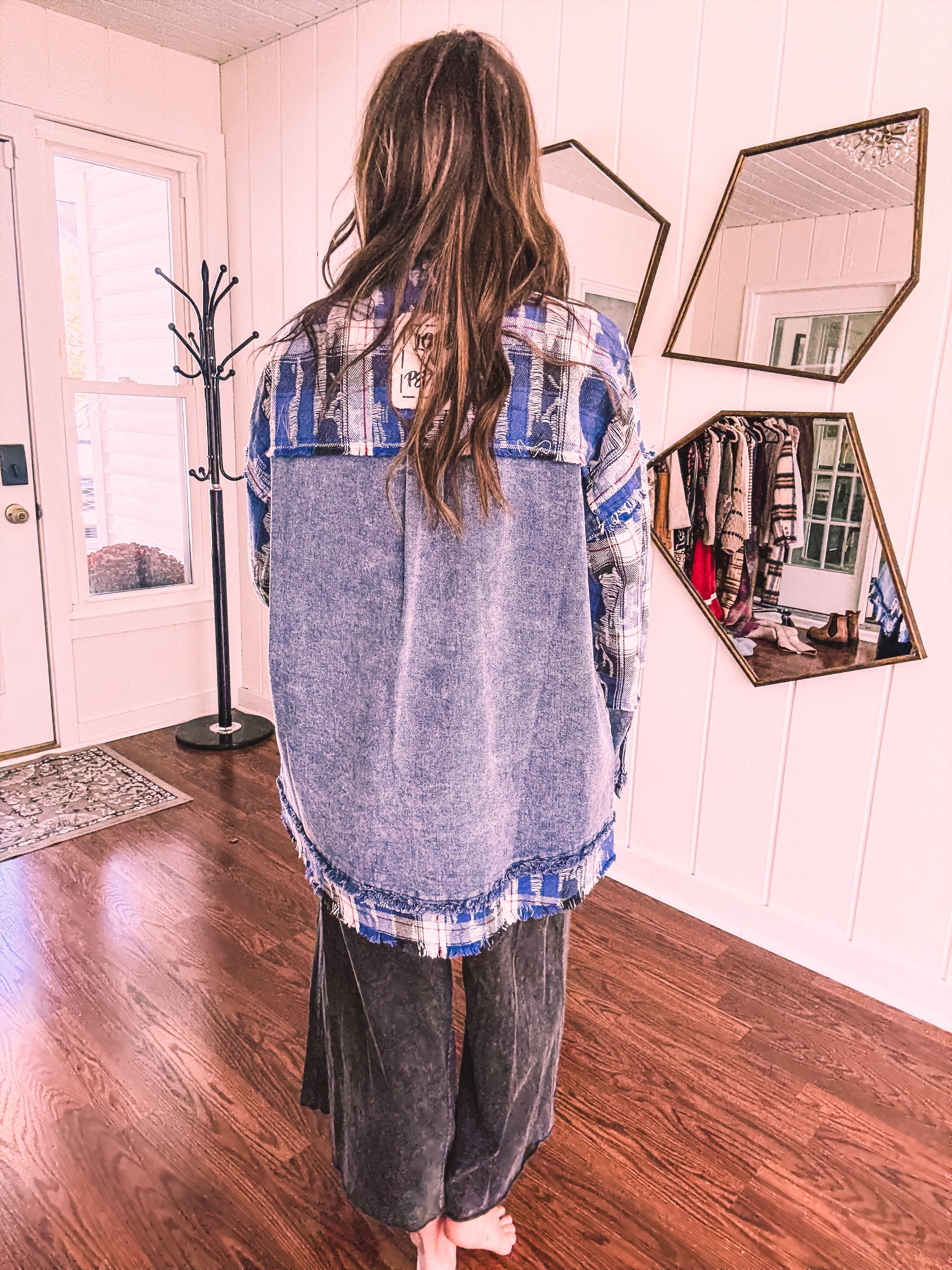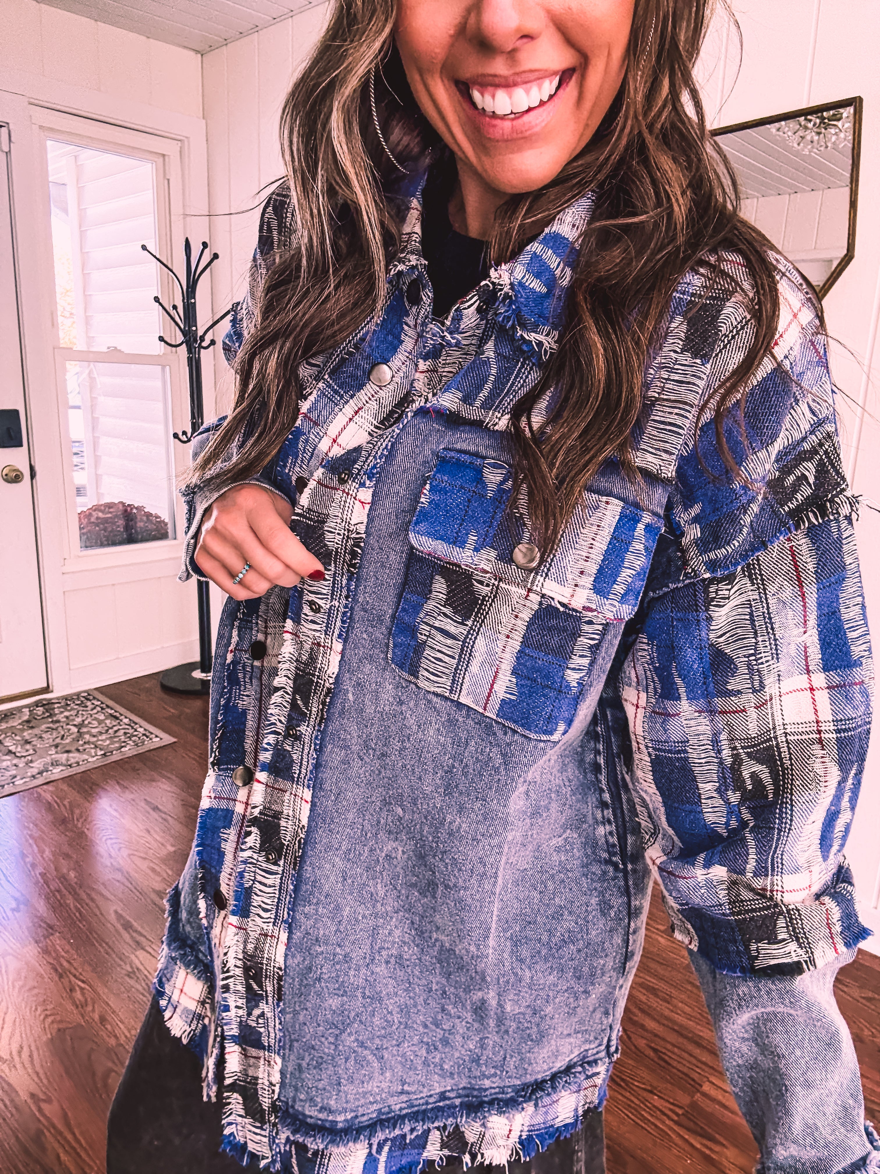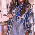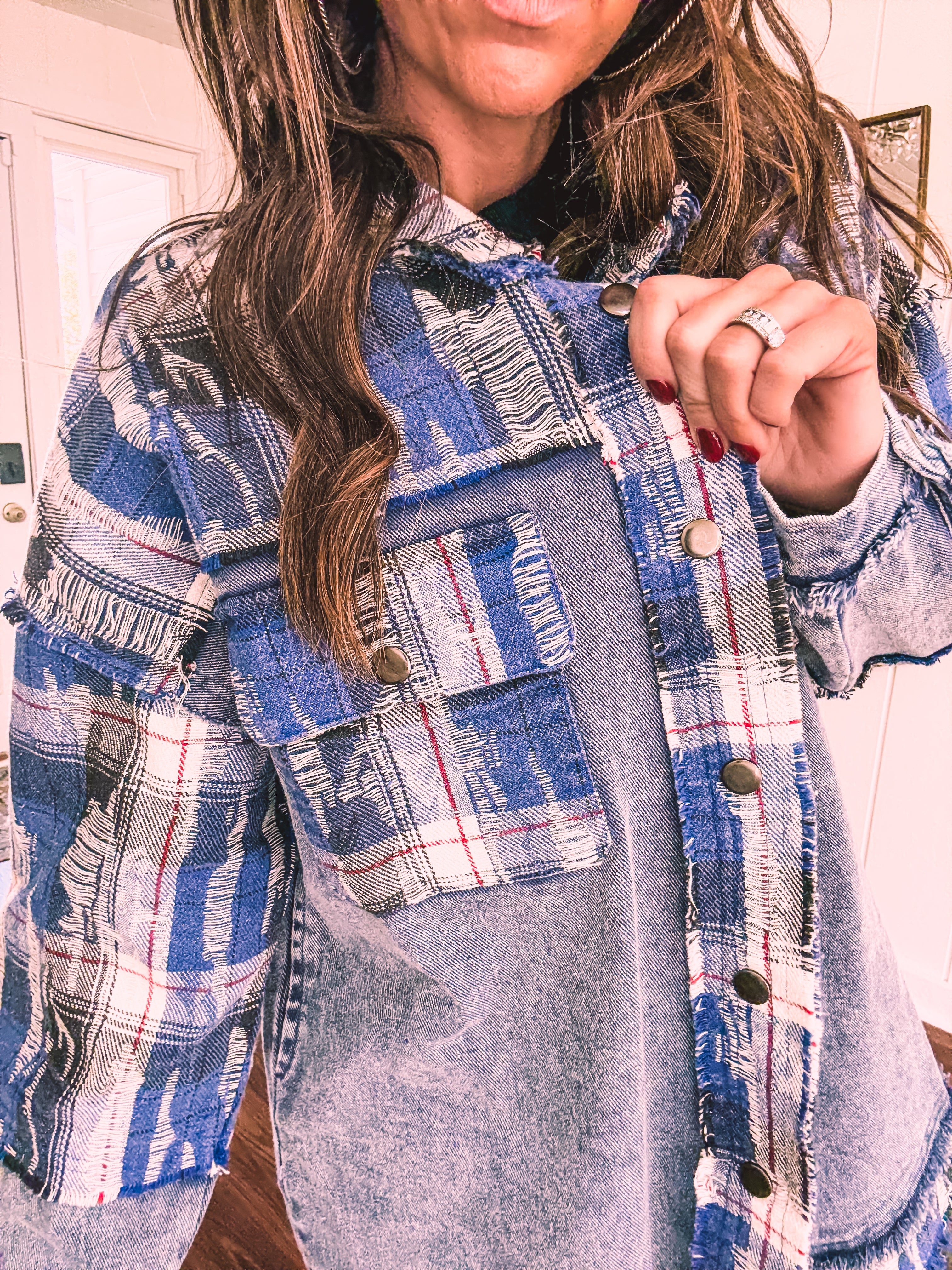 Rock a fresh take on timeless denim with this playful shacket that blends medium-wash denim with eye-catching blue, black, and red plaid detailing. Snap closures and front pockets keep things practical, while side pockets add extra convenience. The length and relaxed cut makes it perfect for throwing over your favorite tees, sweaters, or mesh tops—whether you're going for cozy vibes or bold graphic statements. Layer it up and let your style shine through.