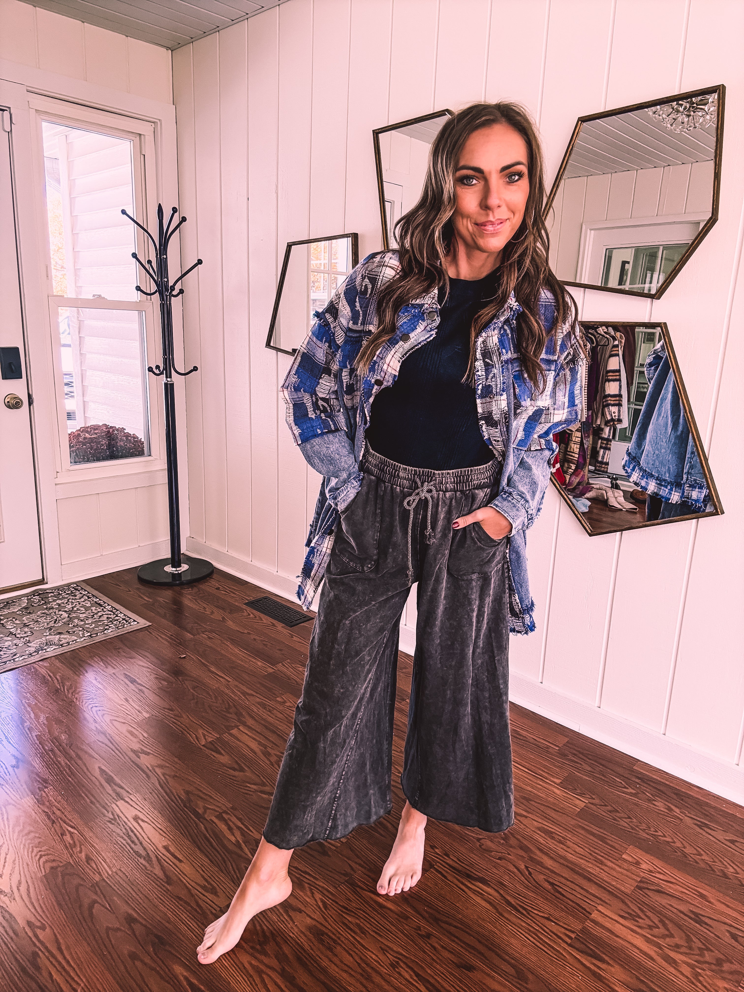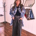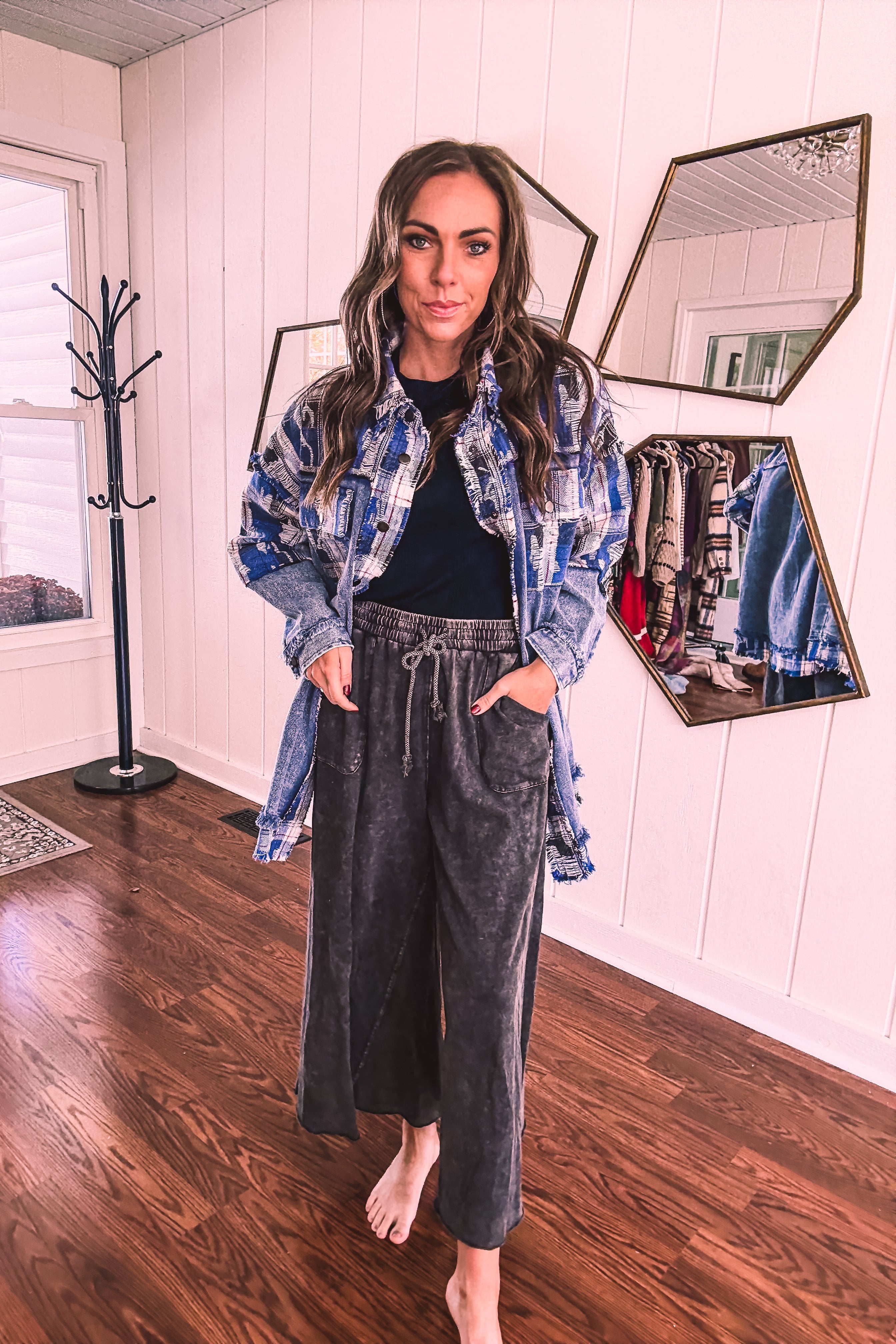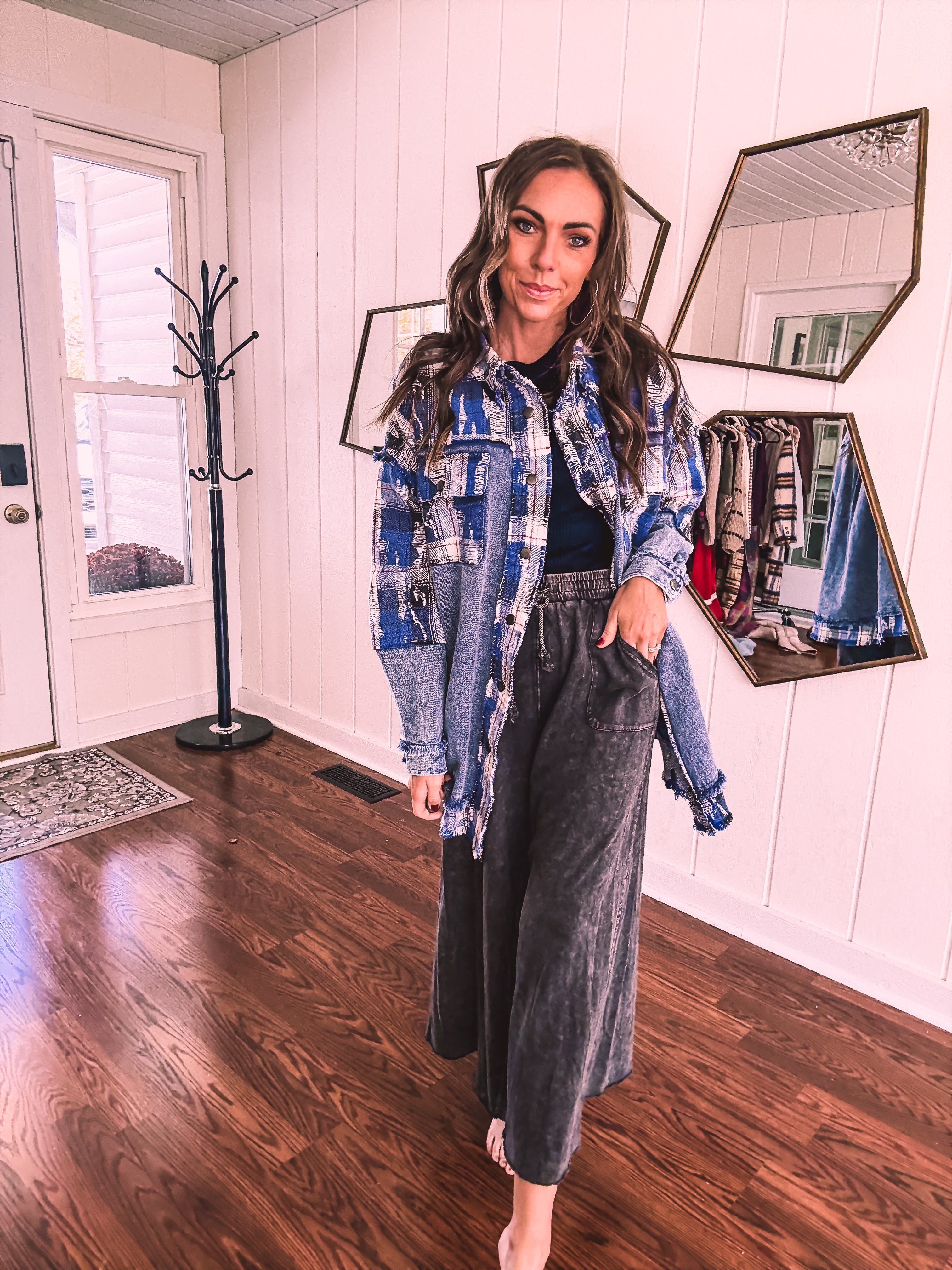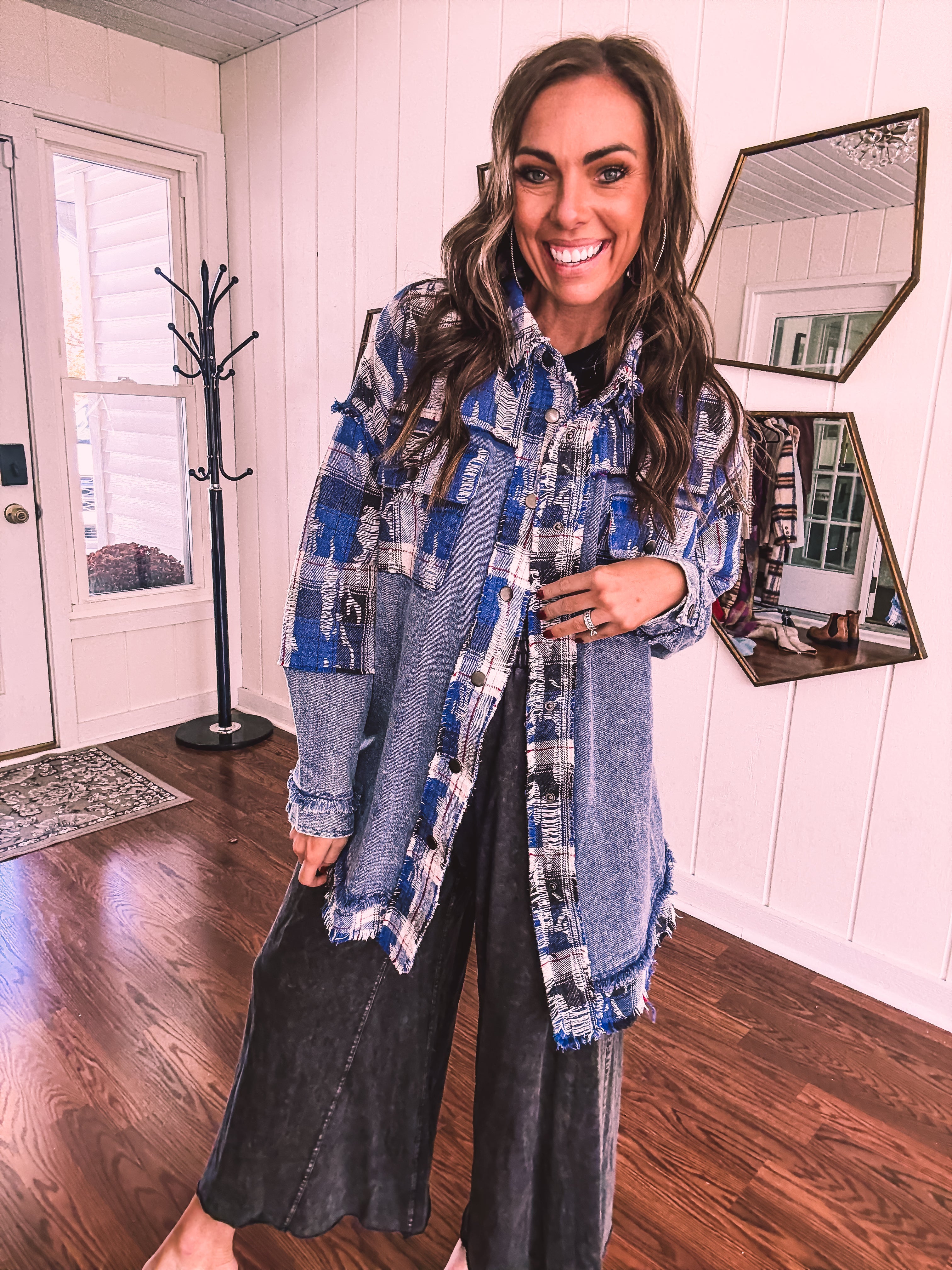 Rock a fresh take on timeless denim with this playful shacket that blends medium-wash denim with eye-catching blue, black, and red plaid detailing. Snap closures and front pockets keep things practical, while side pockets add extra convenience. The length and relaxed cut makes it perfect for throwing over your favorite tees, sweaters, or mesh tops—whether you're going for cozy vibes or bold graphic statements. Layer it up and let your style shine through.