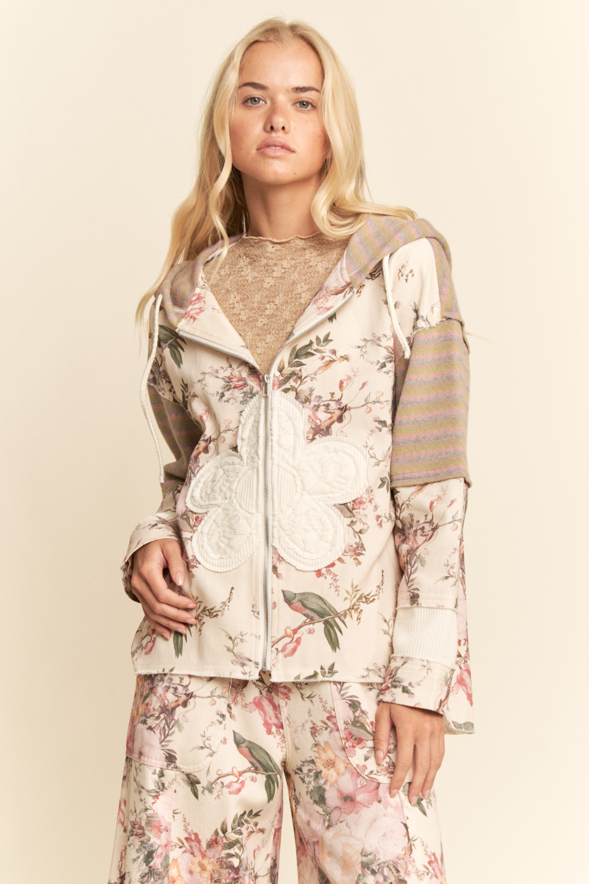 This laid-back zip jacket blends cream and pink florals with earthy ethnic-inspired knit and cozy waffle textures for that effortless boho vibe. Complete with a hood and crochet drawstring details, it's your go-to piece for casual days with a touch of whimsical charm.