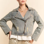 Rock an effortlessly cool vibe with this denim jacket that blends vintage charm with modern edge. The rigid fabric holds its shape beautifully, while subtle distressing and scattered rhinestones add just the right amount of sparkle and attitude. An asymmetrical zipper and relaxed open collar complete the rebellious look. Throw it over jeans, a skirt, or trousers to instantly elevate your everyday style with personality and pizzazz.