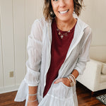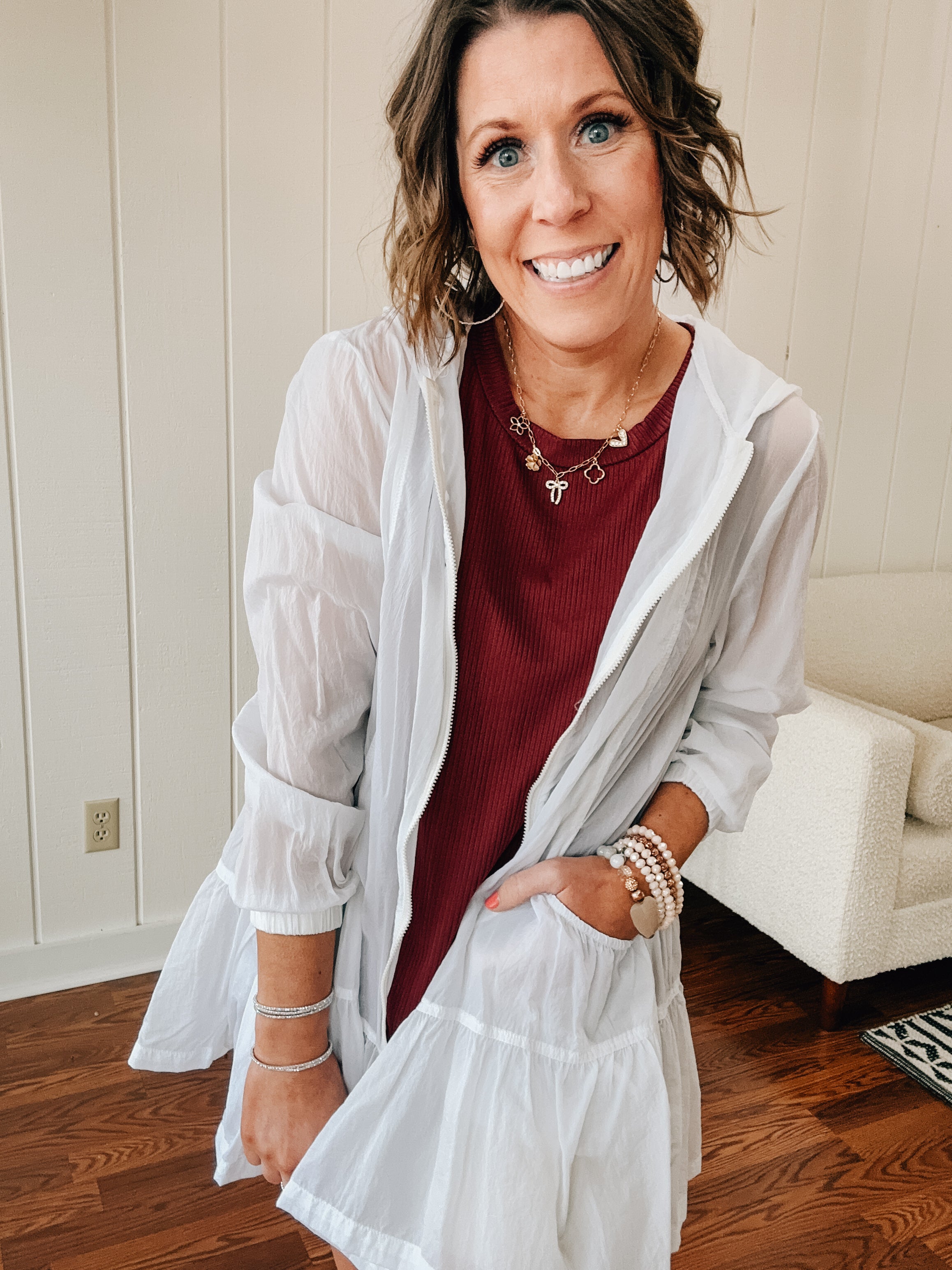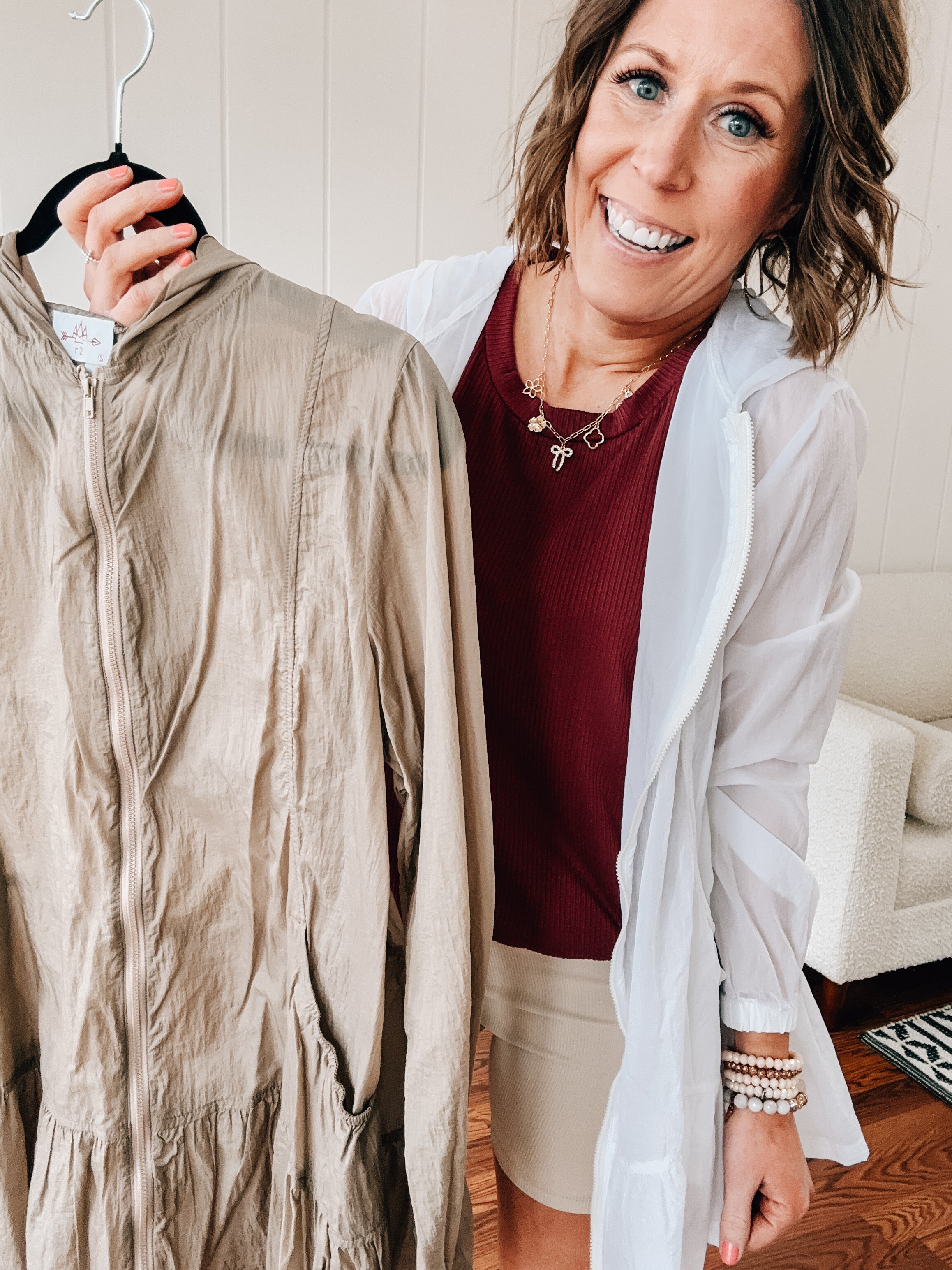 The perfect lightweight rain jacket for those rainy game days, nature hikes or shopping trips! With an ideal length, hood, elastic cuffs and flirty, flutter hem, this zip up jacket belongs in your closet!
