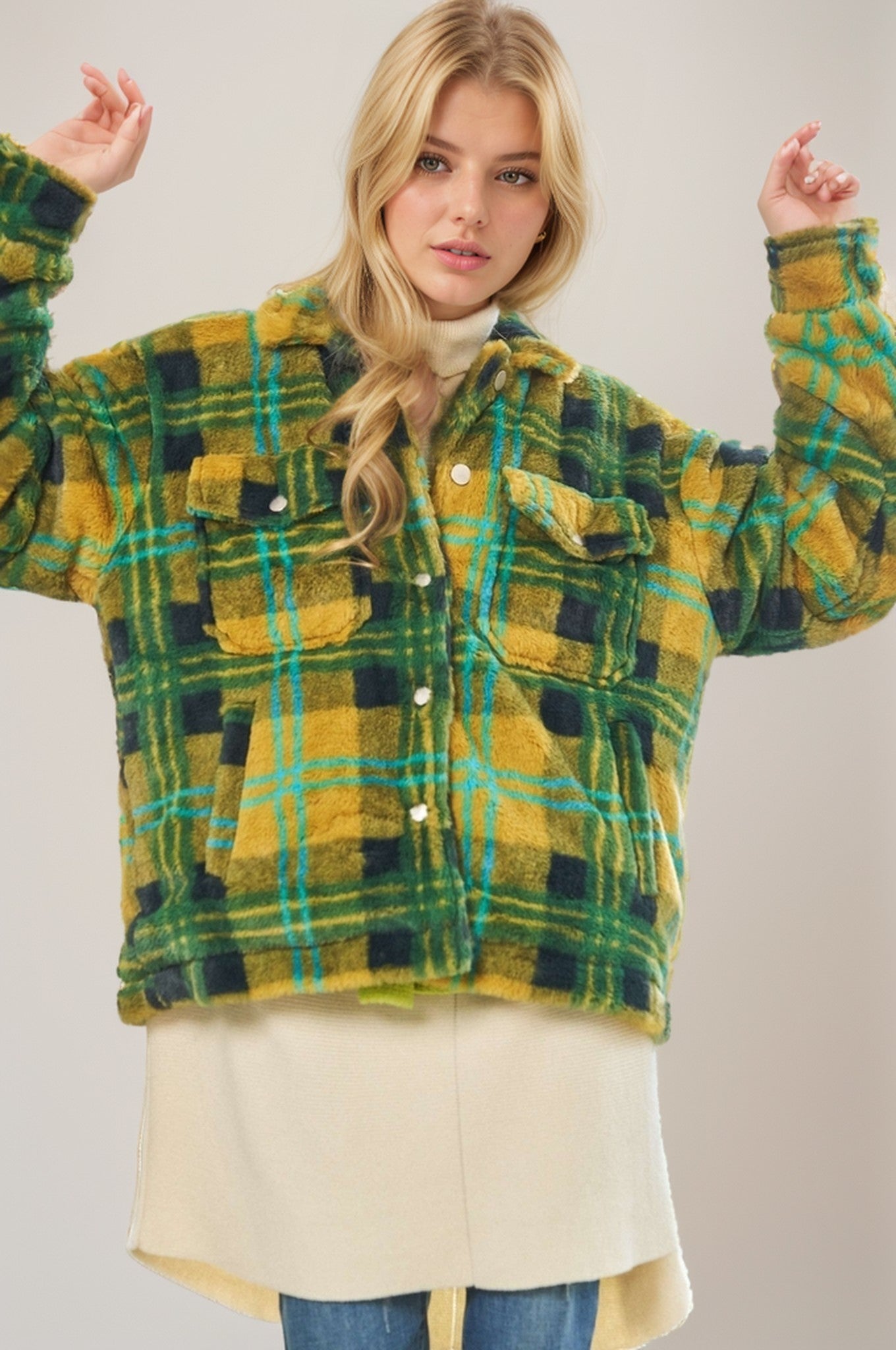 Wrap yourself in plaid perfection with this cozy button-front jacket that's equal parts chic and snuggly. Featuring a dreamy blend of green, navy, mustard, and light blue in sumptuous faux fur, it's the kind of piece that feels as good as it looks. The silky mustard lining adds a pop of personality, while practical side pockets keep your hands happy. Whether you're heading out for errands or a night on the town, this jacket delivers instant warmth and effortless style.