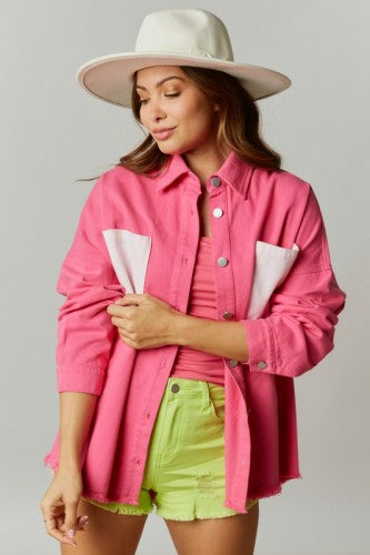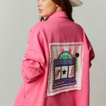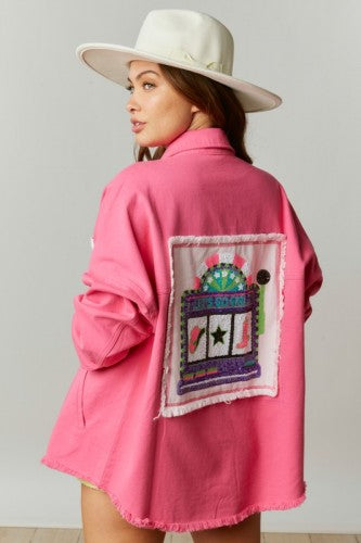 Rock a statement piece that screams fun and adventure. This denim jacket features a striking pink palette with light pink front pockets, practical side pockets, and a show-stopping sequin patch on the back showcasing a slot machine with "Let's Go Girls" in bold lettering. Whether you're heading to Vegas, Nashville, or just a night out with your crew, this jacket demands attention and celebrates your party spirit. Made to turn heads and spark conversations.