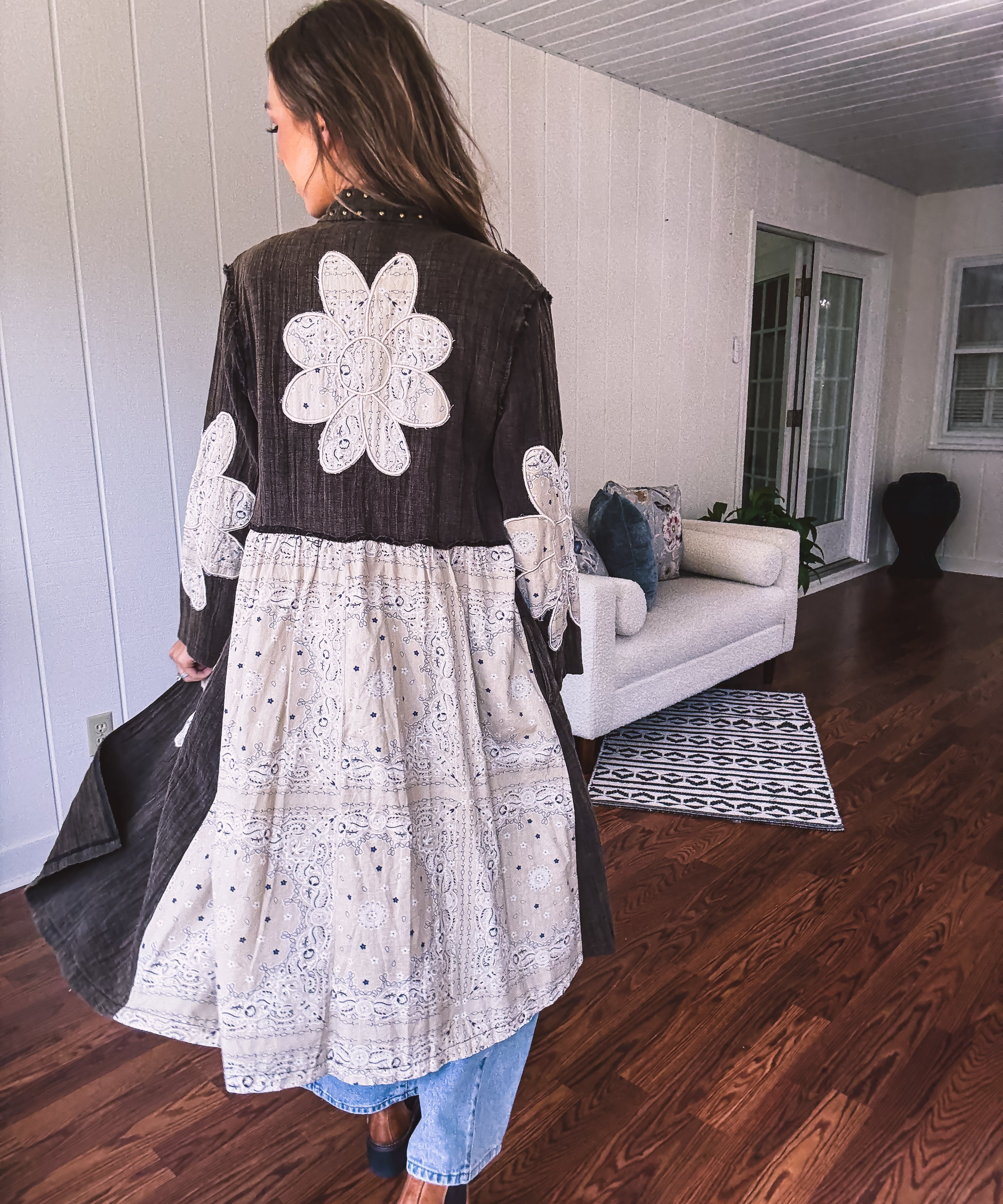 Black Gingko Leaf Printed Chiffon Dress with Smock Yoke