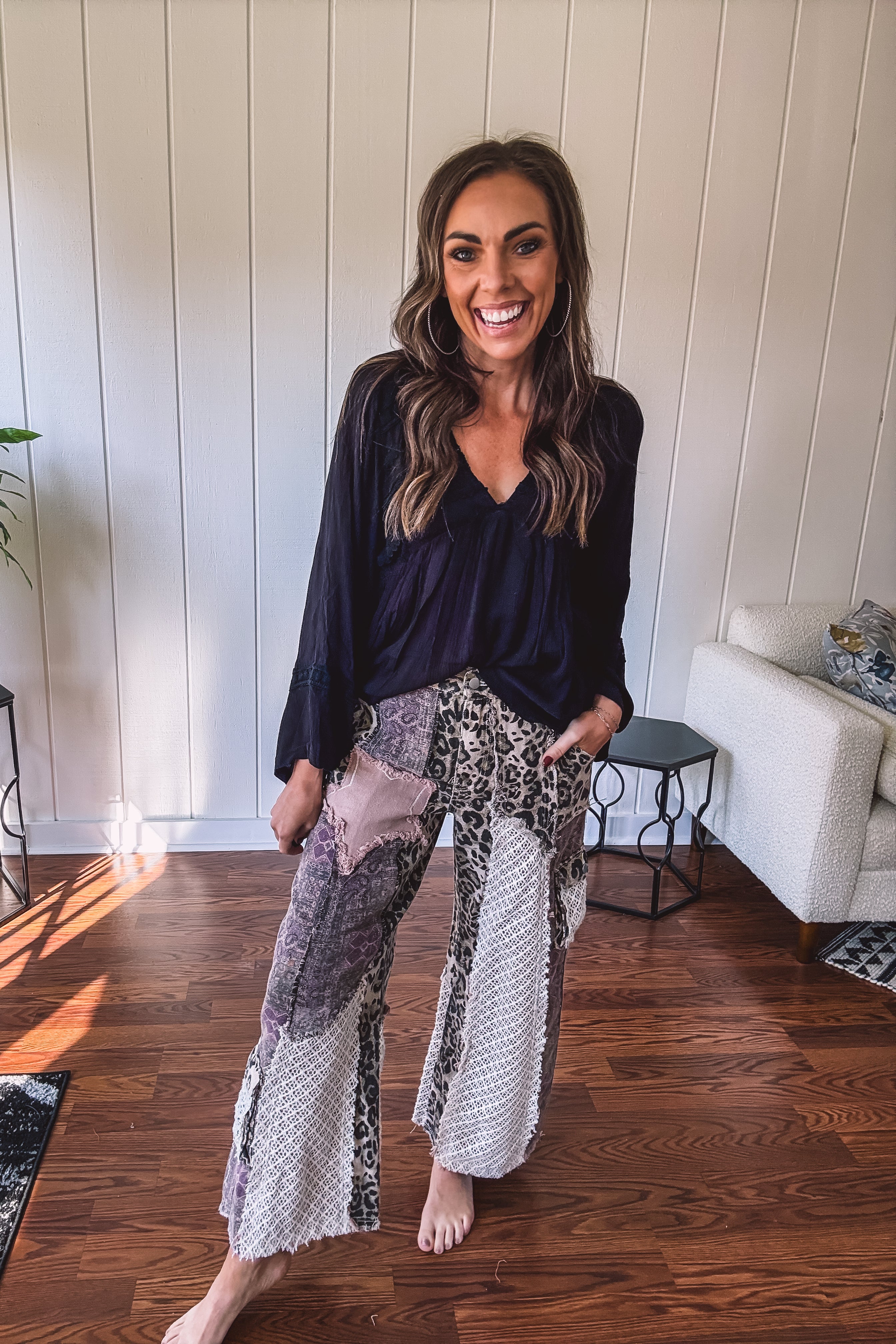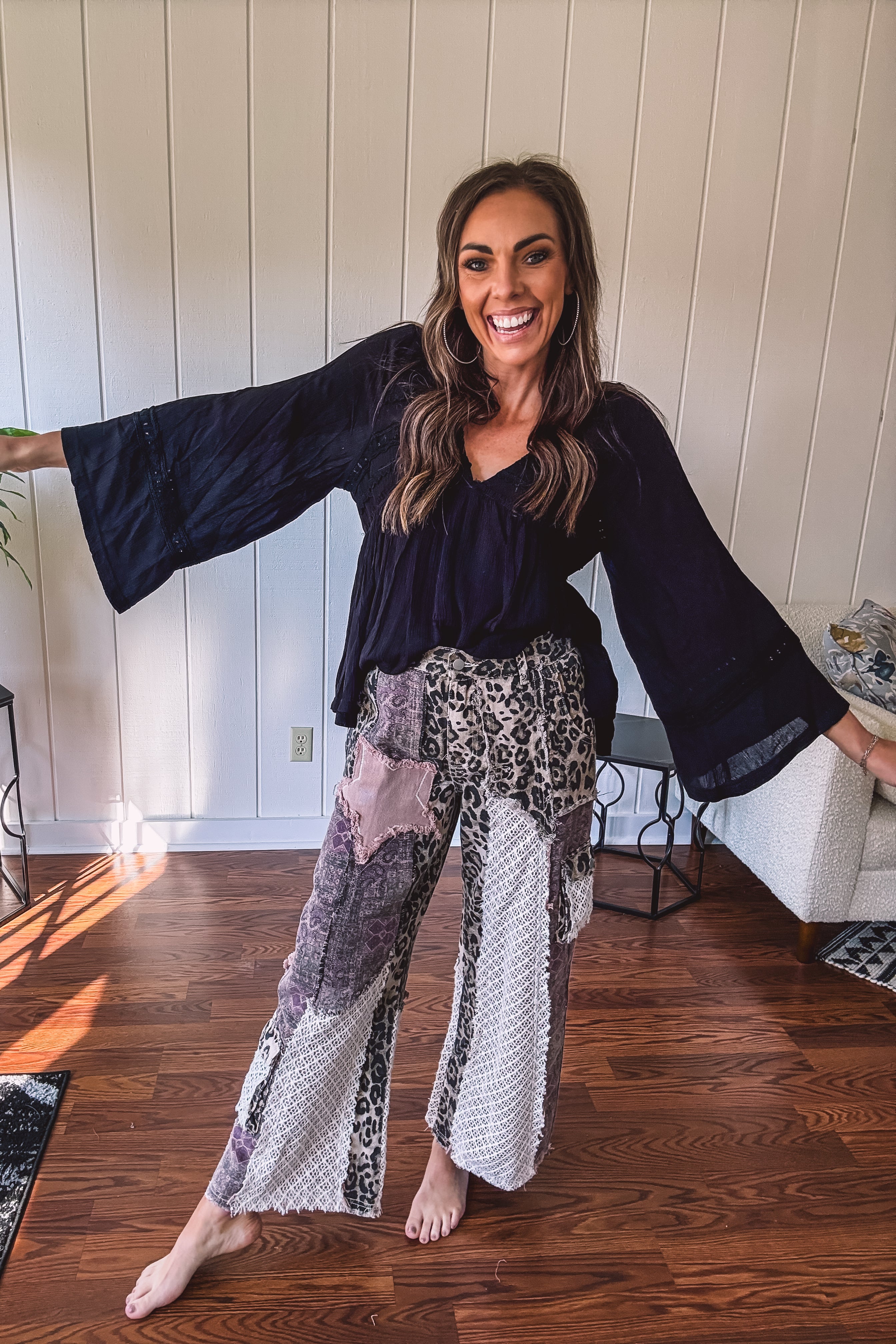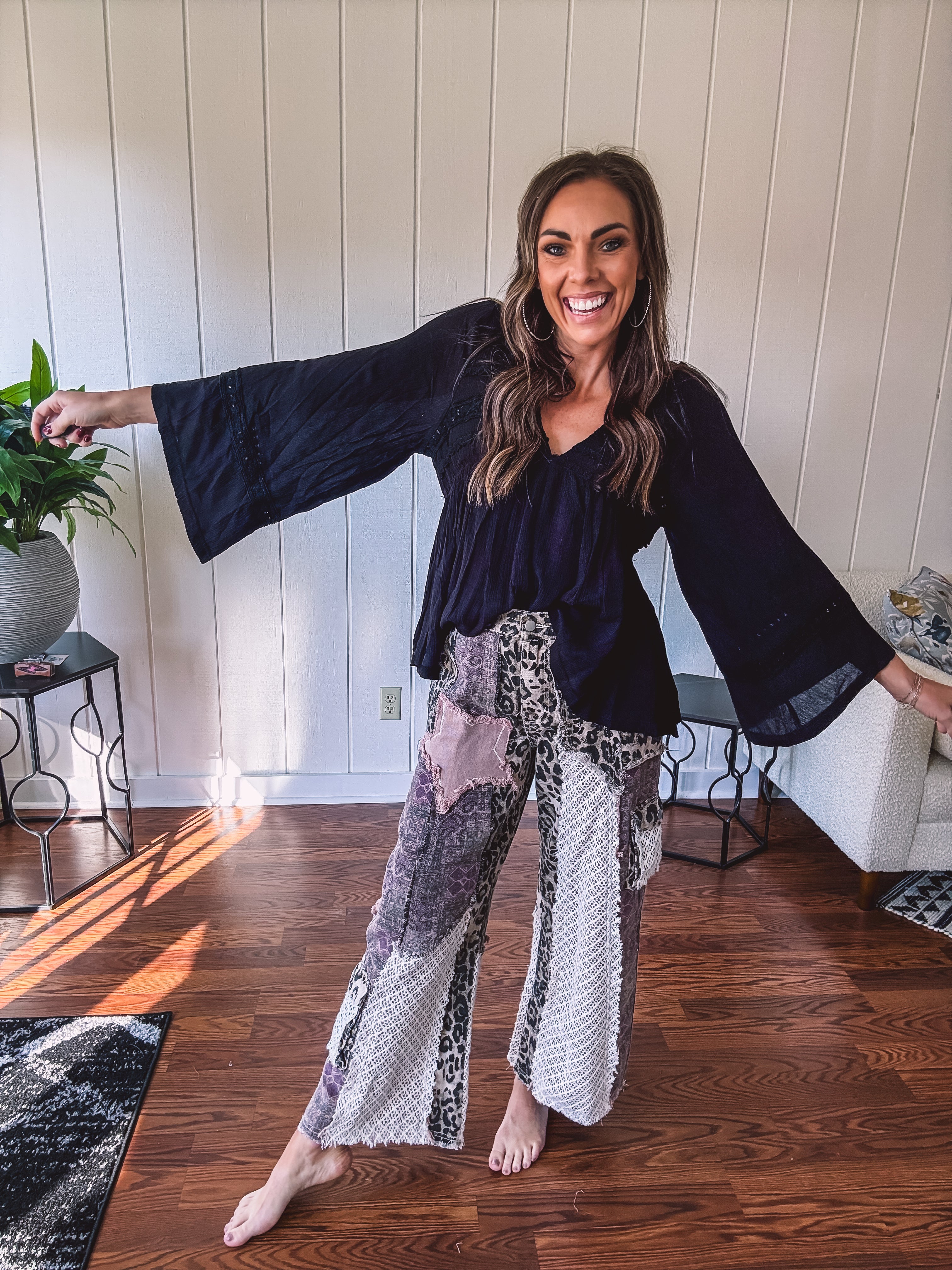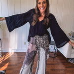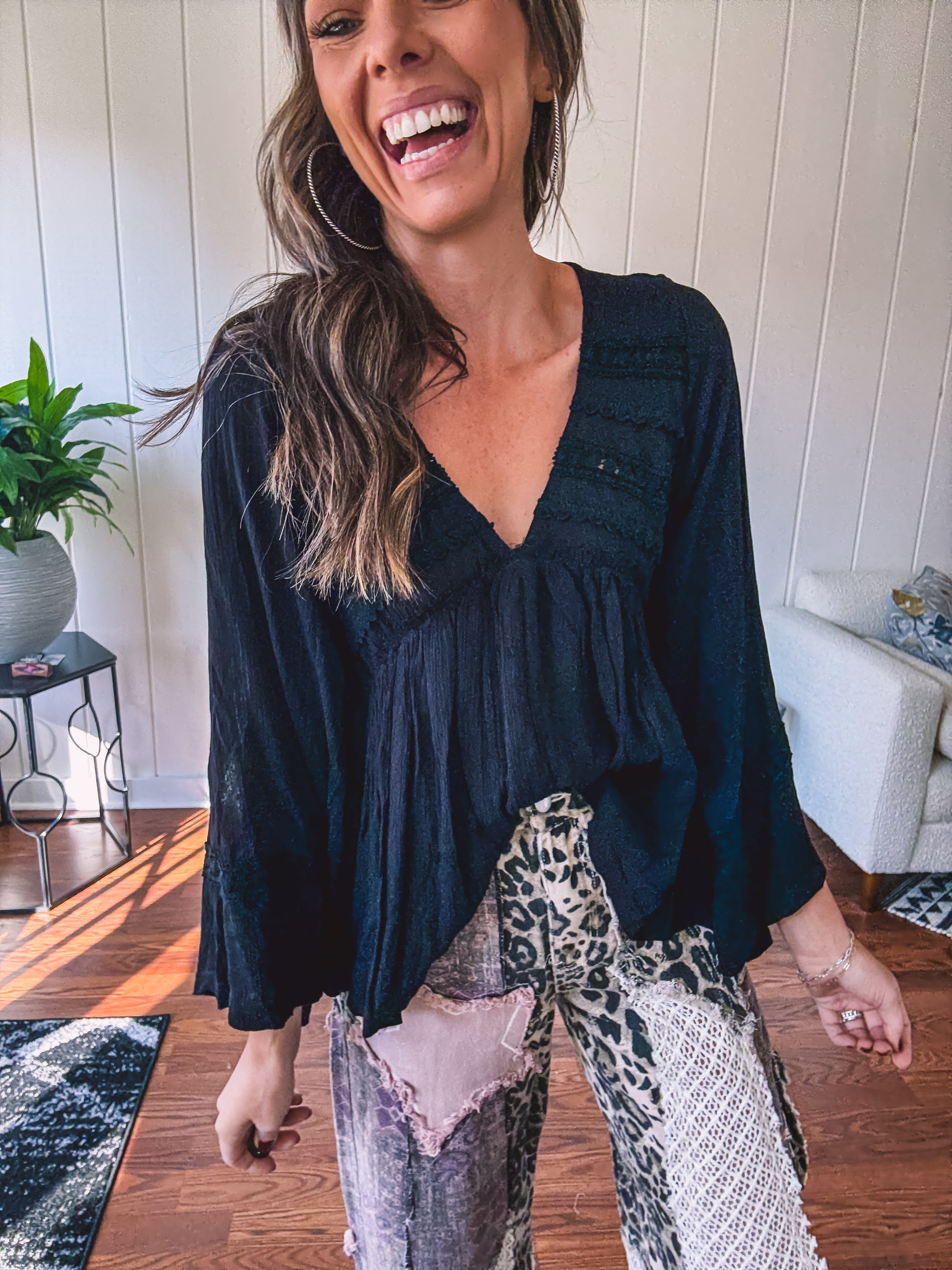 Embrace your inner free spirit with this striking black boho blouse. The lightweight crepe fabric flows beautifully while delicate eyelet lace adds an unexpected touch of sophistication. A plunging V neckline and billowing sleeves create that effortless, wandering-soul vibe. Style it with your go-to jeans for casual cool or pair with flowy pants for full boho mode. This is the blouse that says "I'm comfortable being myself"—and looks amazing doing it.