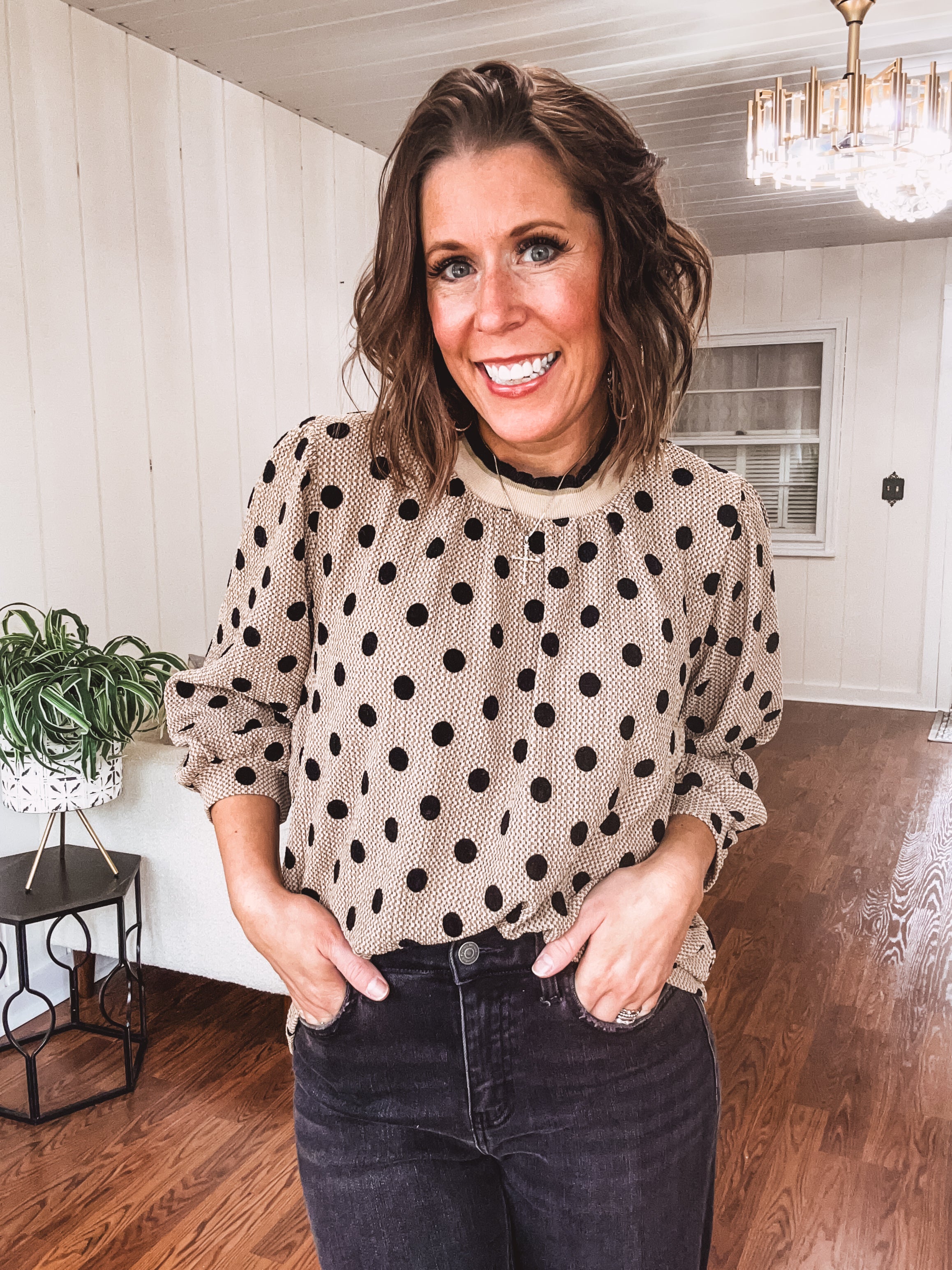 This delightful blouse features a cozy latte-colored textured fabric sprinkled with playful black polka dots. With its ruffled neckline, tailored cuffs, and clean straight hem, it’s an ideal match for skirts, slacks, denim, or linen. Effortlessly move from day to night, casual to chic, and work to weekend with this fun and versatile favorite.