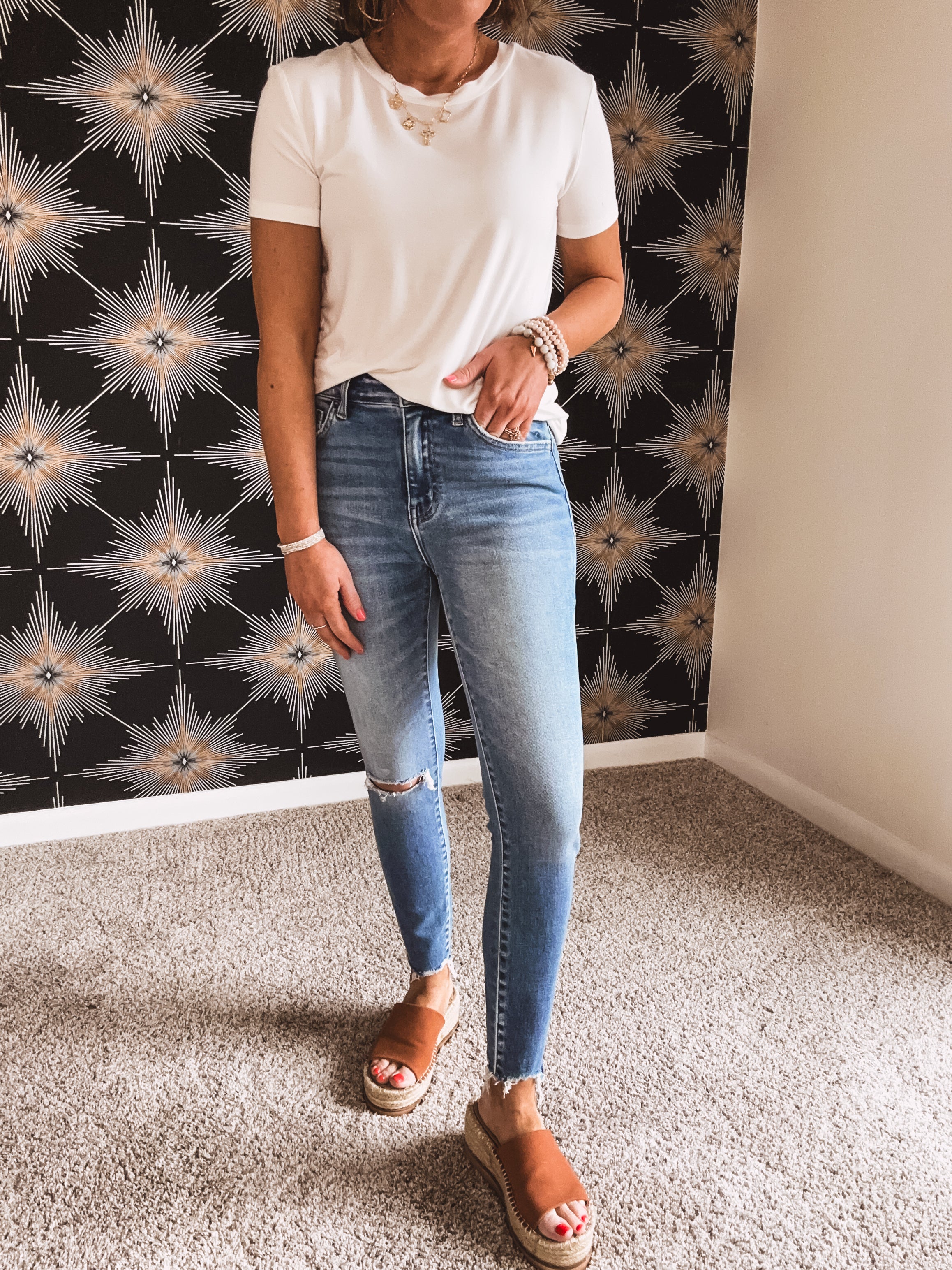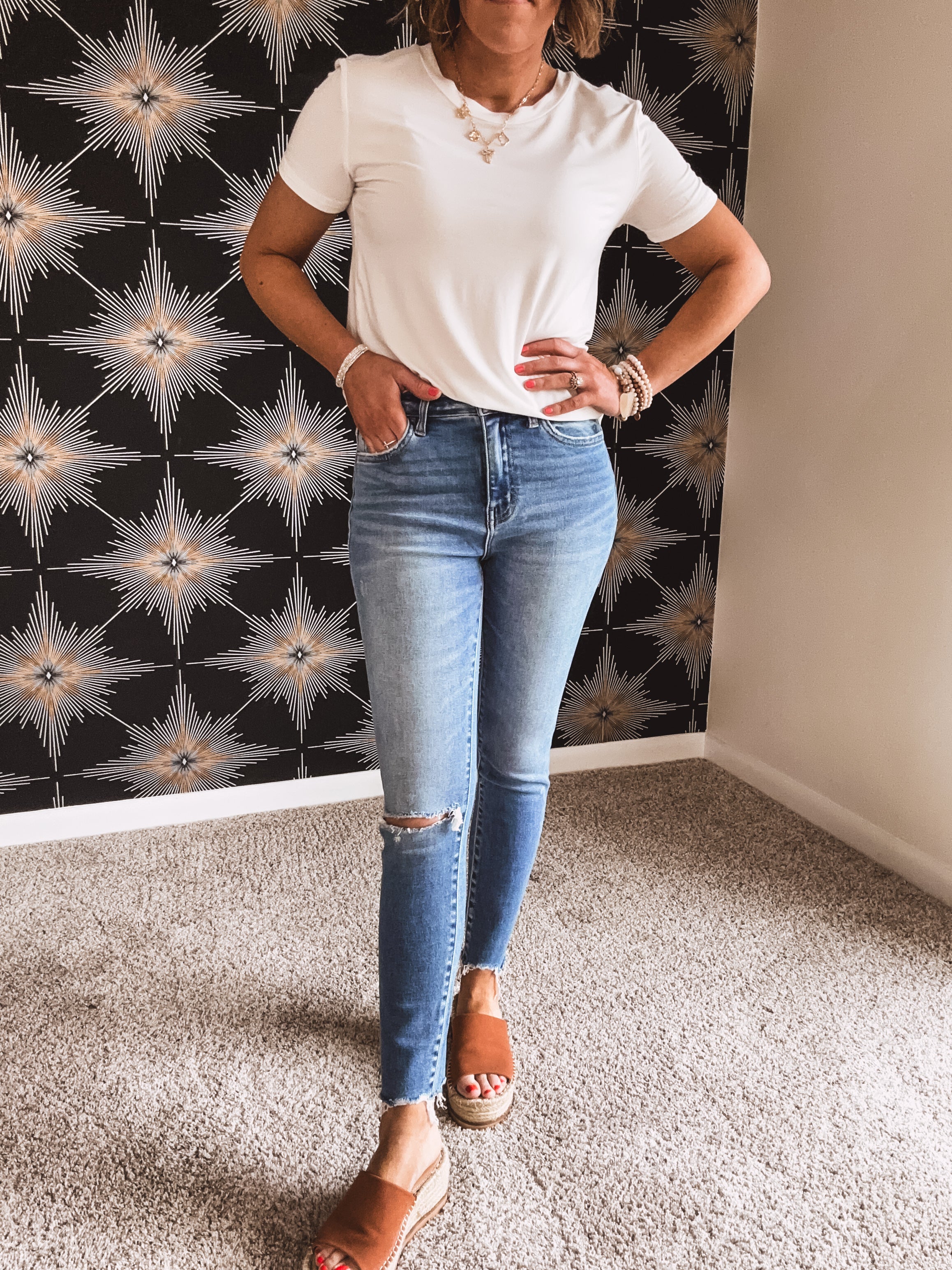 Experience ultimate comfort and style with our Achievable Skinny | High Rise jeans. Made with comfort stretch denim, these jeans feature a high rise waist and minimal distressed detail at the knee. The raw hem allows for customizable length options, while the cropped length adds a trendy touch to these skinny jeans.