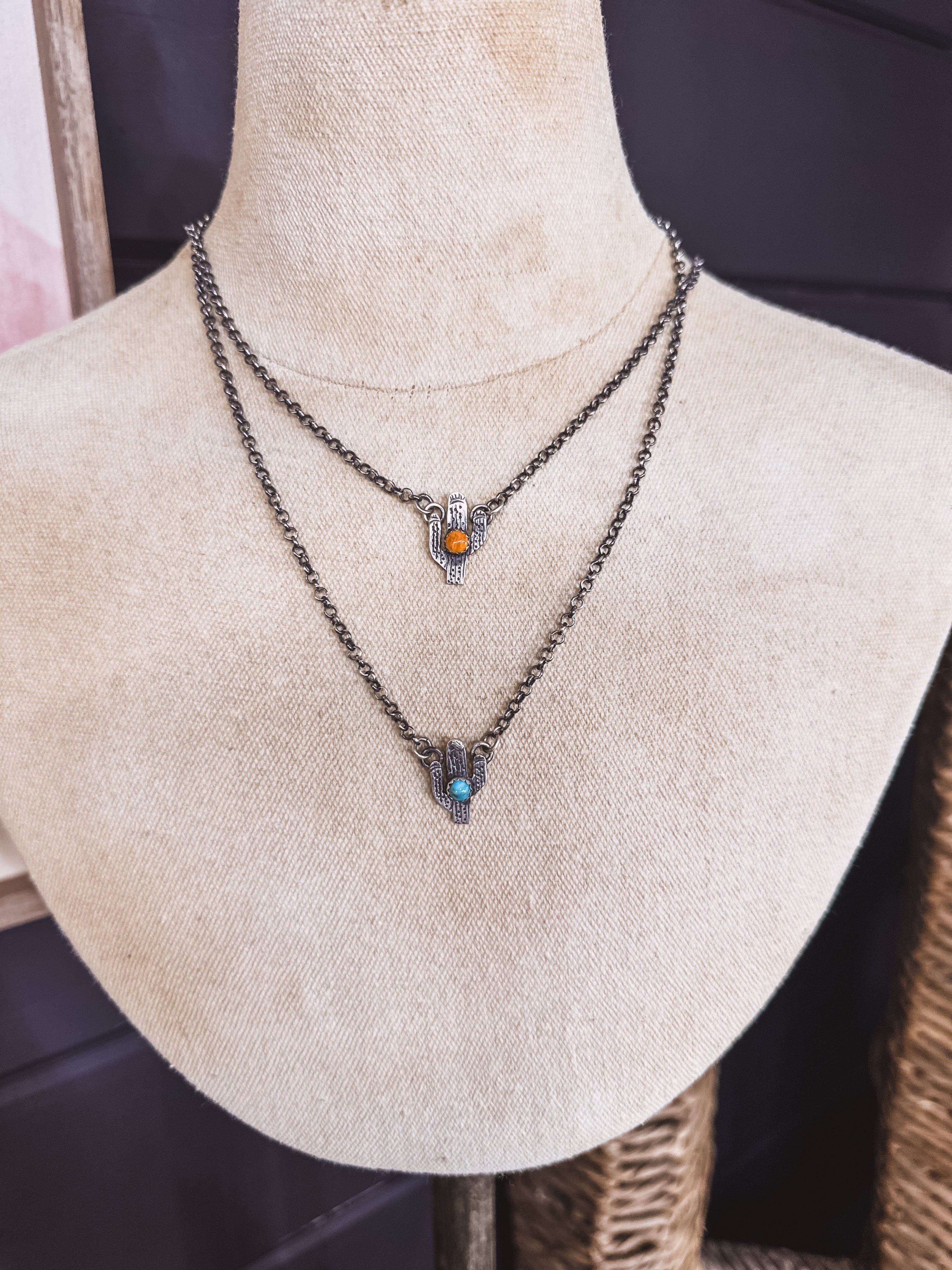 These charming necklaces bring a touch of the Wild West with a turquoise or spiny oyster stone cradled in a sterling silver cactus, hanging from a sterling silver chain. Perfect for rocking solo or stacking with your favorite silver treasures!