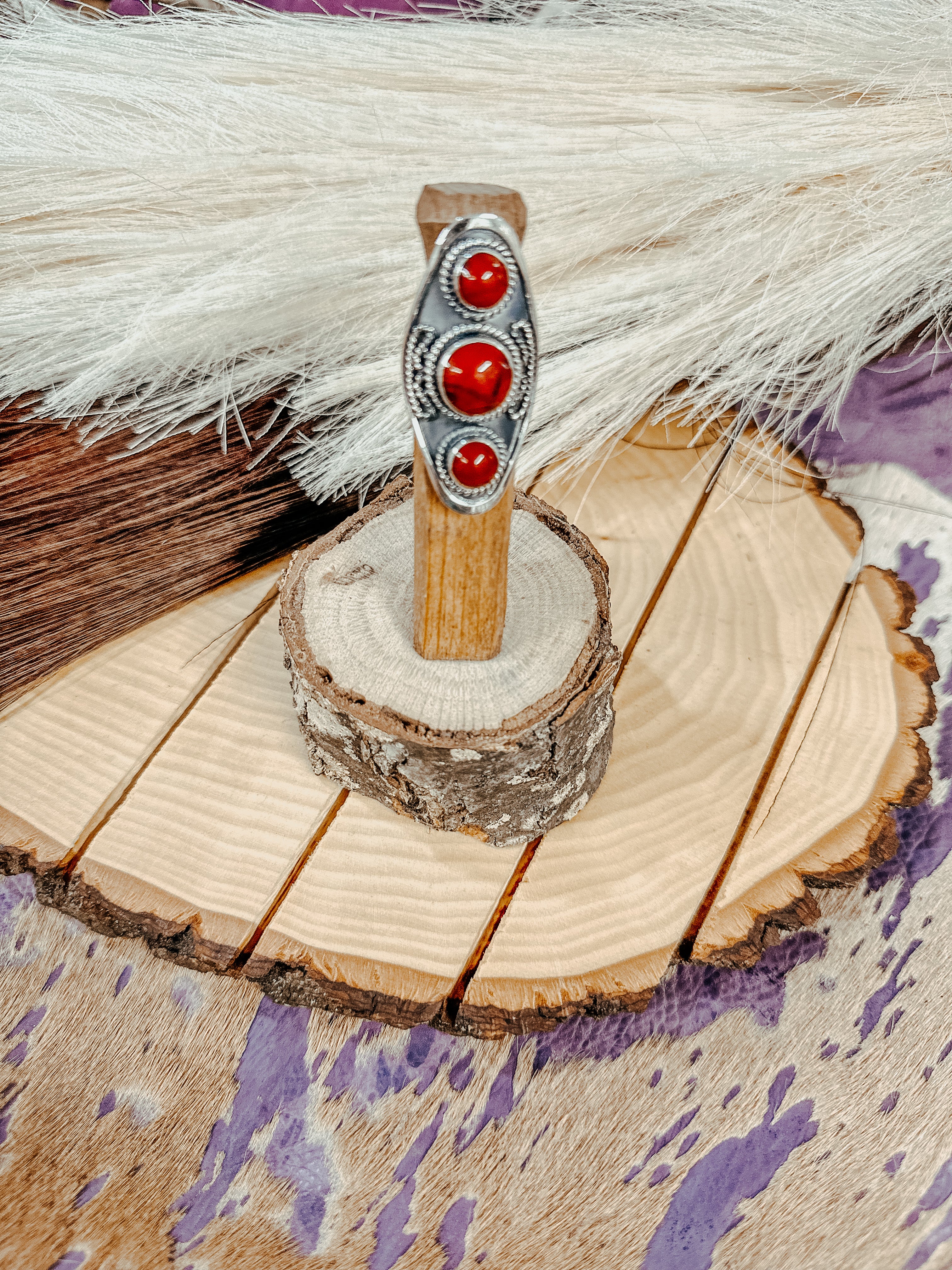 Indulge in the beauty of this genuine Sterling Silver ring, boasting a diamond-shaped mount and intricate rope detail. Three stunning red Jasper stones in different sizes add a touch of uniqueness to this statement piece, making it the perfect addition to any Sterling Silver or Navajo Pearl collection.