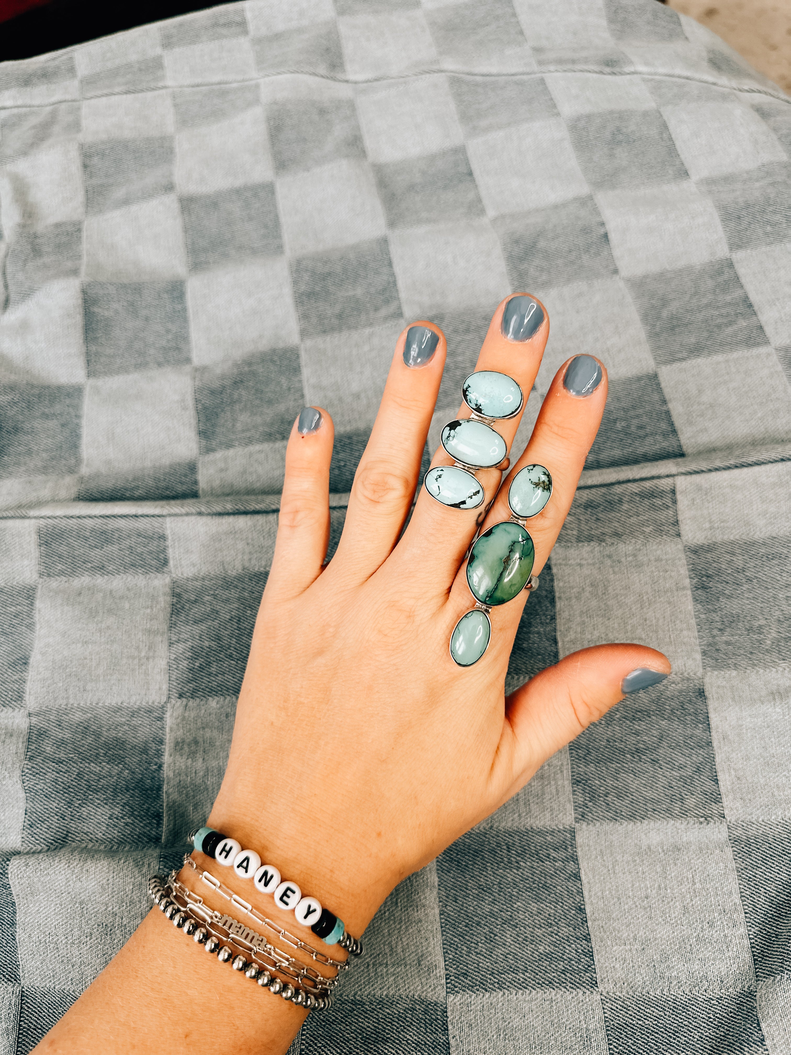 Indulge in the stunning beauty of authentic Kingman Turquoise with this adjustable triple ring. Option 1 features three light turquoise oval stones, while option 2 boasts a darker green and turquoise combination with two smaller stones surrounding the larger oval. Both options are set in genuine Sterling Silver, making these hand-crafted rings true statement pieces. Experience the uniqueness of these OOAK beauties and be captivated by their simplistic, yet gorgeous design.