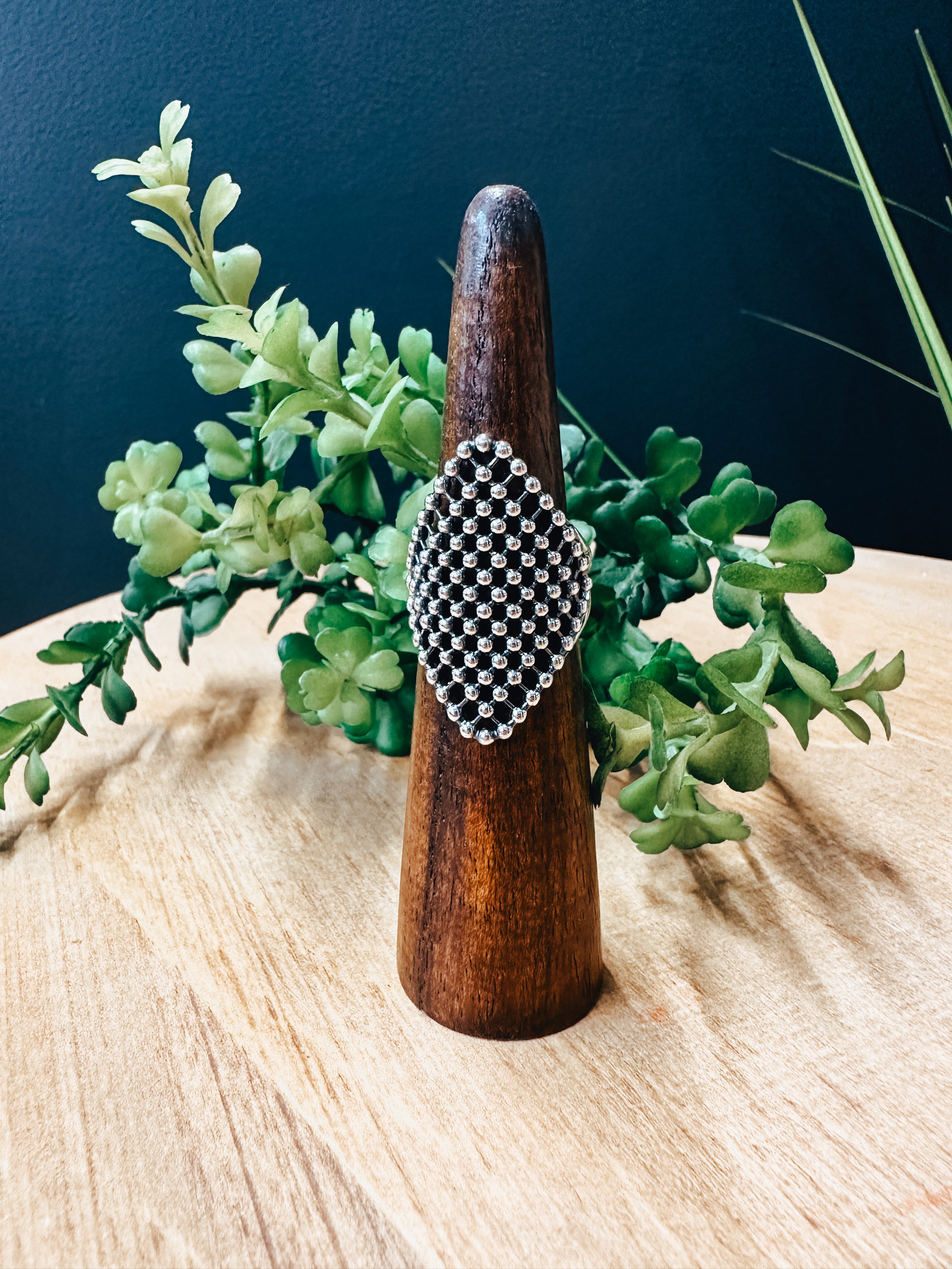 Indulge in the exquisite craftsmanship of our Oxidized Diamond Silver Ring. Handcrafted with Authentic Sterling Silver beads, this statement piece features a vintage and edgy vibe and a unique diamond shape that stretches from knuckle to knuckle. Guaranteed to turn heads, it pairs beautifully with all of your Sterling Silver or Turquoise pieces.