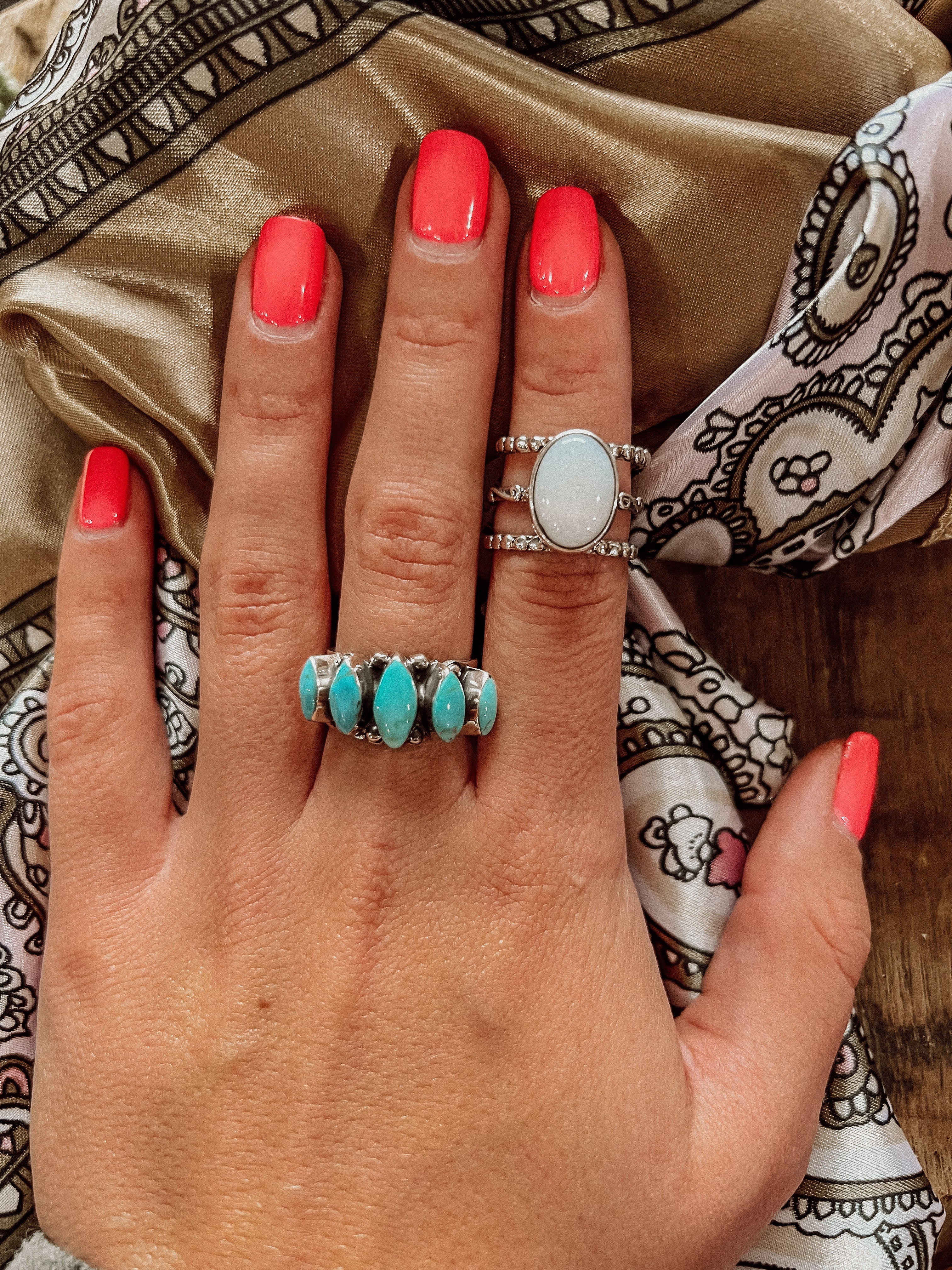 - This bold piece with diamond shaped Kingman Turquoise stones looks great on any finger and is a Jess and JT fav!