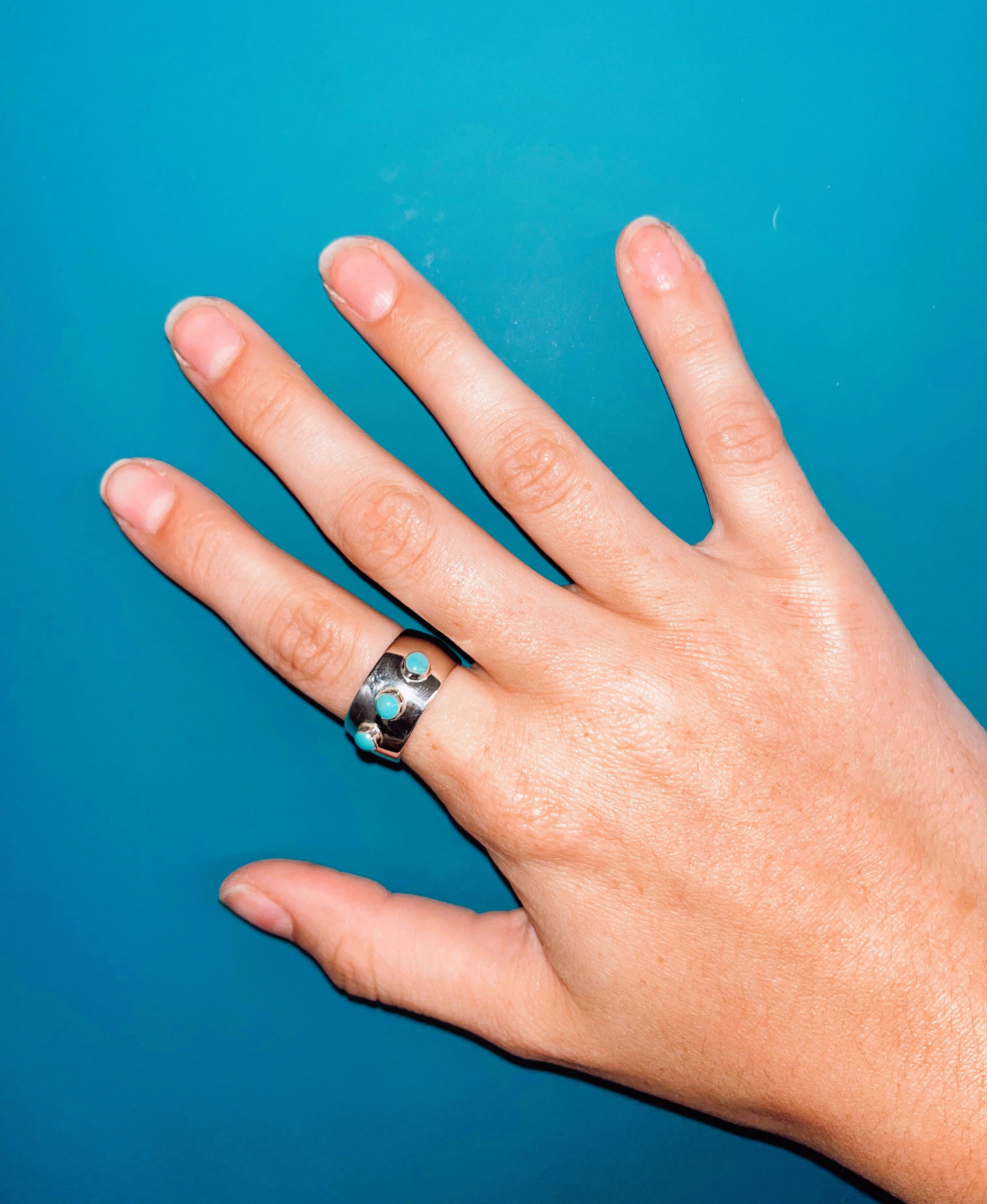 - Chrome-like thick Authentic Sterling Silver band with three Genuine Kingman Turquoise Stones