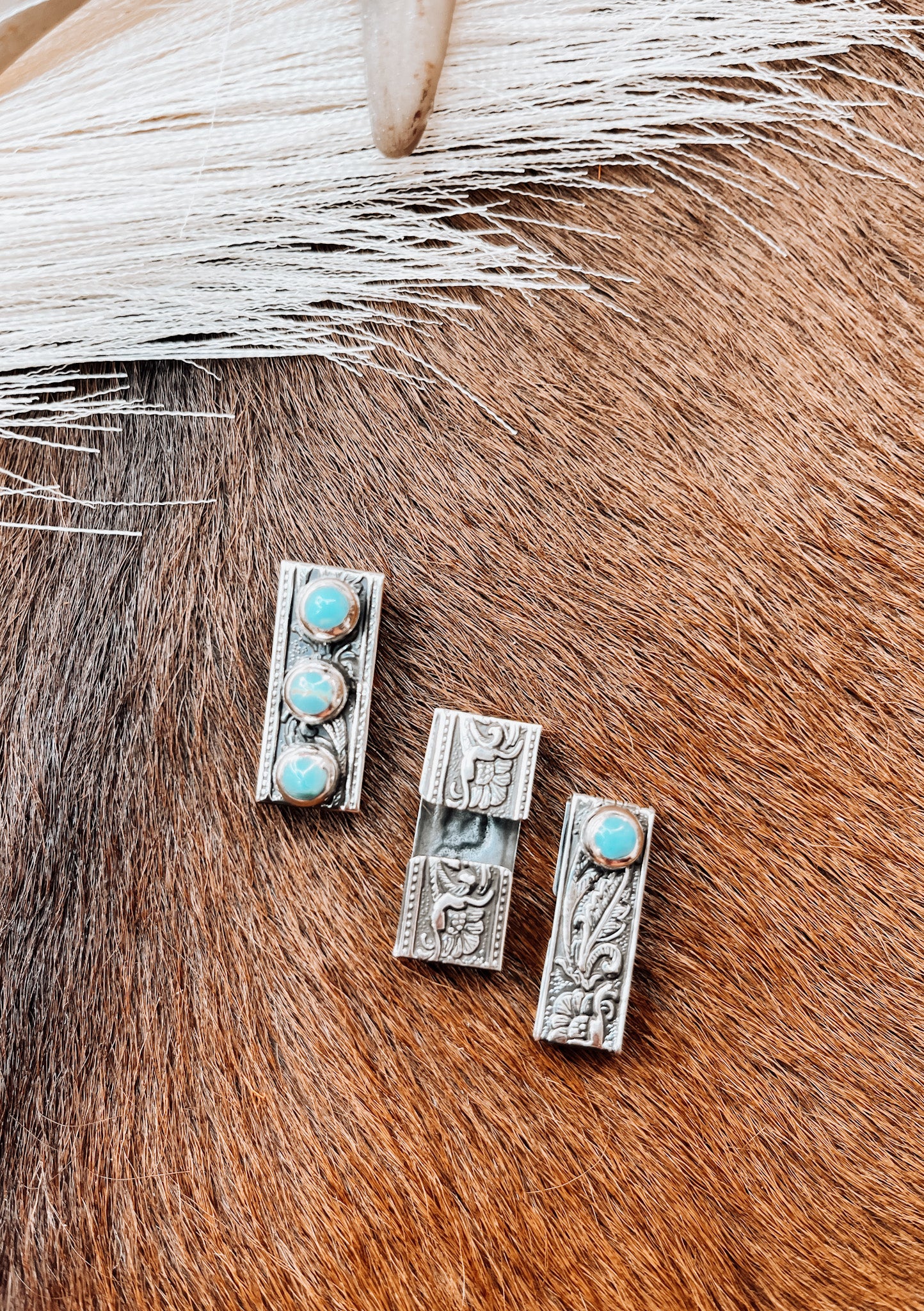 Indulge in the luxurious beauty of this Sterling Silver cuff, adorned with three stunning Kingman Turquoise stones and intricate stamped detailing. Perfect for lovers of Turquoise and Western style, this exquisite watch accessory elevates your look and makes a bold statement. Get all three pieces for the ultimate expression of your passion for this precious stone.