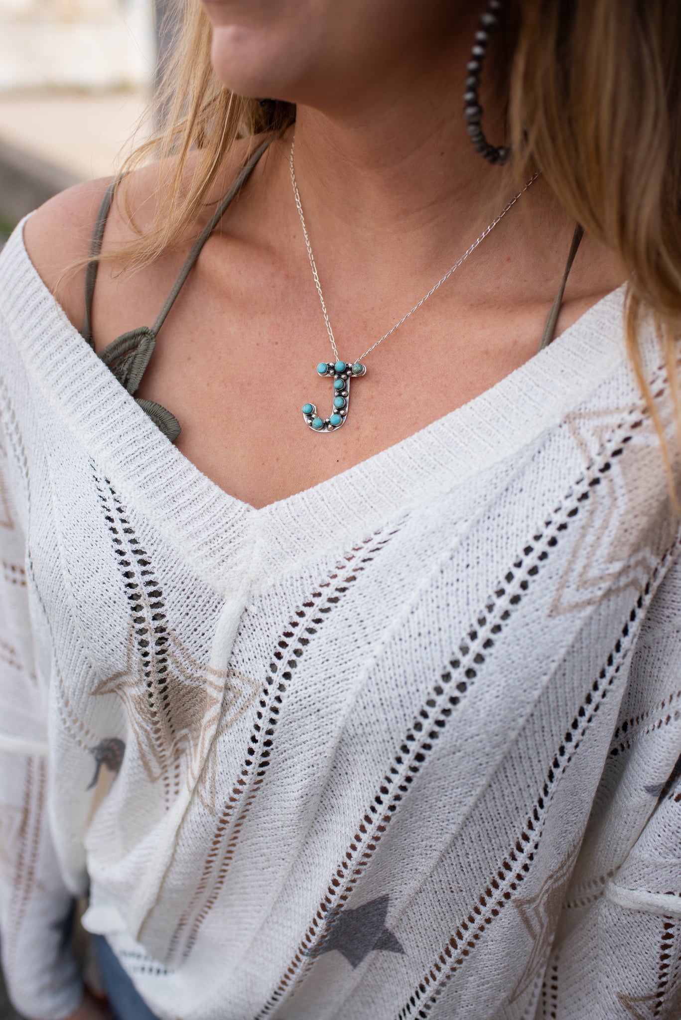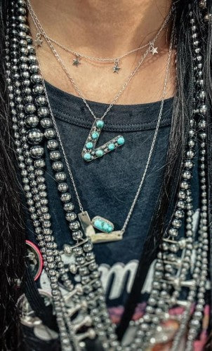 Experience the beauty and tradition of the Southwest with our Turquoise Initial Necklace. Handcrafted with Authentic Kingman Turquoise stones and Genuine Sterling Silver, each large initial is adorned with Sterling Silver balls, creating a stunning and captivating design. Choose to wear it on its own, or add it to a Navajo Pearl necklace for a unique and Western-inspired look. Perfect for layering or as a statement piece, this necklace is a must-have for any jewelry collection.