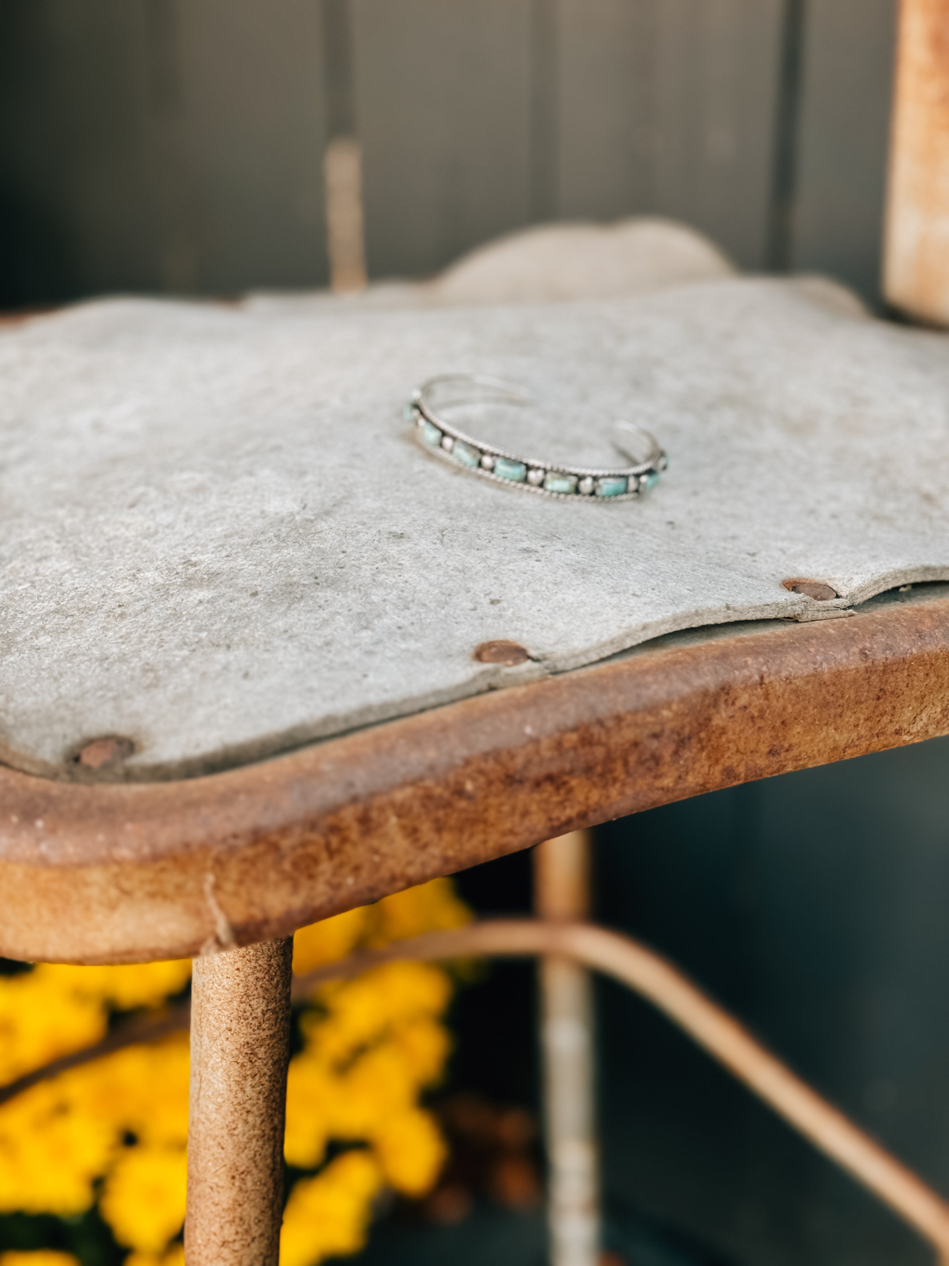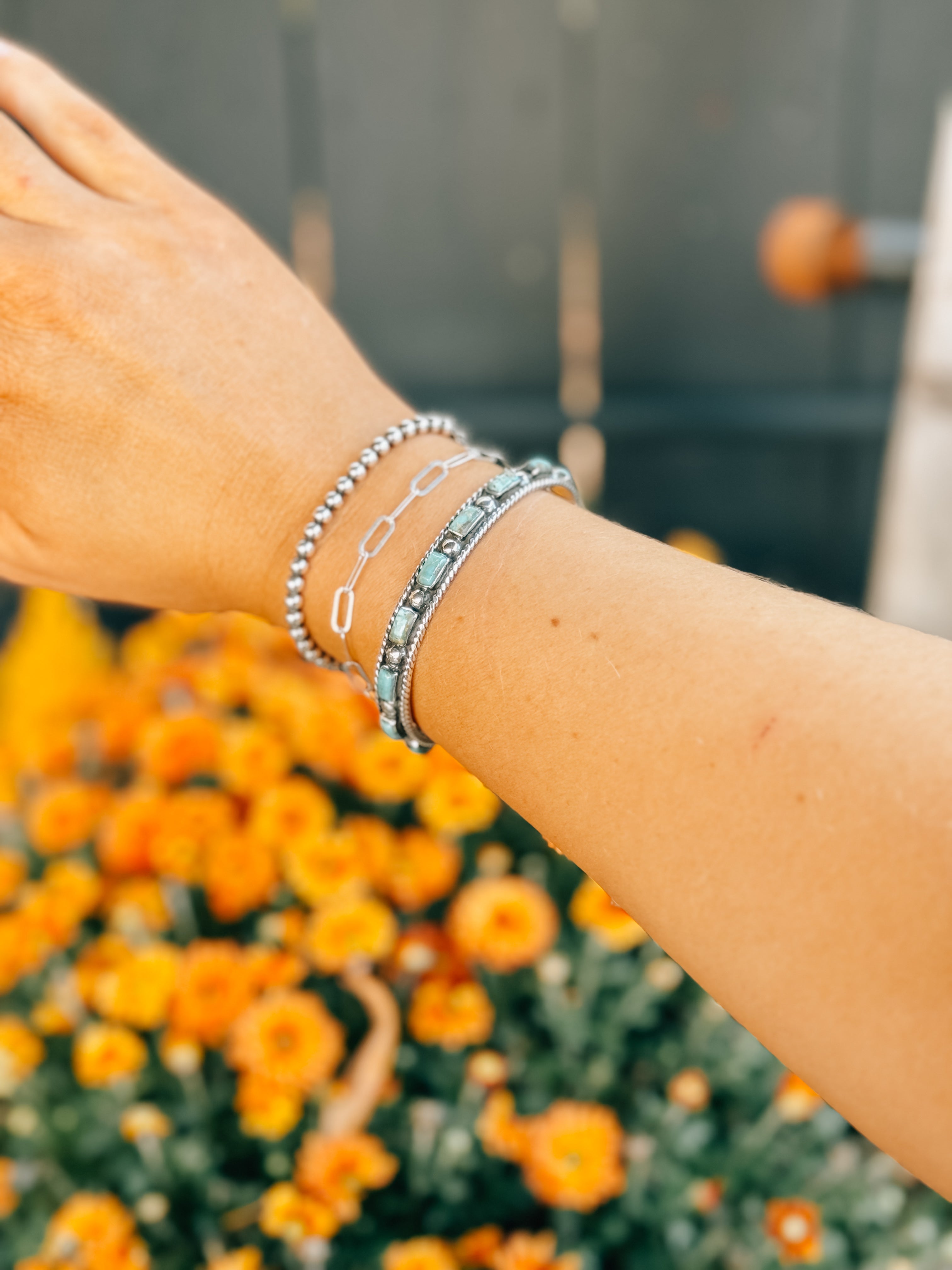 This fun and stylish cuff shines with a row of chicklet-shaped genuine Turquoise stones, each spaced by shiny chrome-like beads against a dark oxidized base. Made from authentic Sterling Silver, it’s a perfect pick for stacking or making a bold turquoise statement!