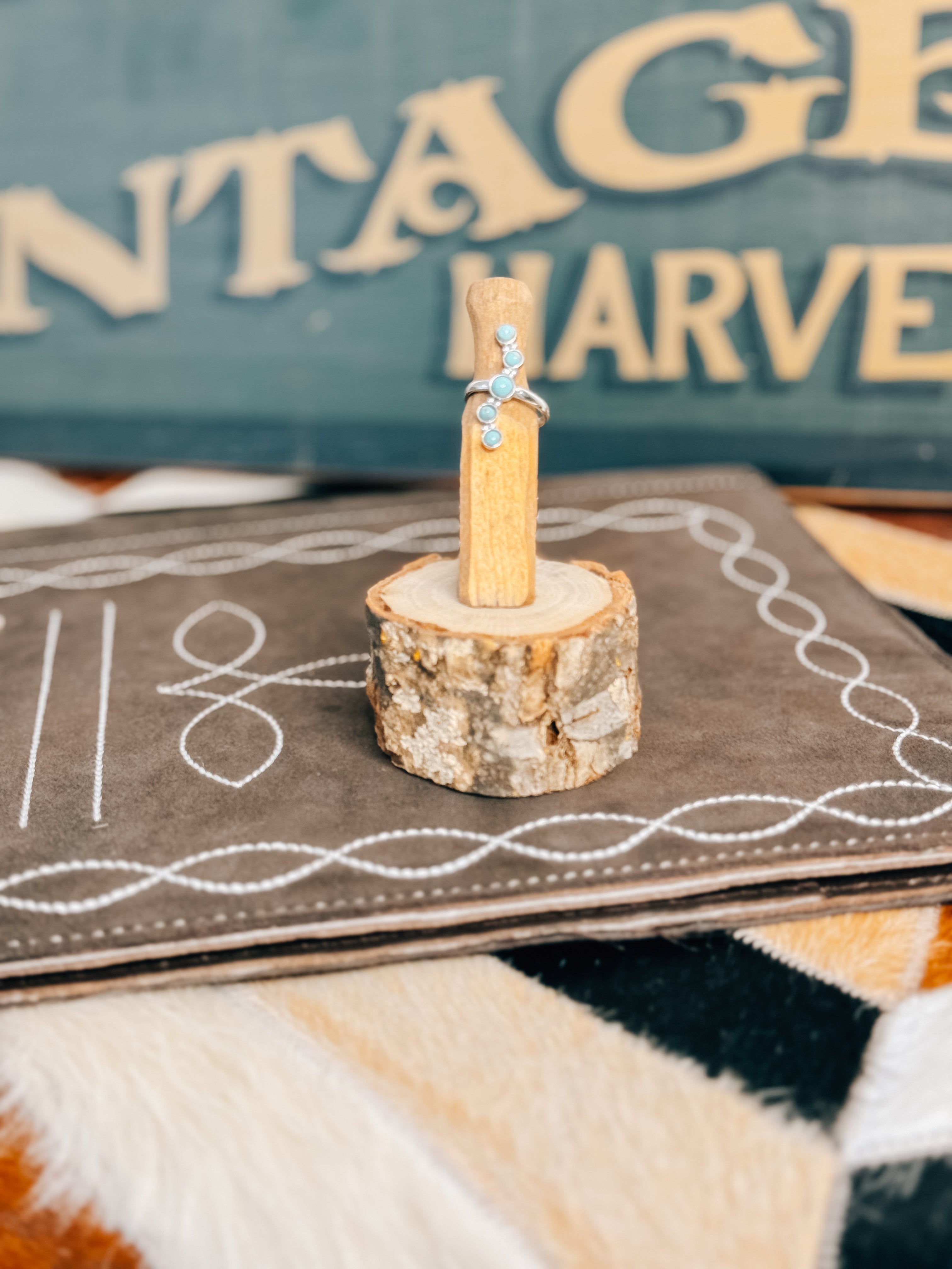 Indulge in the exquisite craftsmanship of Rhoda Katz with our stunning Turquoise + SS Wavy Ring. This one-of-a-kind piece showcases five Authentic Kingman Turquoise dots on a delicate, yet sturdy, Sterling Silver band. Let this beautiful ring adorn your finger and complement any Sterling Silver or Navajo Pearl accessories.