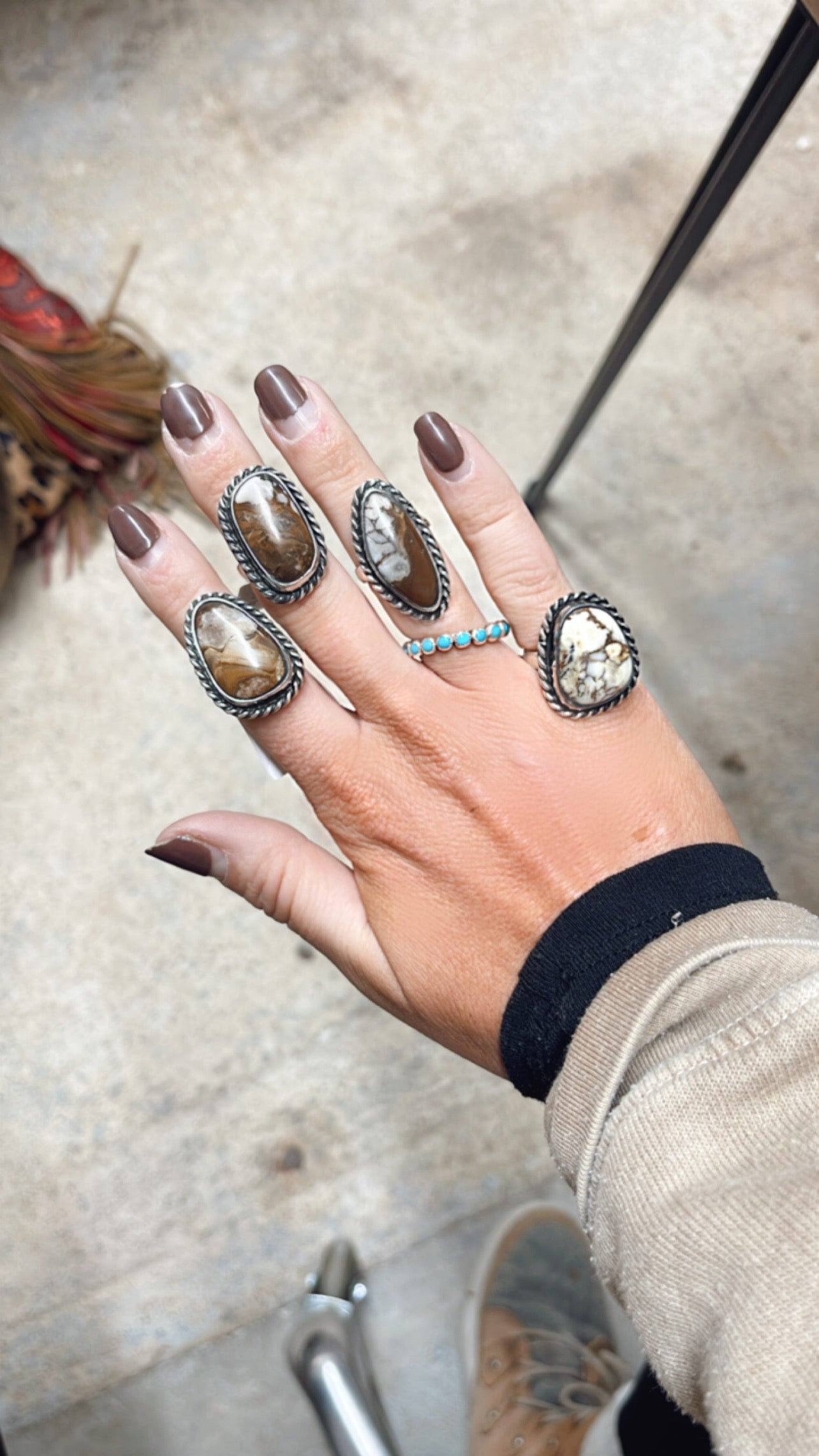Absolutely stunning! These Wild Horse and Sterling Silver rings are one of a kind show pieces that are sure to turn heads. The irregular shapes of the Wild Horse stones combined with the substantial rope edging in Sterling Silver make them a must have for authentic jewelry or just anyone who loves a statement ring!