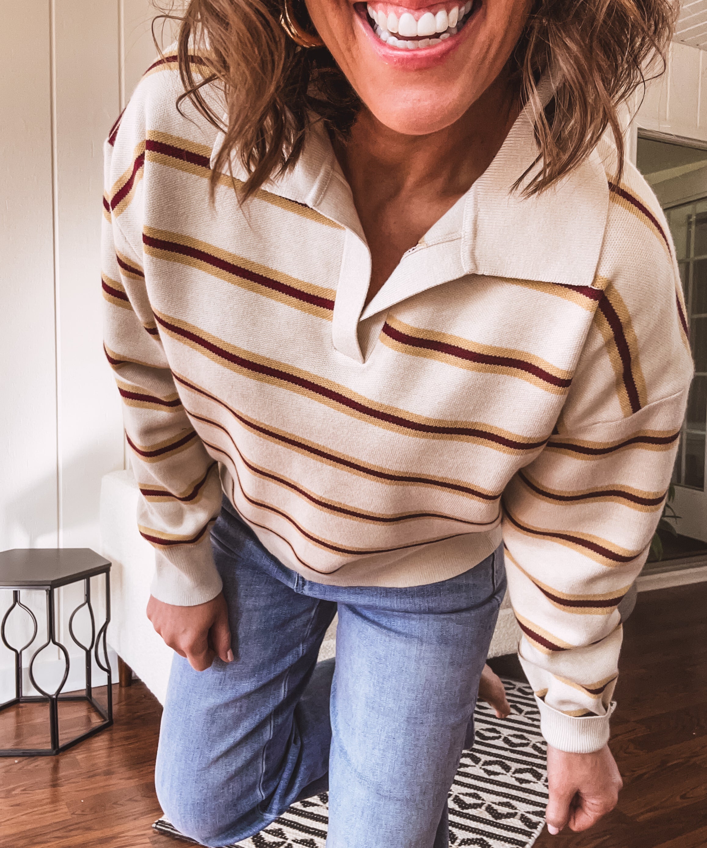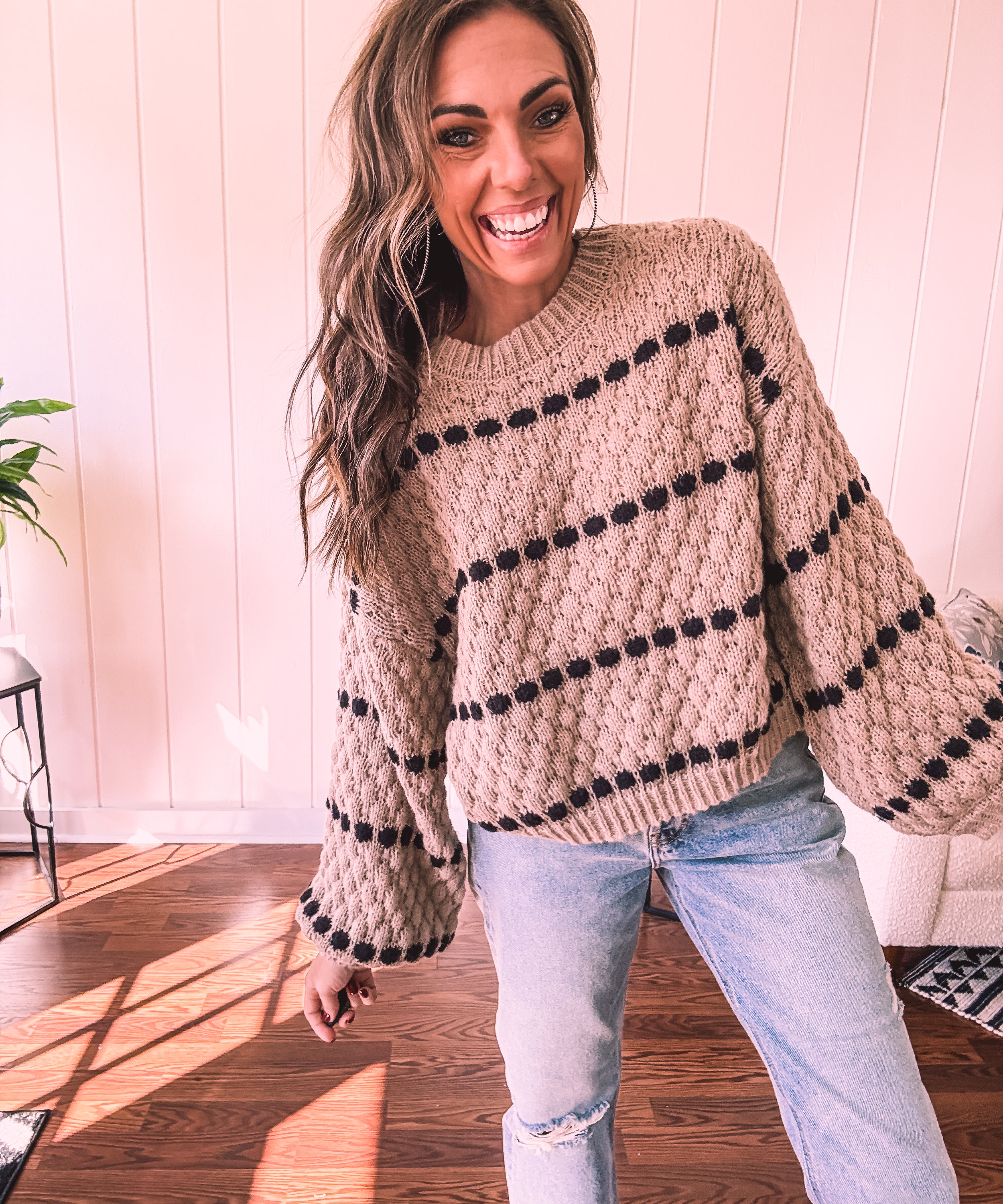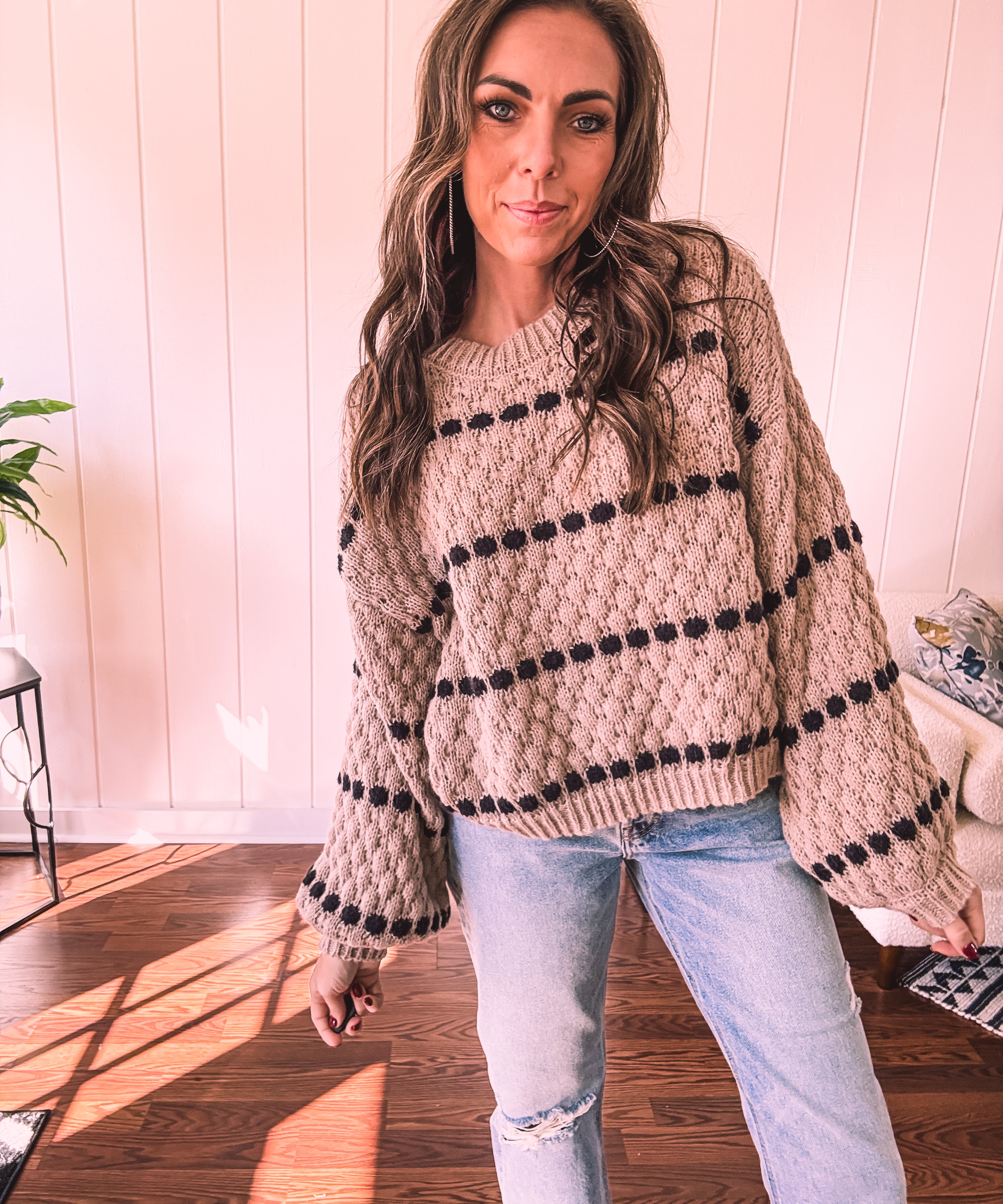 Taupe Woven Stripe Oversized Balloon Sleeve Knit Sweater