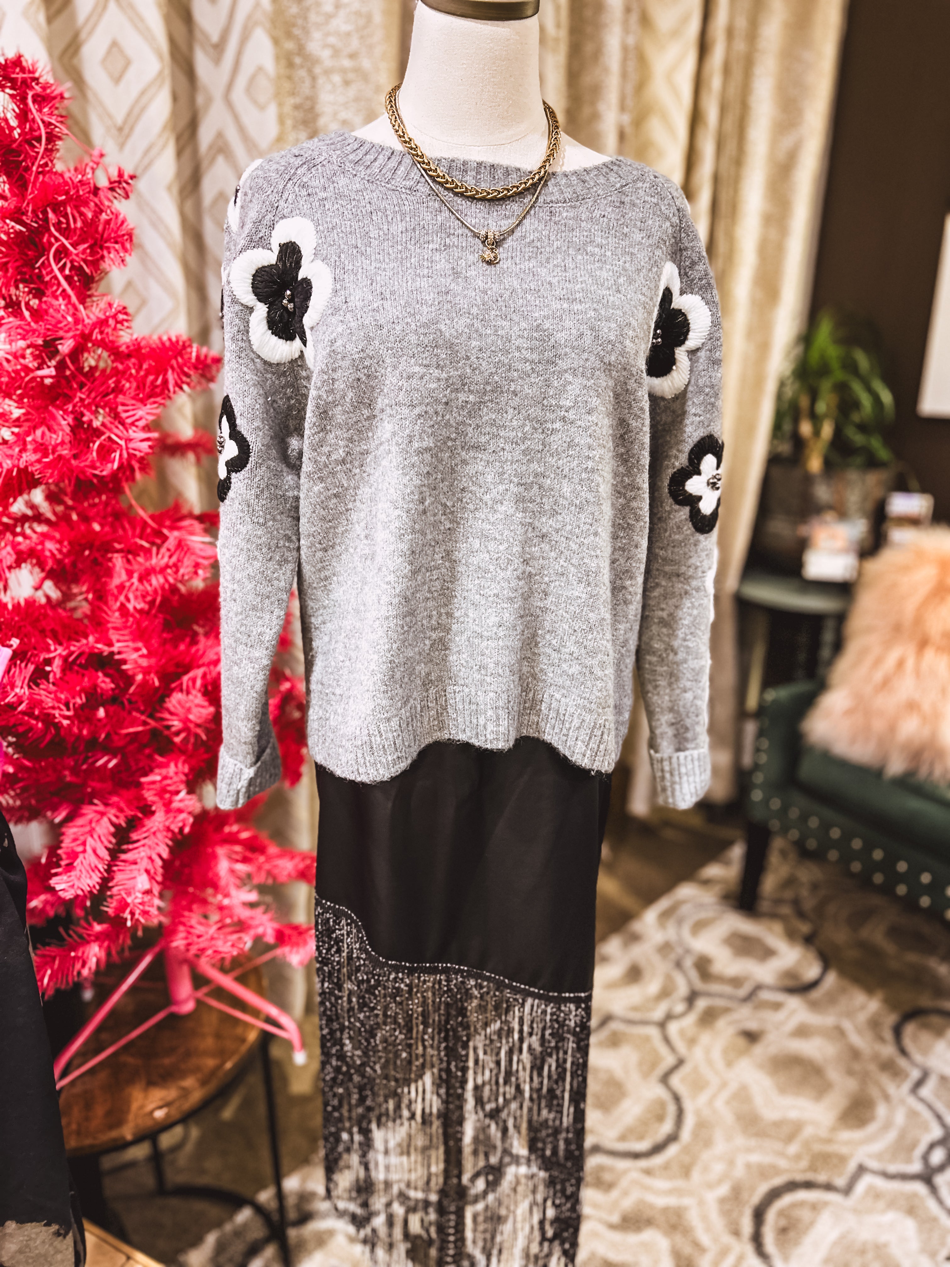 Elevate your everyday look with this charming grey crew neck sweater that brings the perfect blend of sophistication and fun. Delicate black and white threaded florals dance across the sleeves, accented with shimmering beads that catch the light beautifully. Whether you're pairing it with a skirt for brunch, slacks for the office, or your favorite jeans for a casual vibe, this sweater transforms any outfit into something special and totally Instagram-worthy.