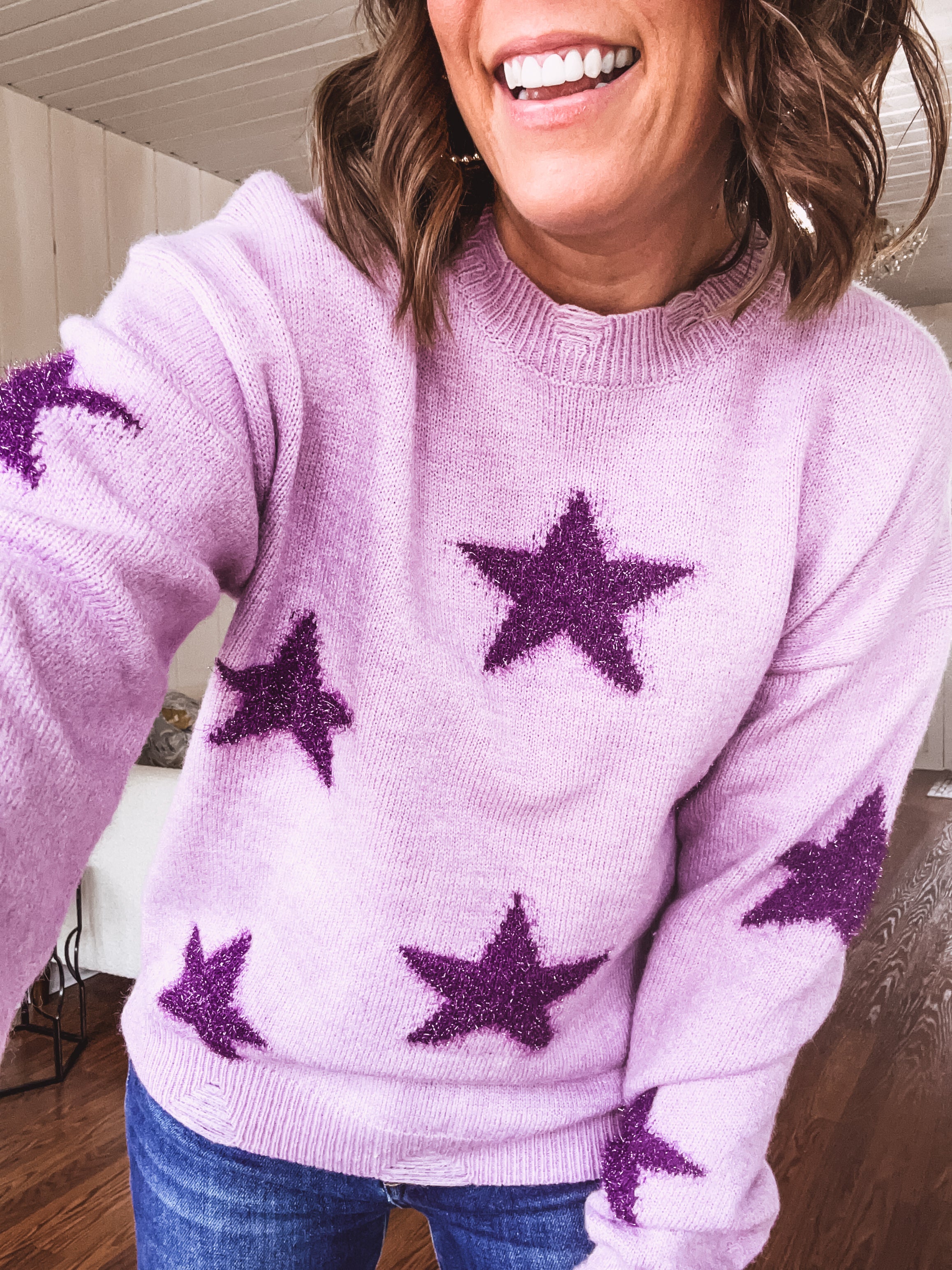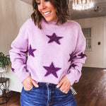 Slip into effortless style with this lavender knit pullover that brings the sparkle. A striking dark plum star catches the light across the chest, while subtle distressing at the neckline, sleeves, and hem add just the right amount of edge. Whether you're heading out for a night on the town or catching up with friends, this playful piece pairs perfectly with your favorite jeans for an instant mood boost.