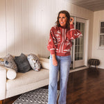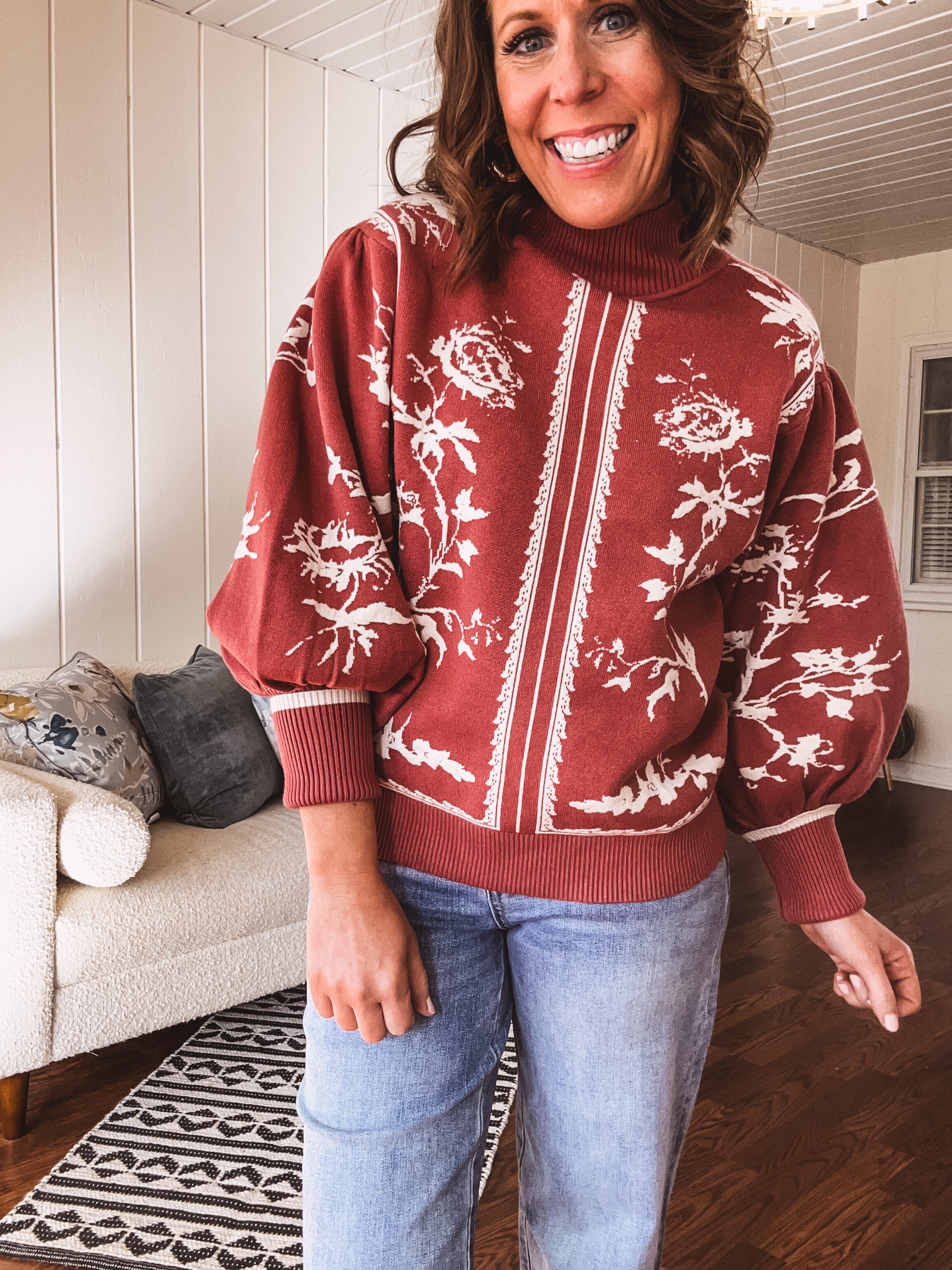 Wrap yourself in this cozy knit sweater that pairs a warm red bean hue with an eye-catching ivory floral mirror design. The mock neck and extended cuffs deliver that effortlessly chic vibe, while the substantial knit fabric keeps you snug and comfortable. Whether you're dressing it down with your go-to jeans or elevating it with tailored trousers, this sweater brings just the right amount of personality to any outfit—perfect for everything from casual hangouts to polished workdays.
