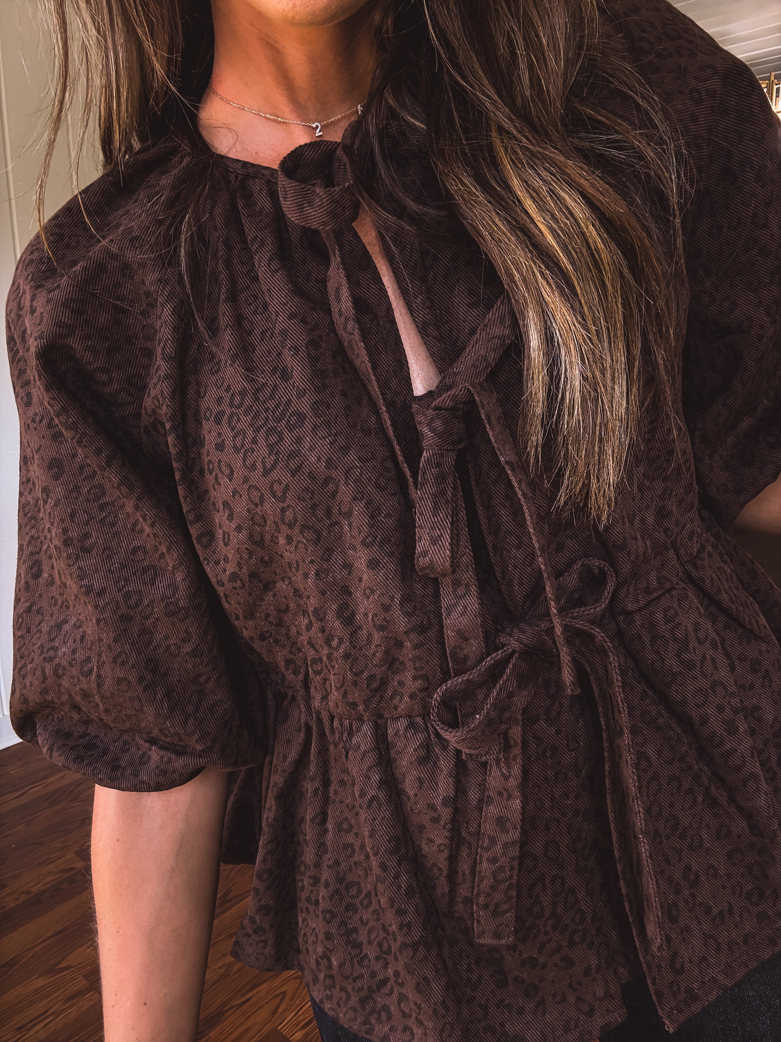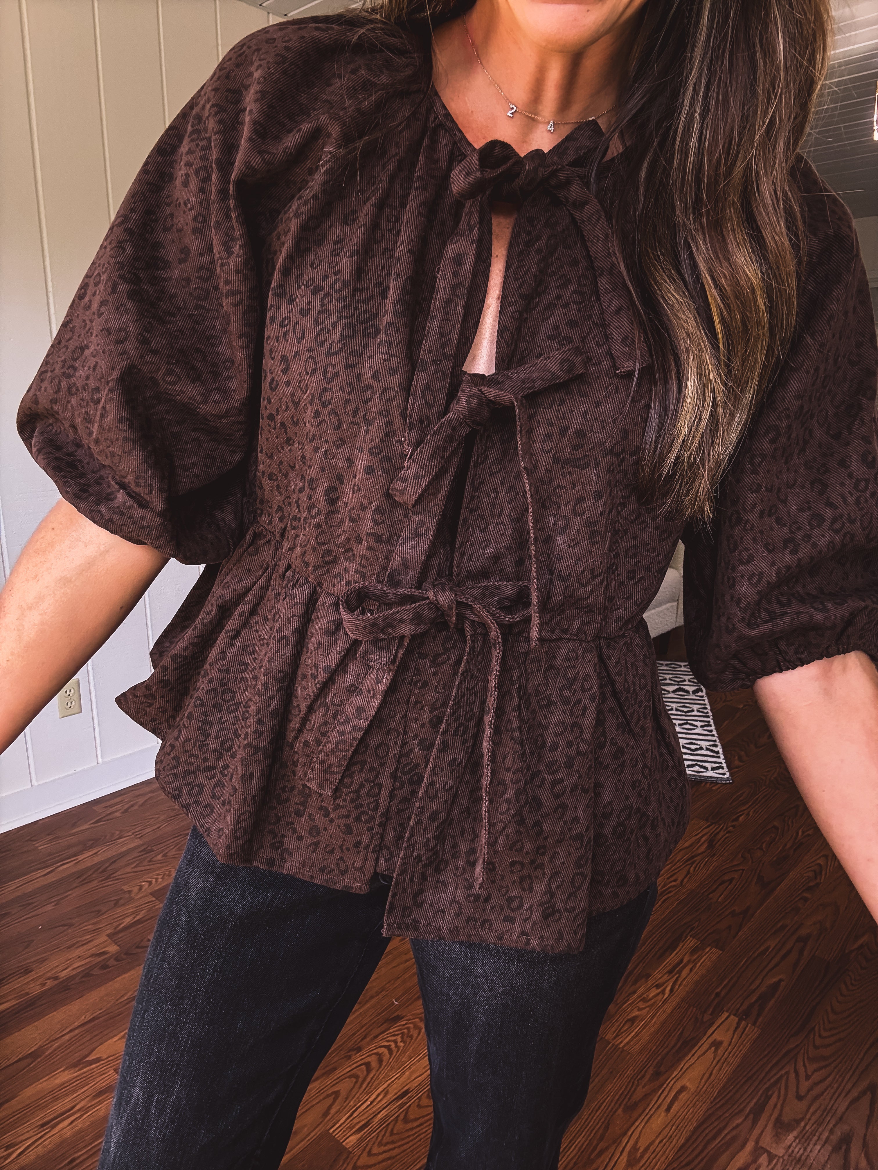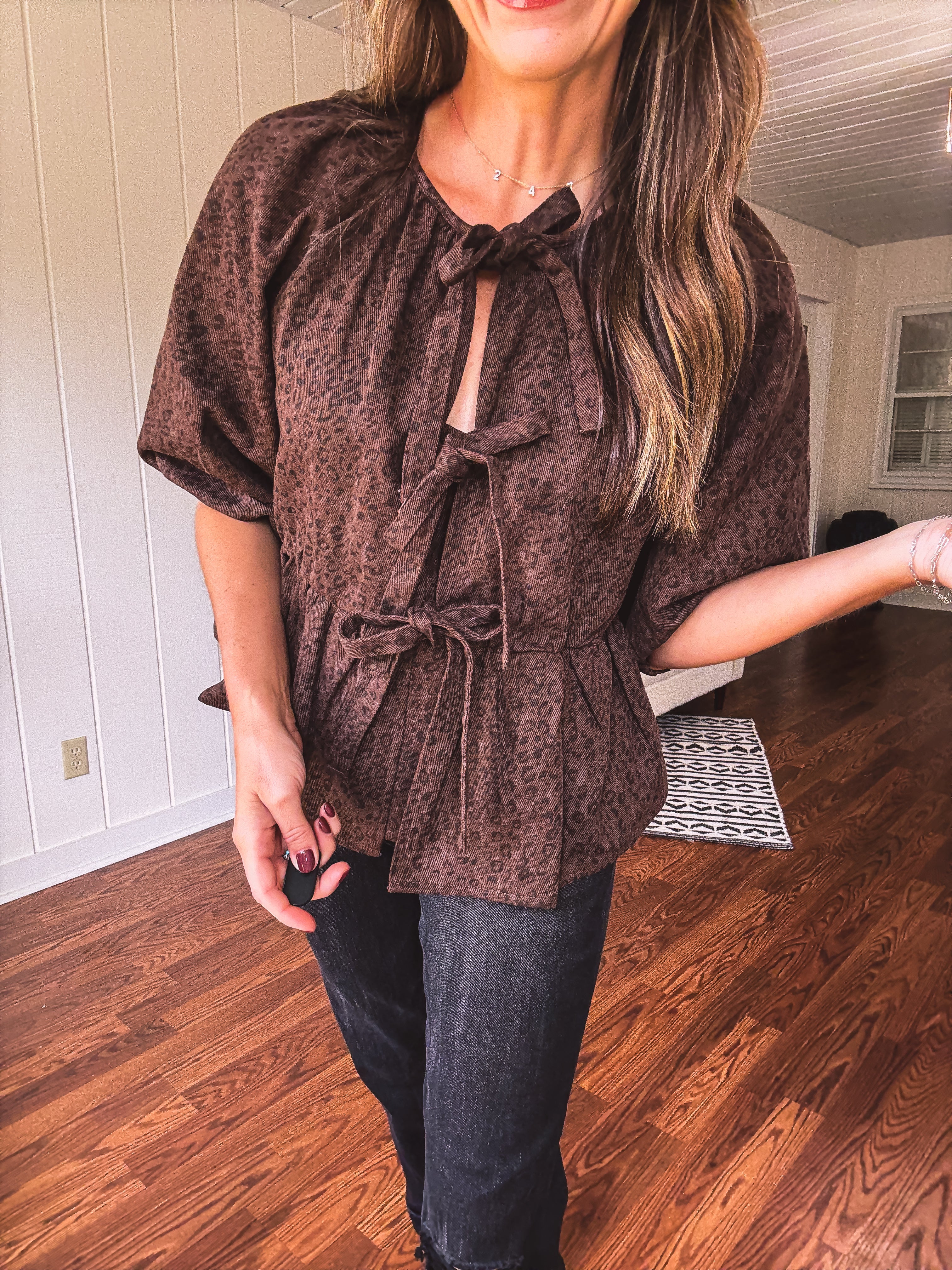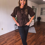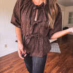 Featuring a rich, warm brown leopard pattern on a denim-like fabric, this peplum top shines with a triple tie front, flirty ruffled hem, and comfy elastic cuff 3/4 sleeves. Pair it with your go-to black or blue jeans, trousers, or skirts to add a fun, stylish vibe and make a bold statement wherever you go!