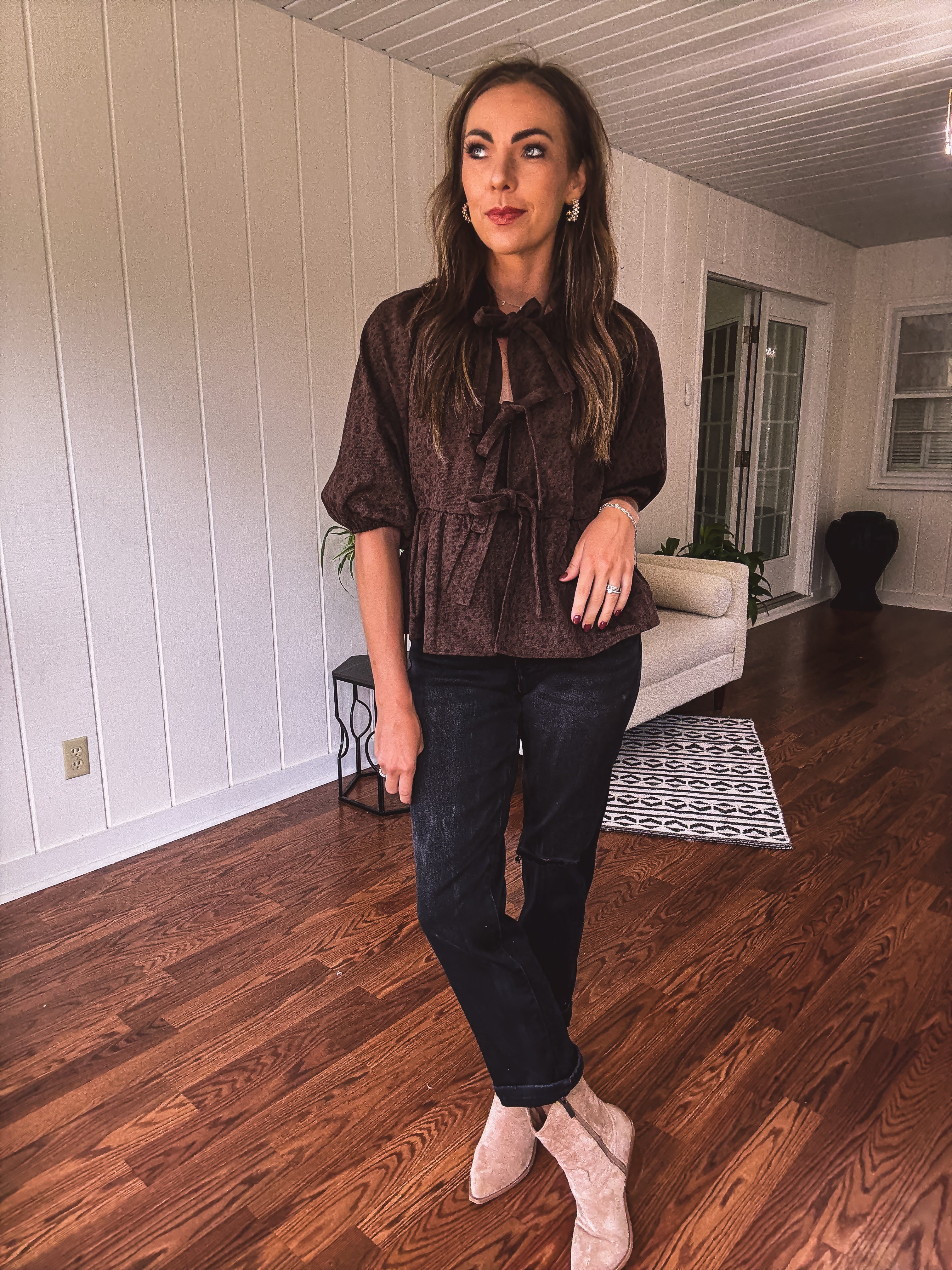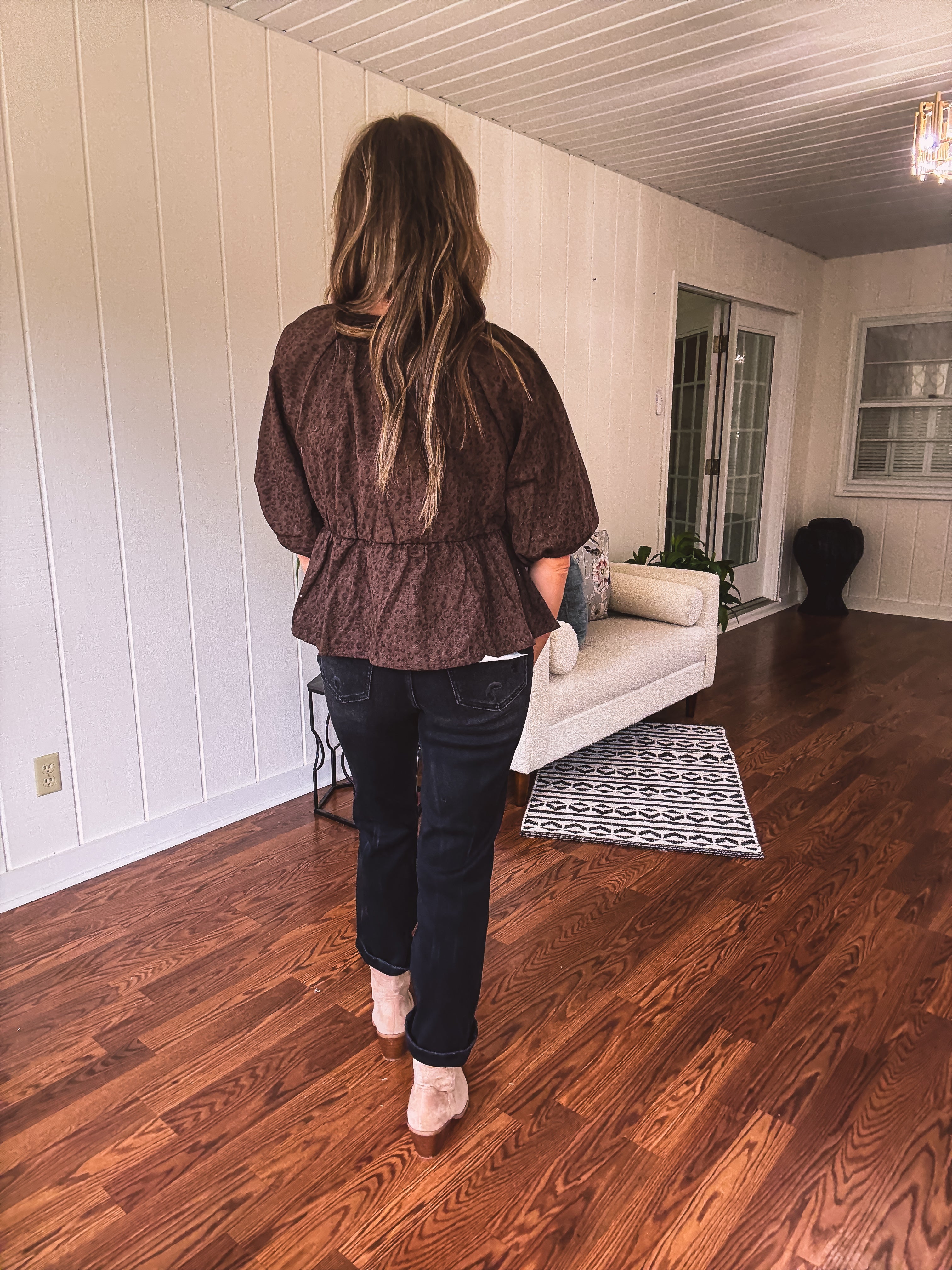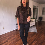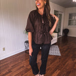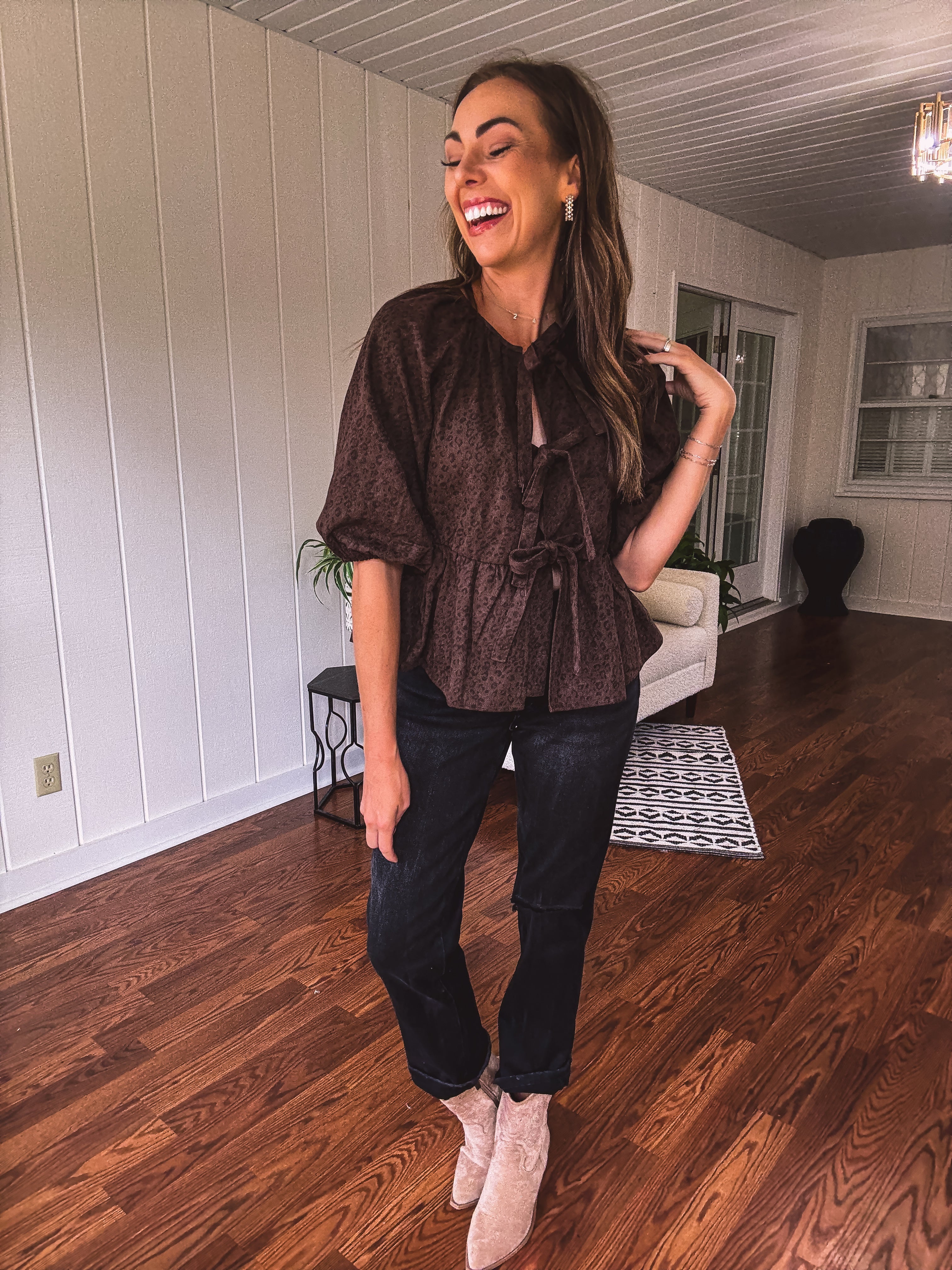 Featuring a rich, warm brown leopard pattern on a denim-like fabric, this peplum top shines with a triple tie front, flirty ruffled hem, and comfy elastic cuff 3/4 sleeves. Pair it with your go-to black or blue jeans, trousers, or skirts to add a fun, stylish vibe and make a bold statement wherever you go!