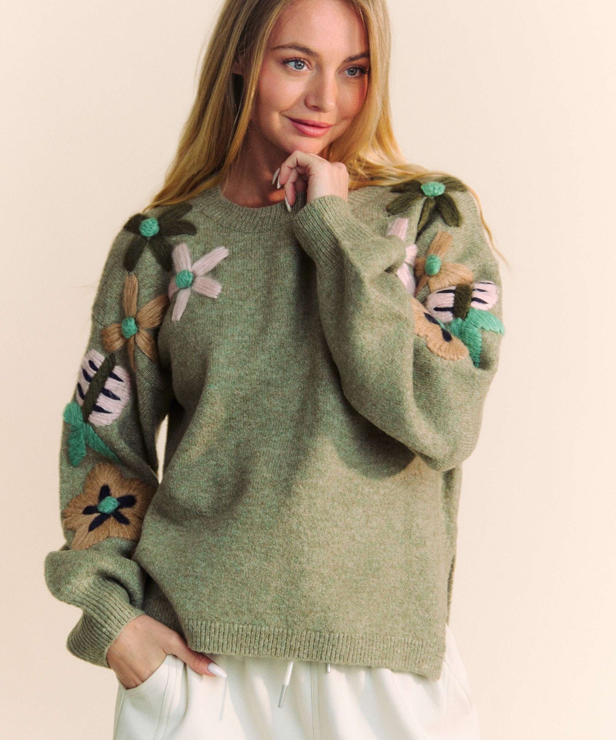 Olive Sage Floral Embroidered Sweater