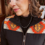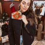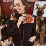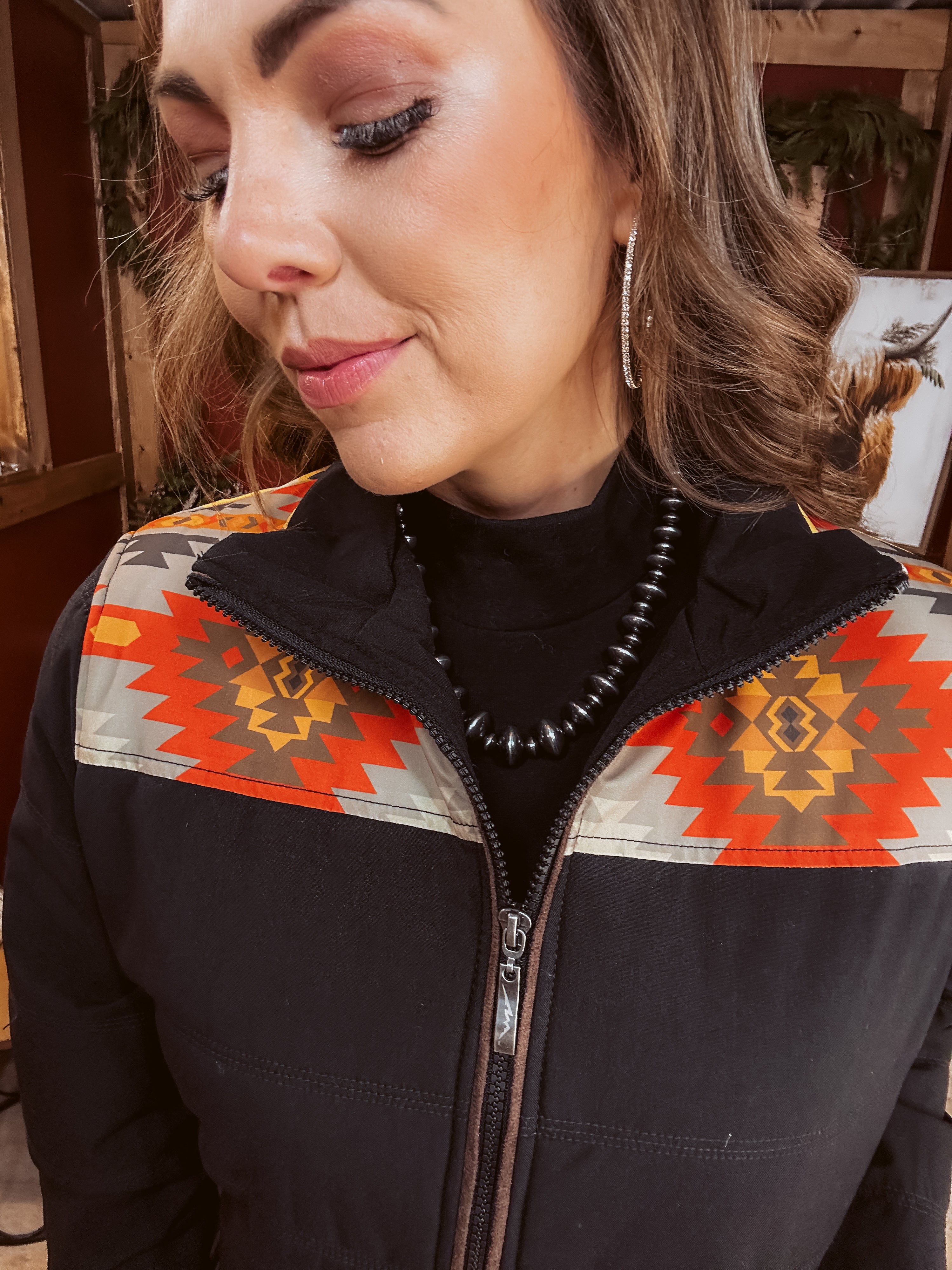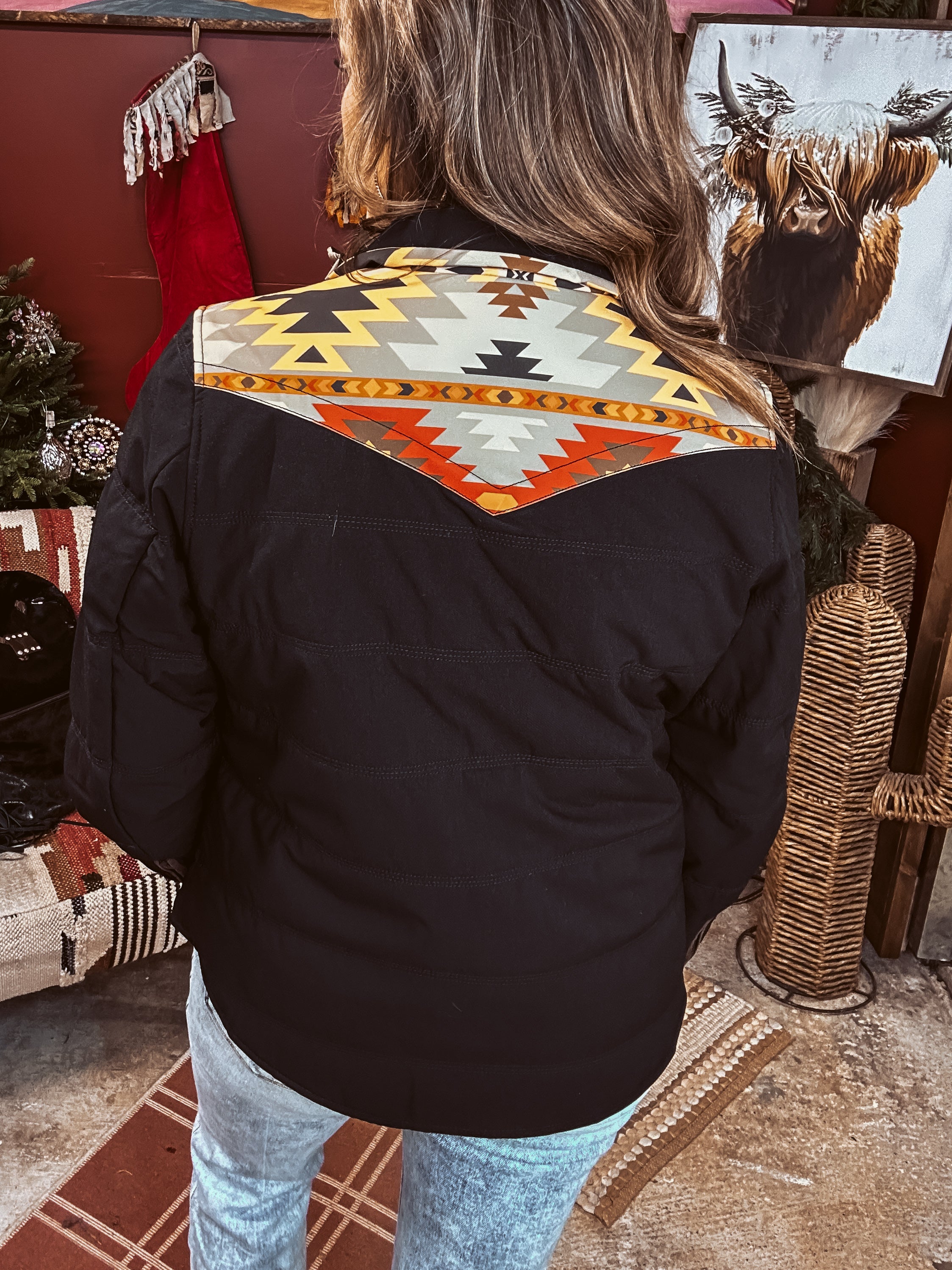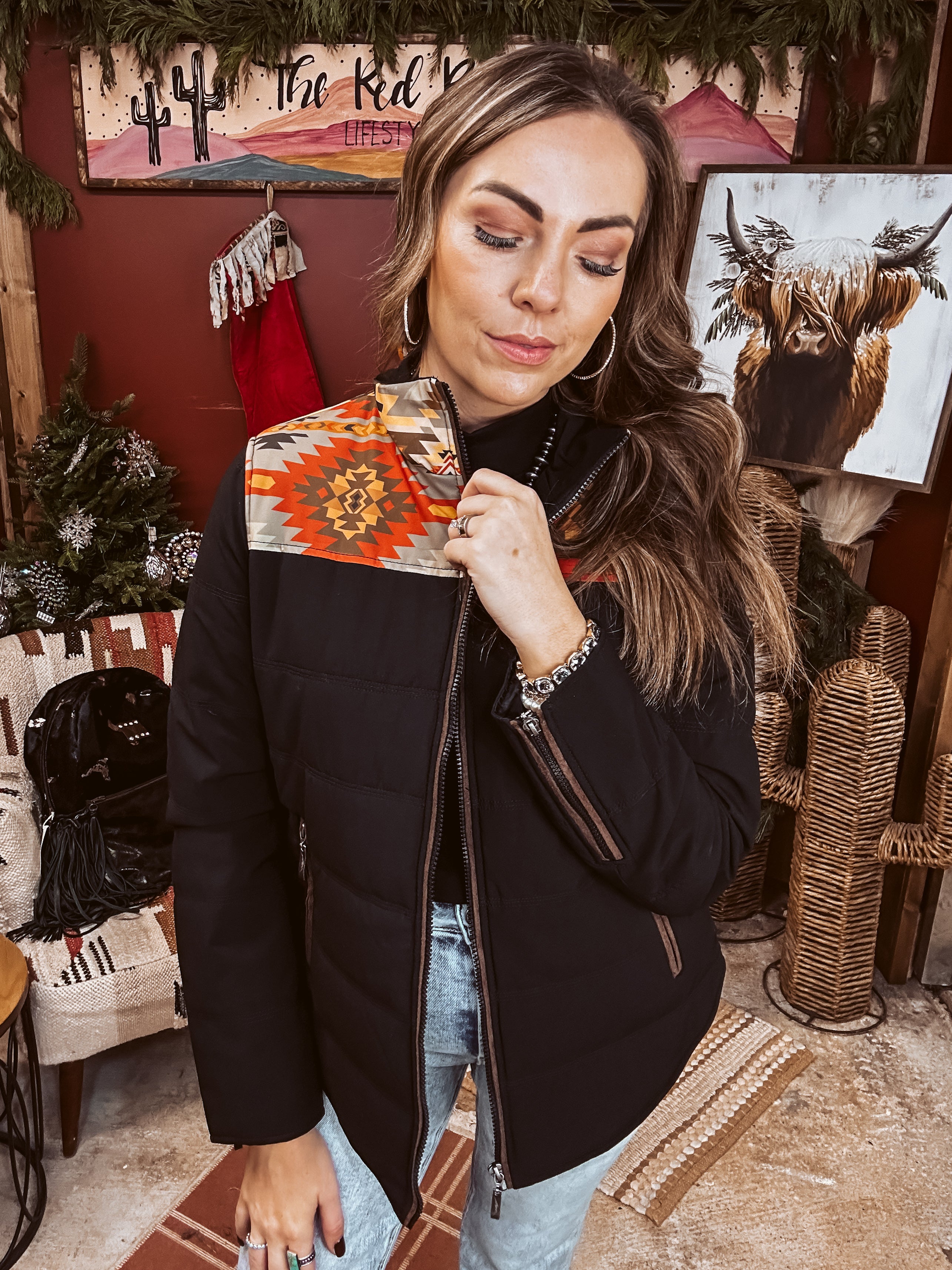 Introducing the Black Aztec Puff Jacket with Suede Trim - the perfect fusion of tough cowgirl style and luxe details. With Aztec quilted trim detailing, this jacket offers both form and function. Stay warm and stylish in any weather with this statement piece.