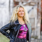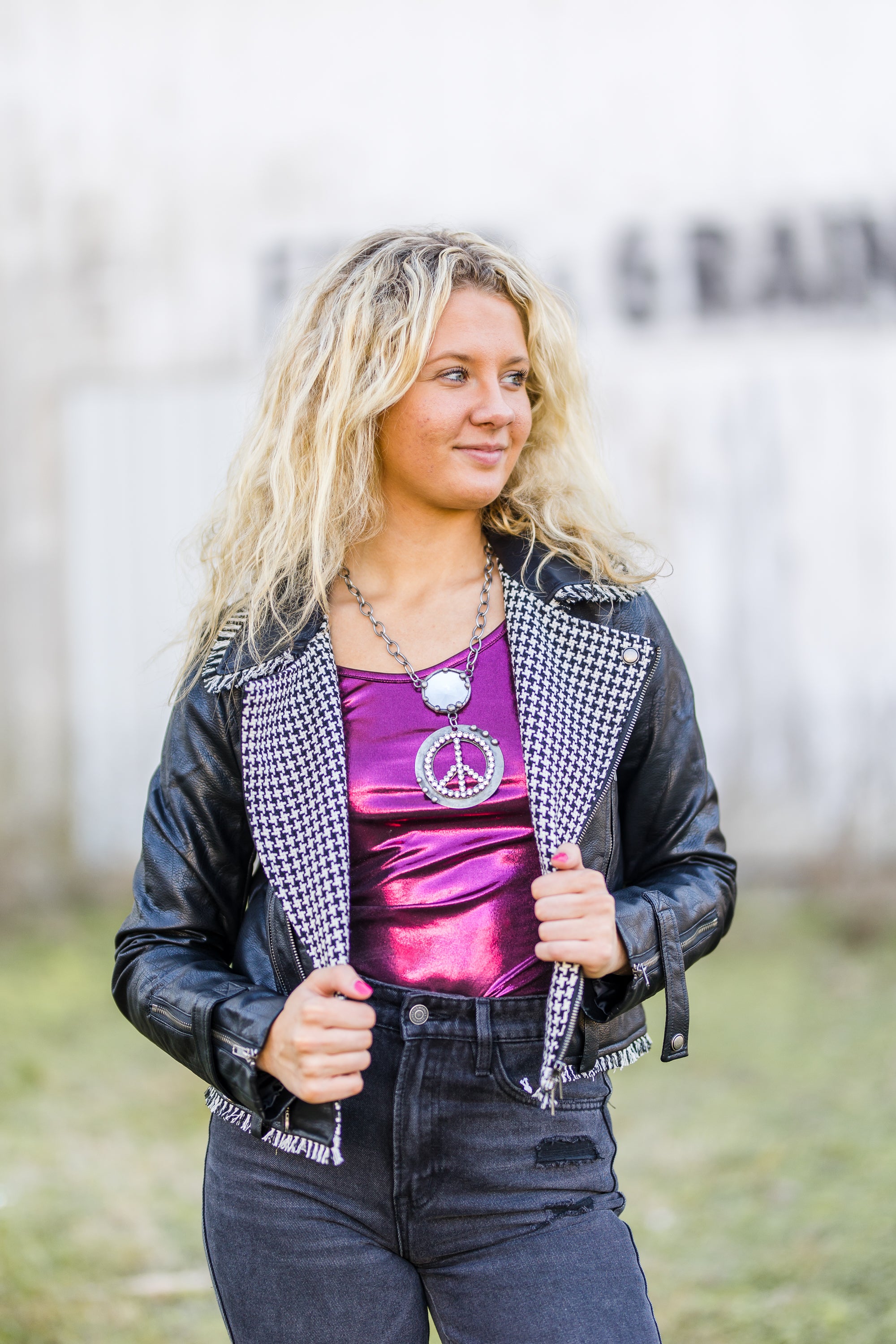 Black Faux Leather Moto Jacket with Gingham Contrast