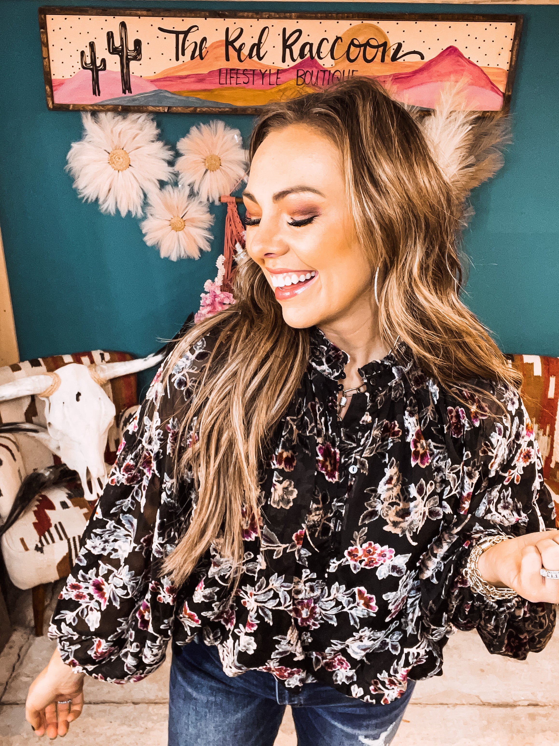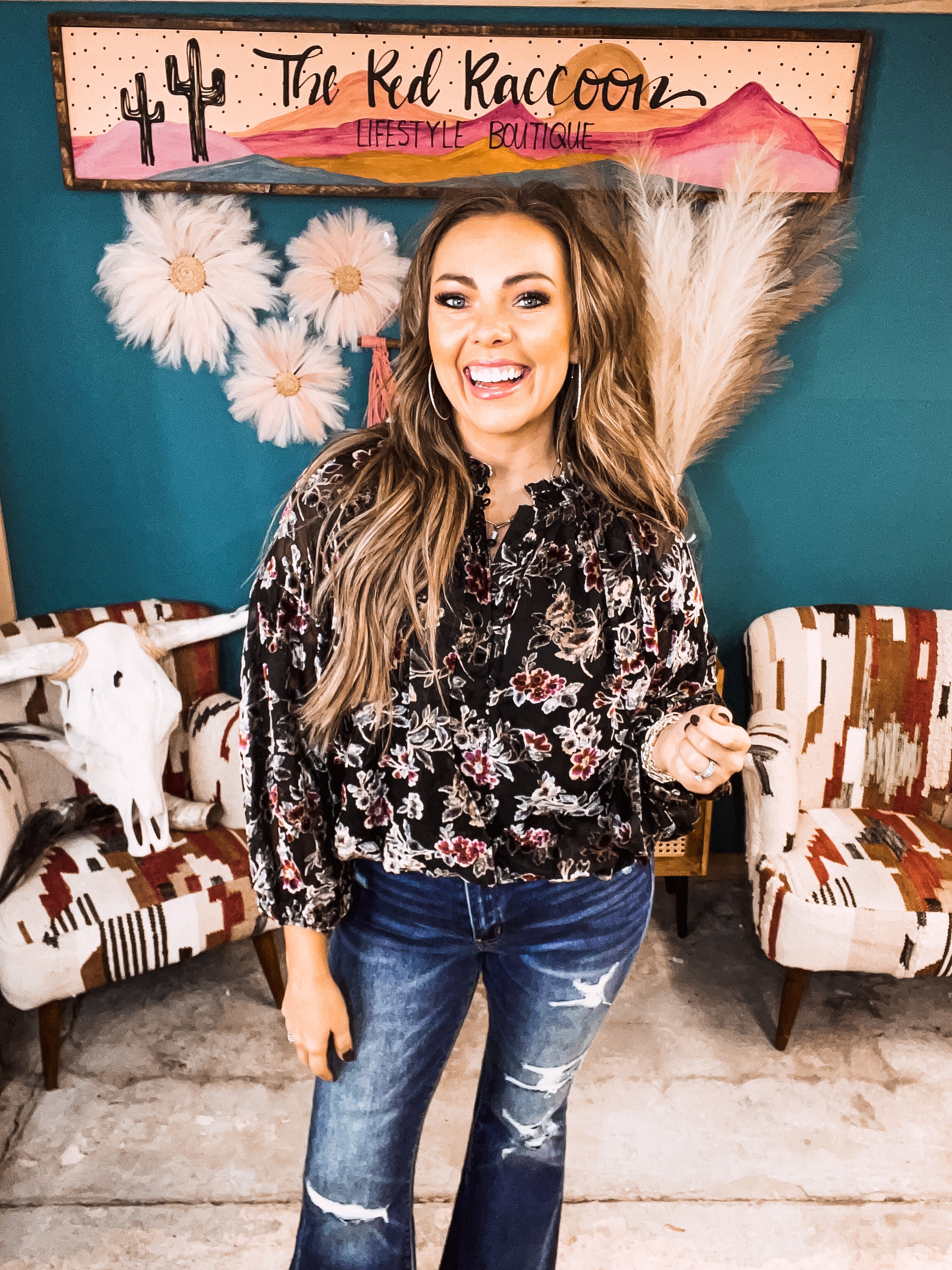 Black Multi Floral Burnout Velvet Bubble Waist Top