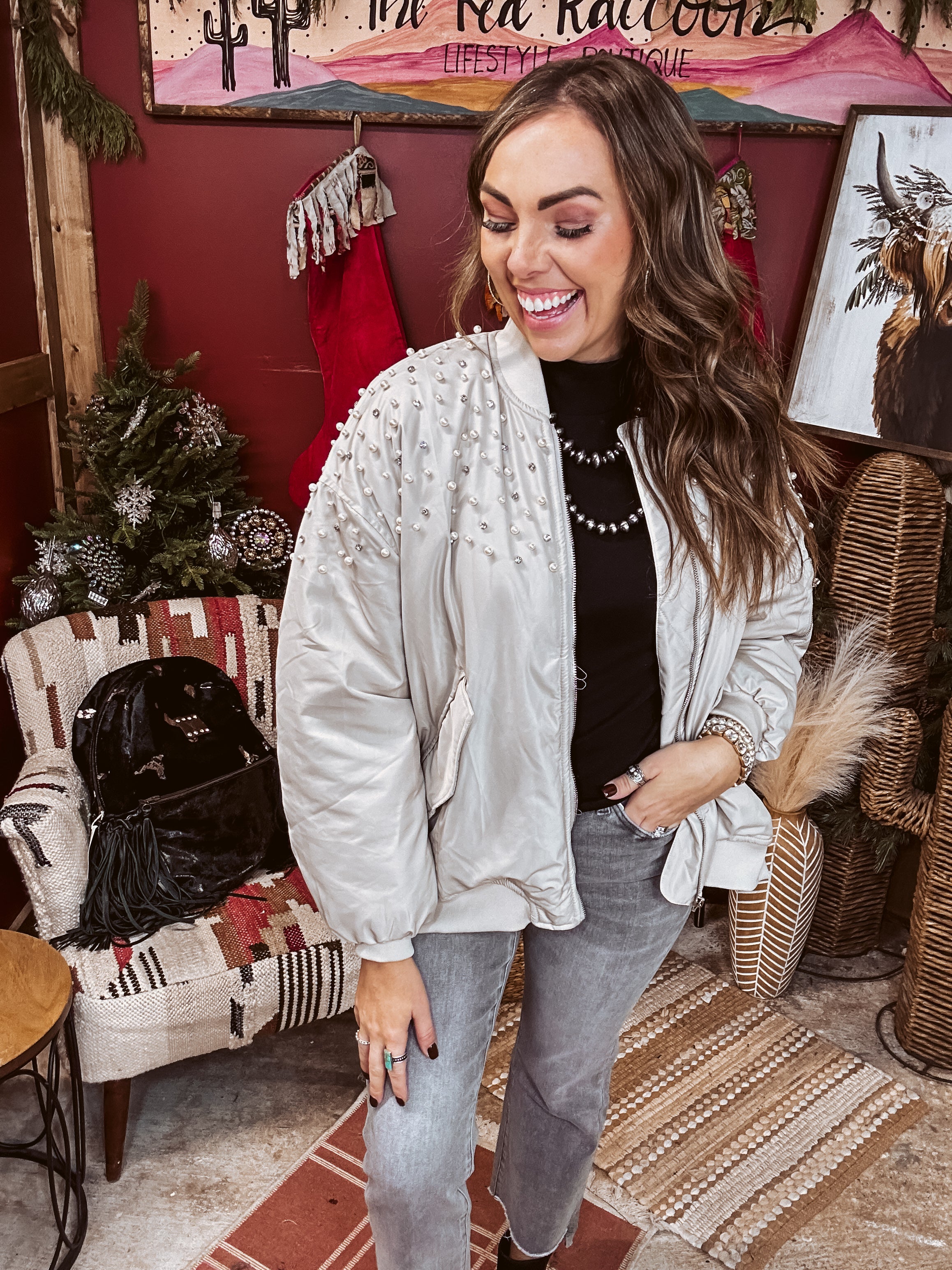 "As a true boss babe, you need a jacket that exudes confidence and style. Our Bone Rhinestone Bomber Jacket offers just that, with its blinged-out design and comfortable fit. Take on any challenge and stand out from the crowd with this daring addition to your wardrobe. Own your power and make a statement!"