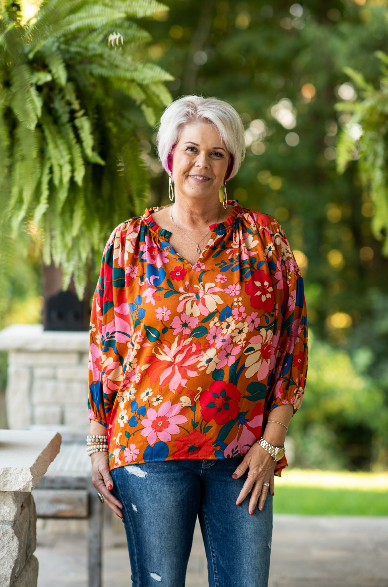 Camel Floral Print L/S V Neck with Ruffle Neck
