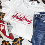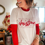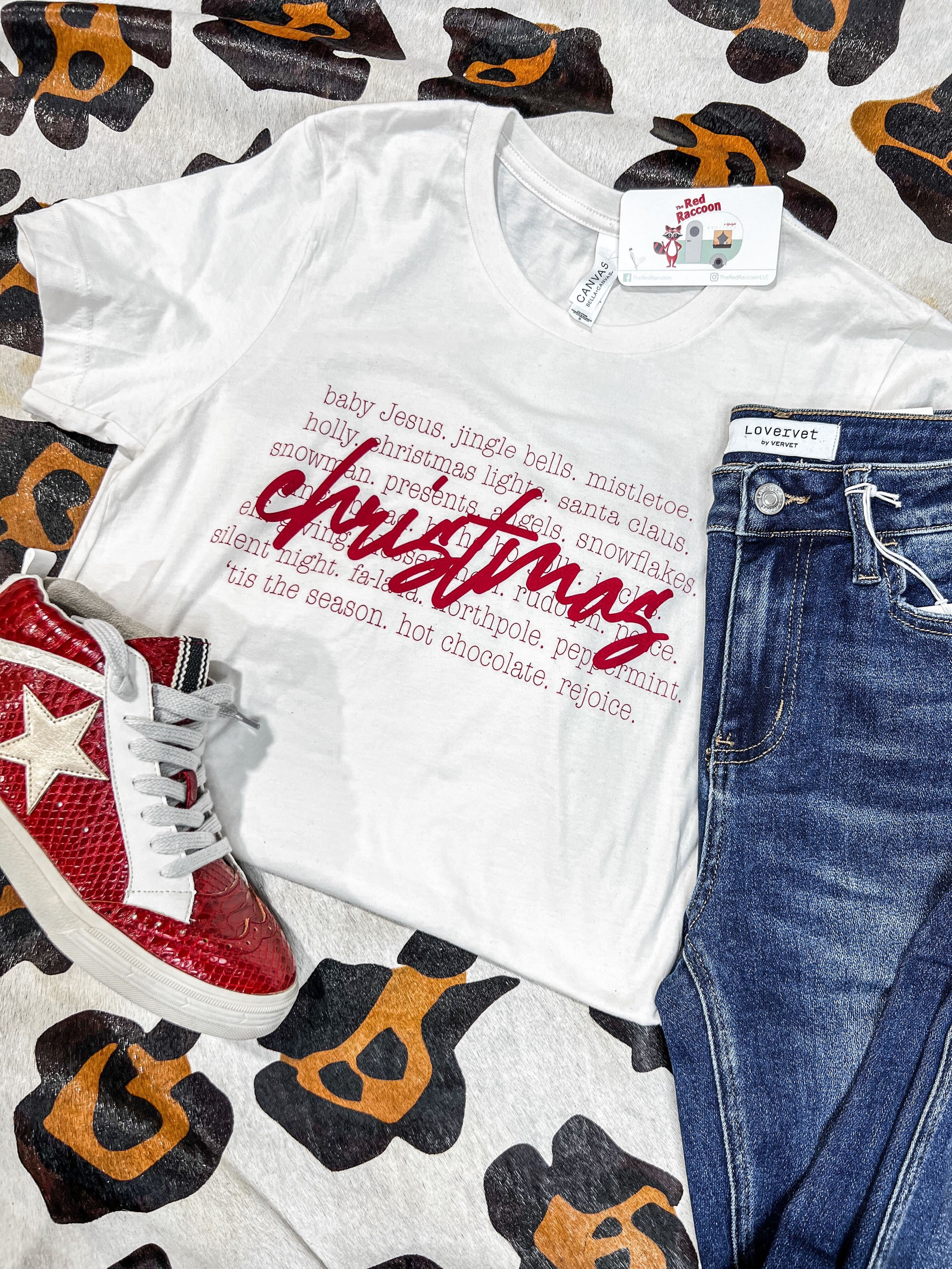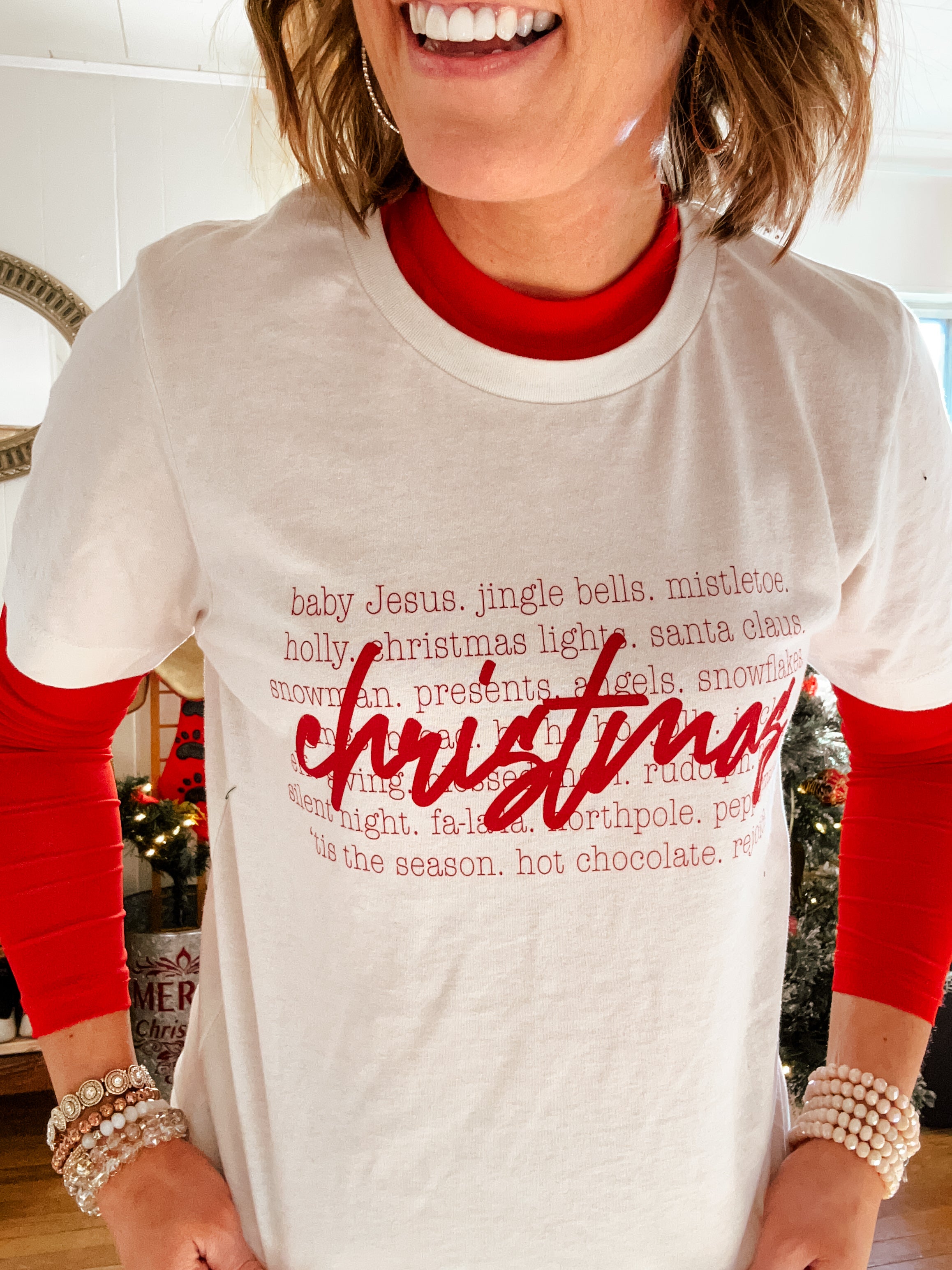 This 100% Cotton t-shirt showcases a classic, white-washed design with vibrant red lettering, featuring words such as "baby Jesus," "jingle bells," "mistletoe," and more. Available in sizes up to 4XL, its soft and cozy feel is simply irresistible. Dress it up with a long-sleeved mesh or layer it with a cardigan or vest for a fashionable holiday season. Don't miss out on this must-have tee!