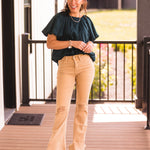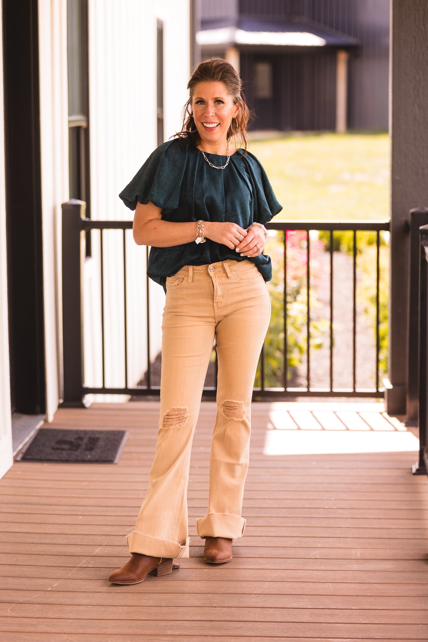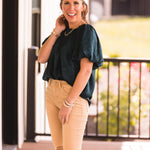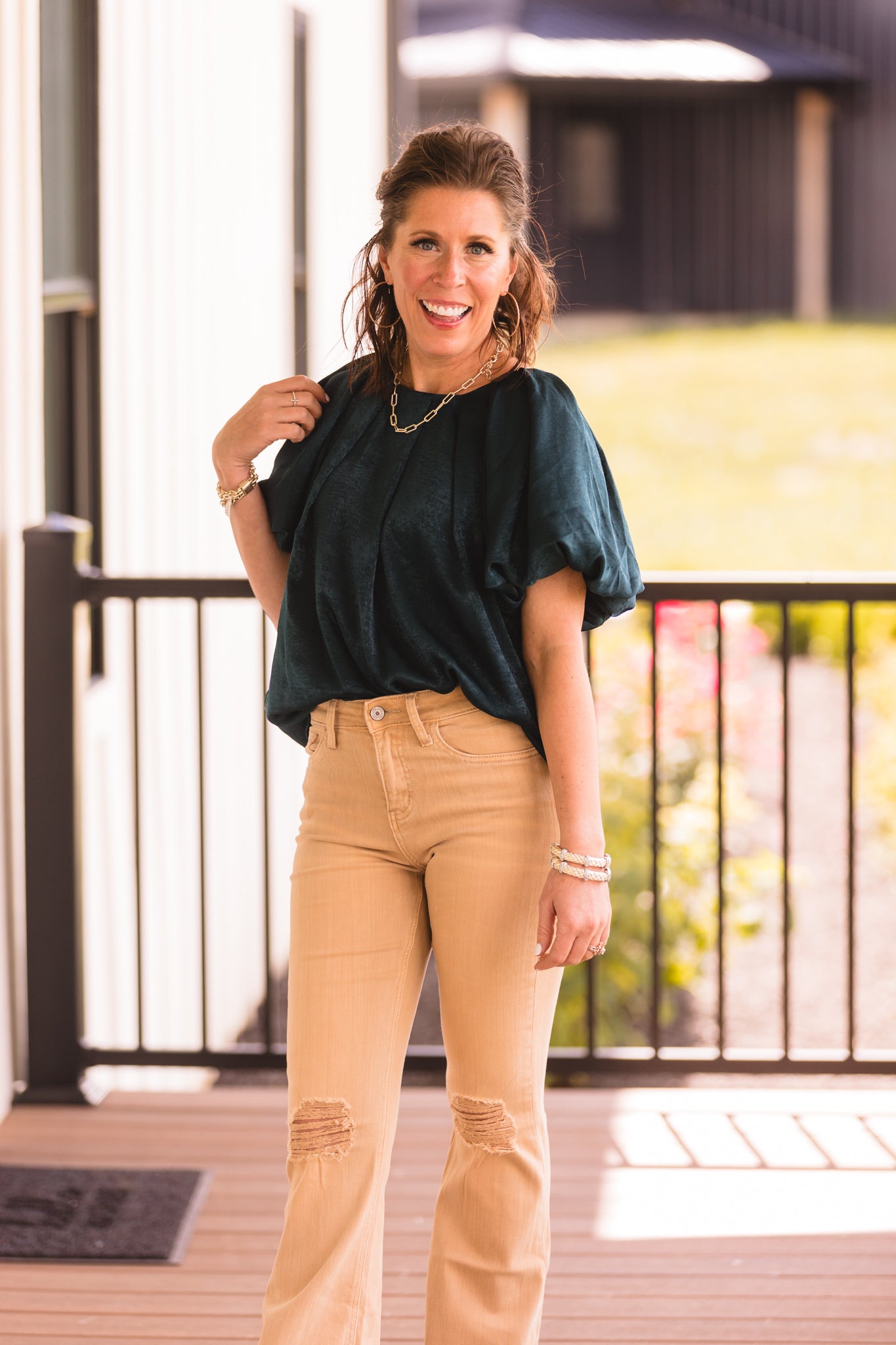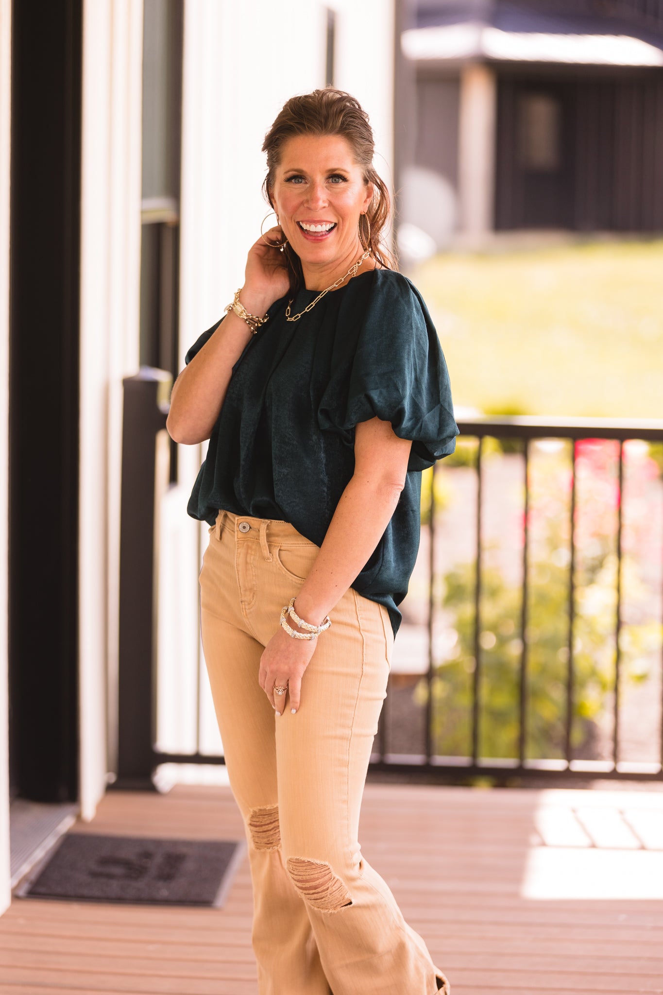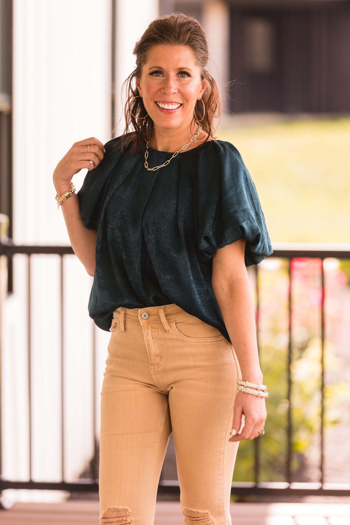 Dark Teal Satin Shimmer Round Neck Puff Sleeve S/S Blouse