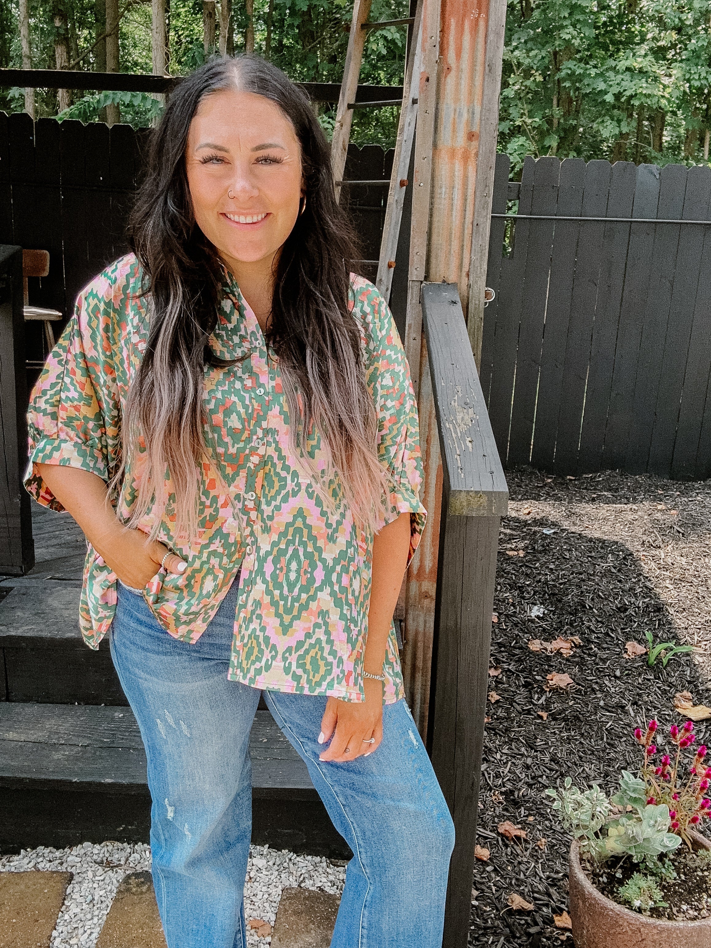 Elevate your look with our Dry Herb Aztec Print Button Down Silk Blouse that boasts a stylish collar, abalone buttons, and cuff style sleeves. The vibrant colors of dark green, pink, rust, and yellow in the Aztec design along with the silky fabric make it an eye-catching piece. The dolman style and lightweight material are perfect to flatter every figure and make it a versatile piece to wear in summer or pair with your favorite denim and cardigan for a stylish fall look.