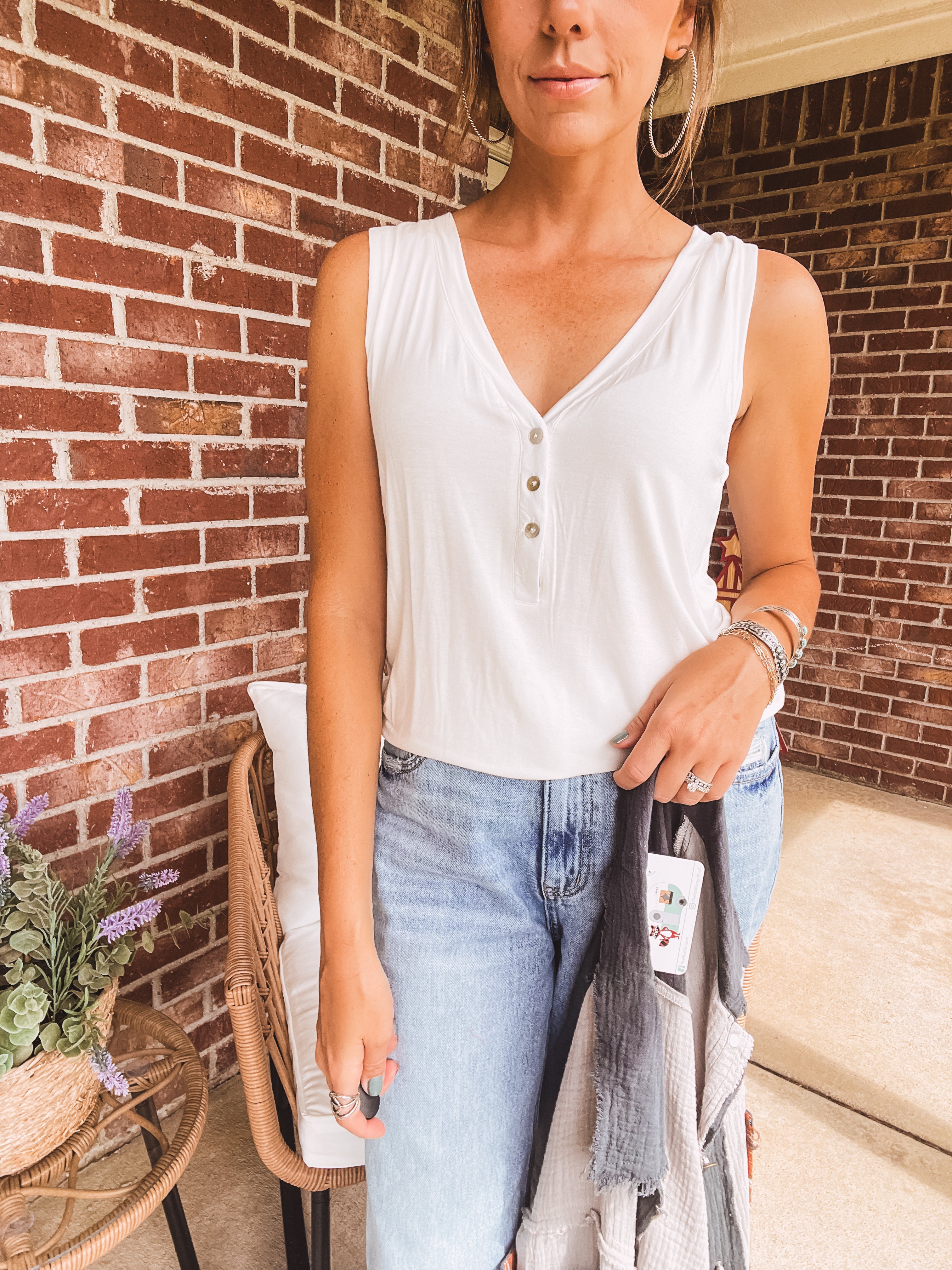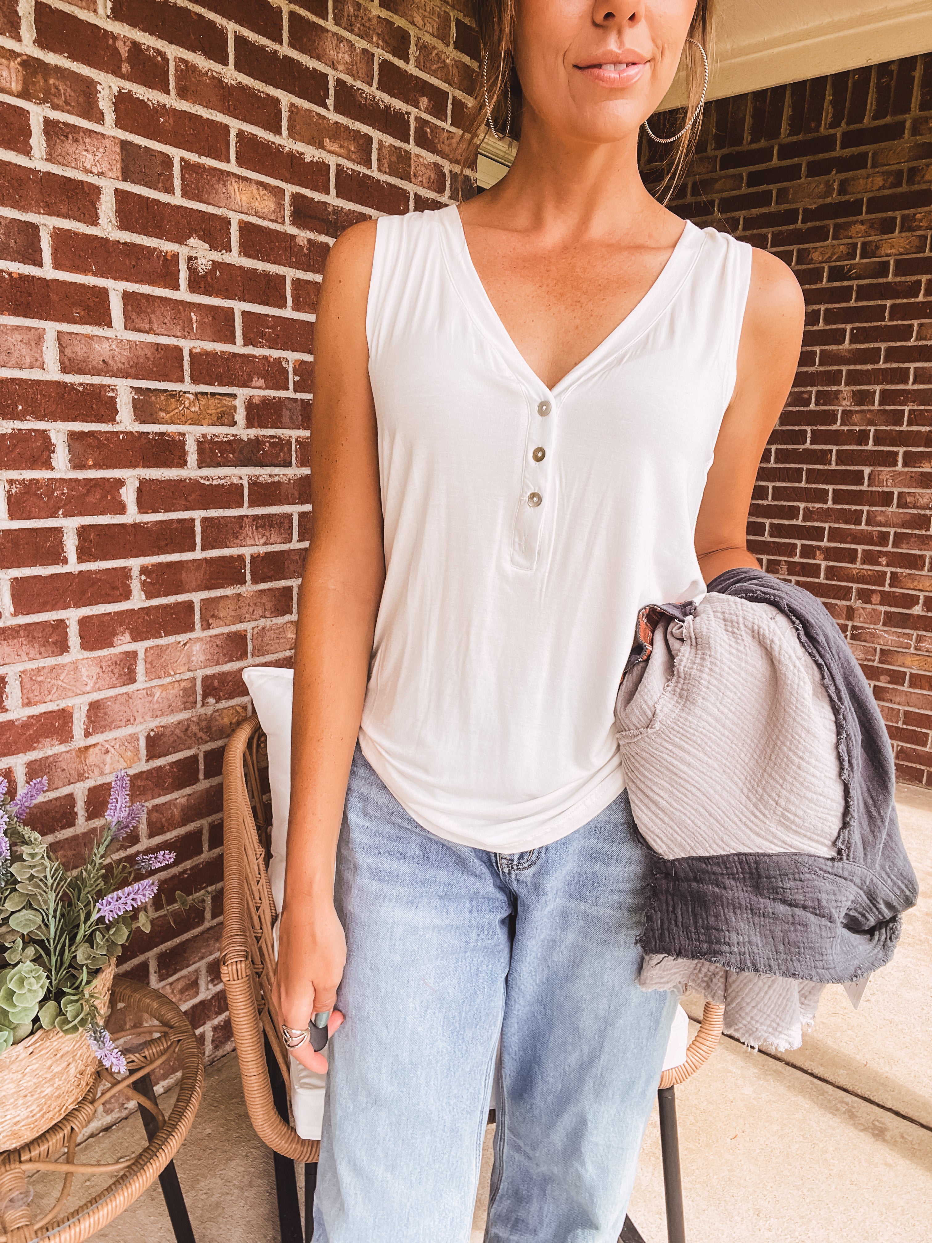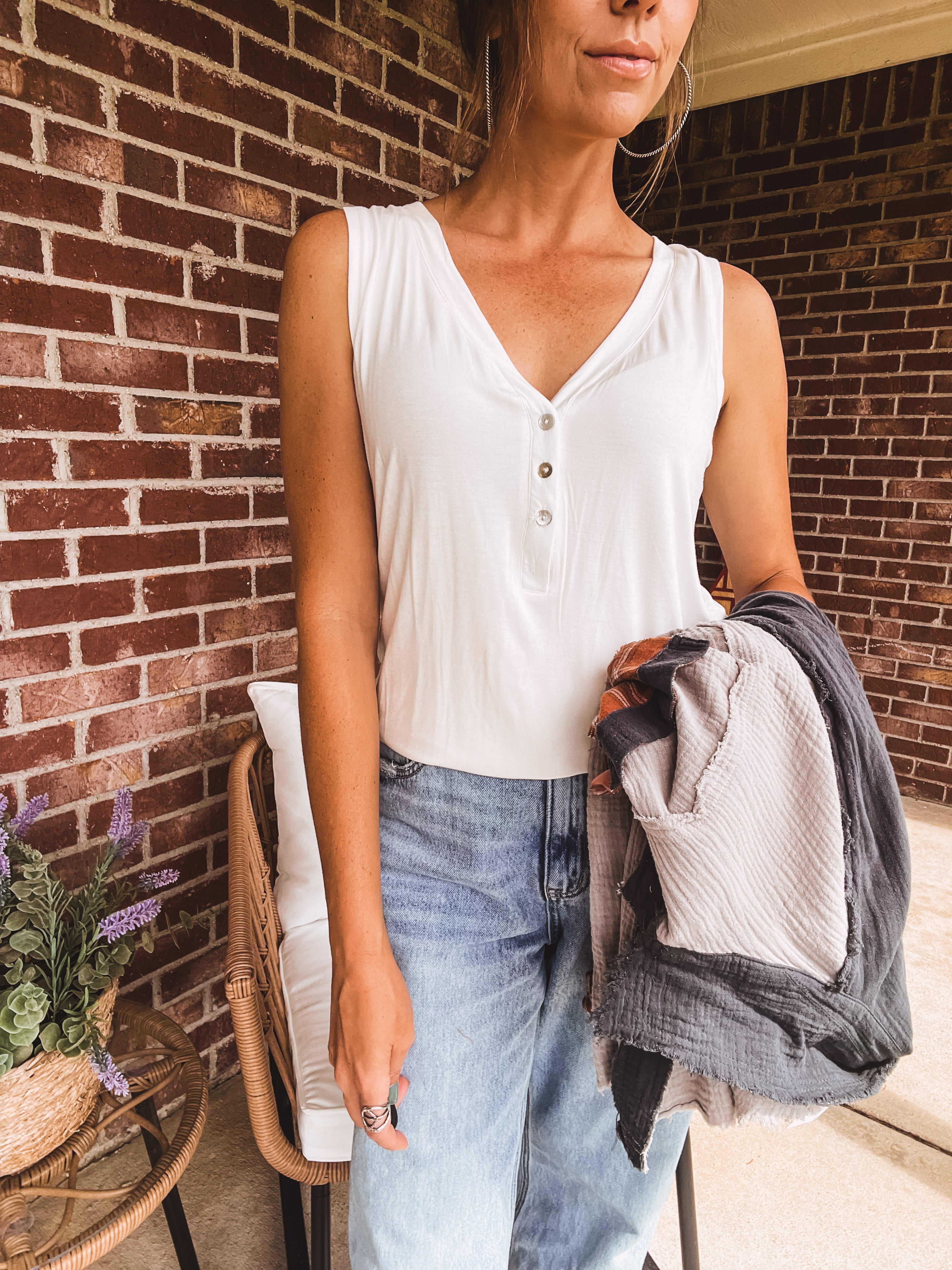 Experience the buttery softness of this Ivory Front Button Thank! Flowy material, complete with two functional abalone buttons and a flattering V-neck design. Stay cool and comfortable all summer long without feeling constricted - this tank is perfect for you!
