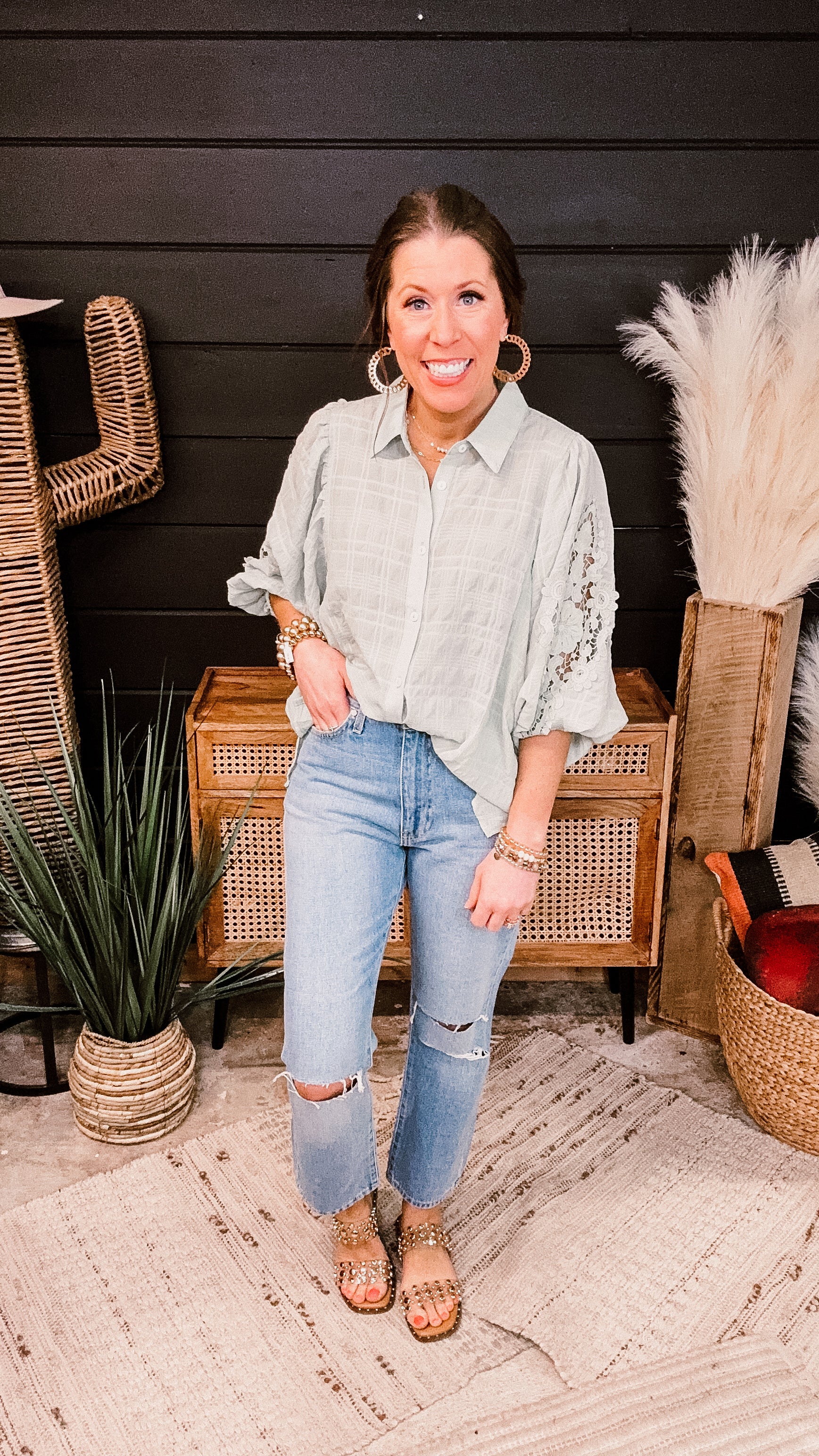 Light Sage Woven Shirt with Lace Sleeve Detail