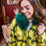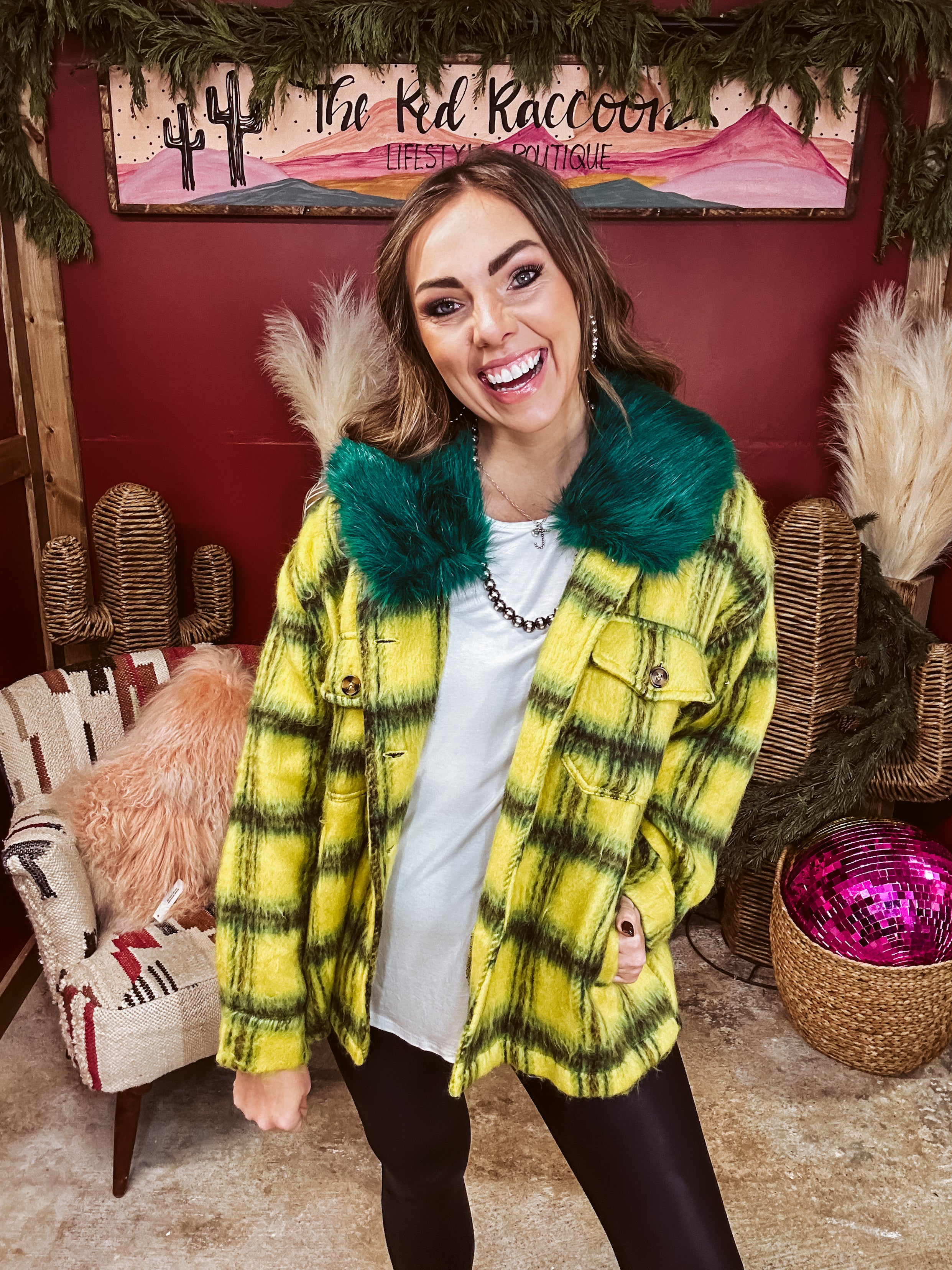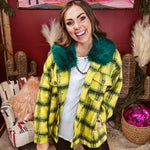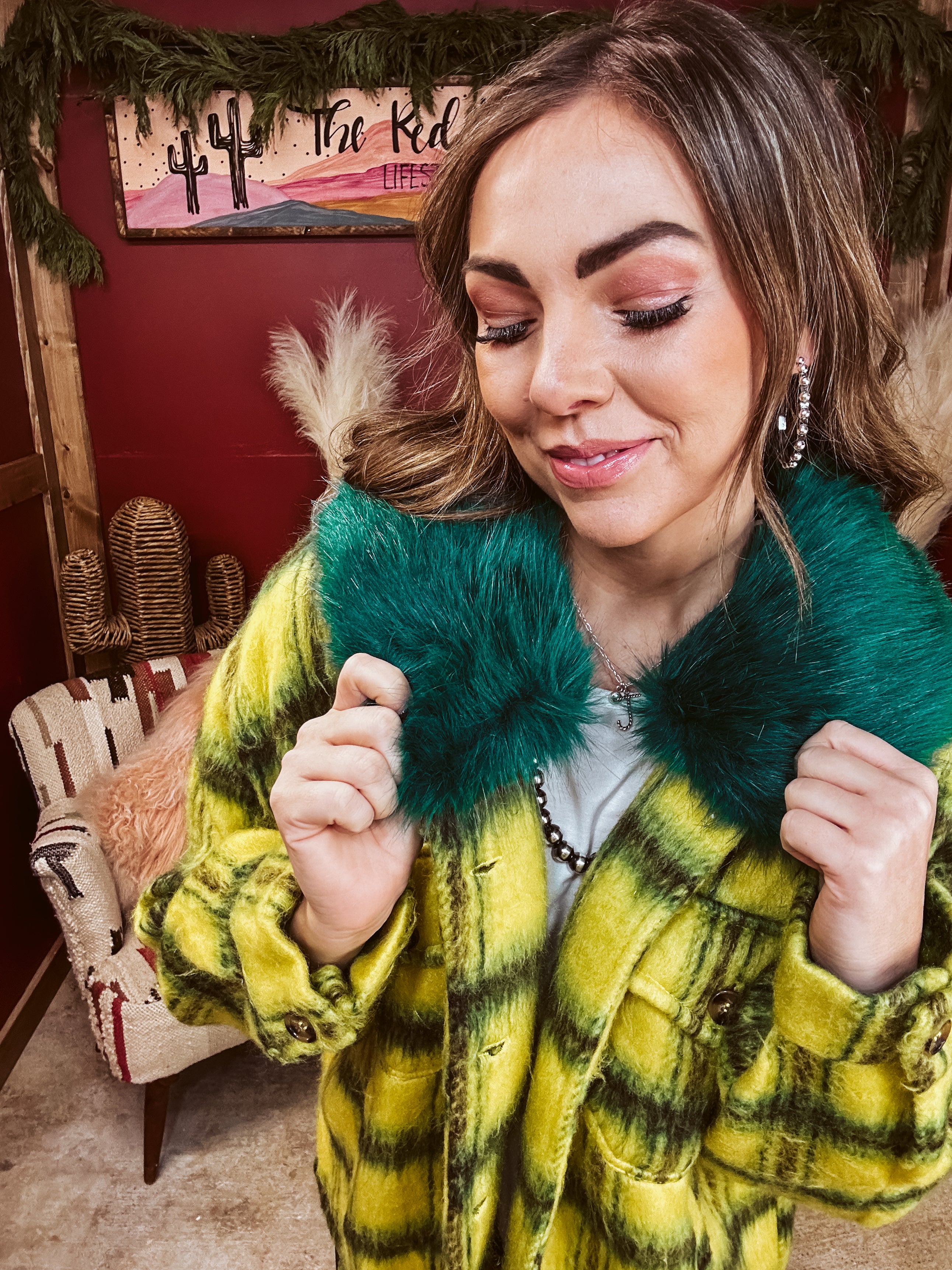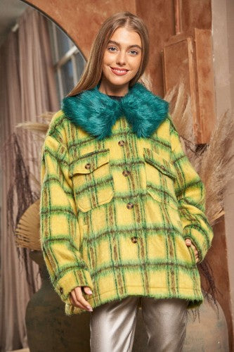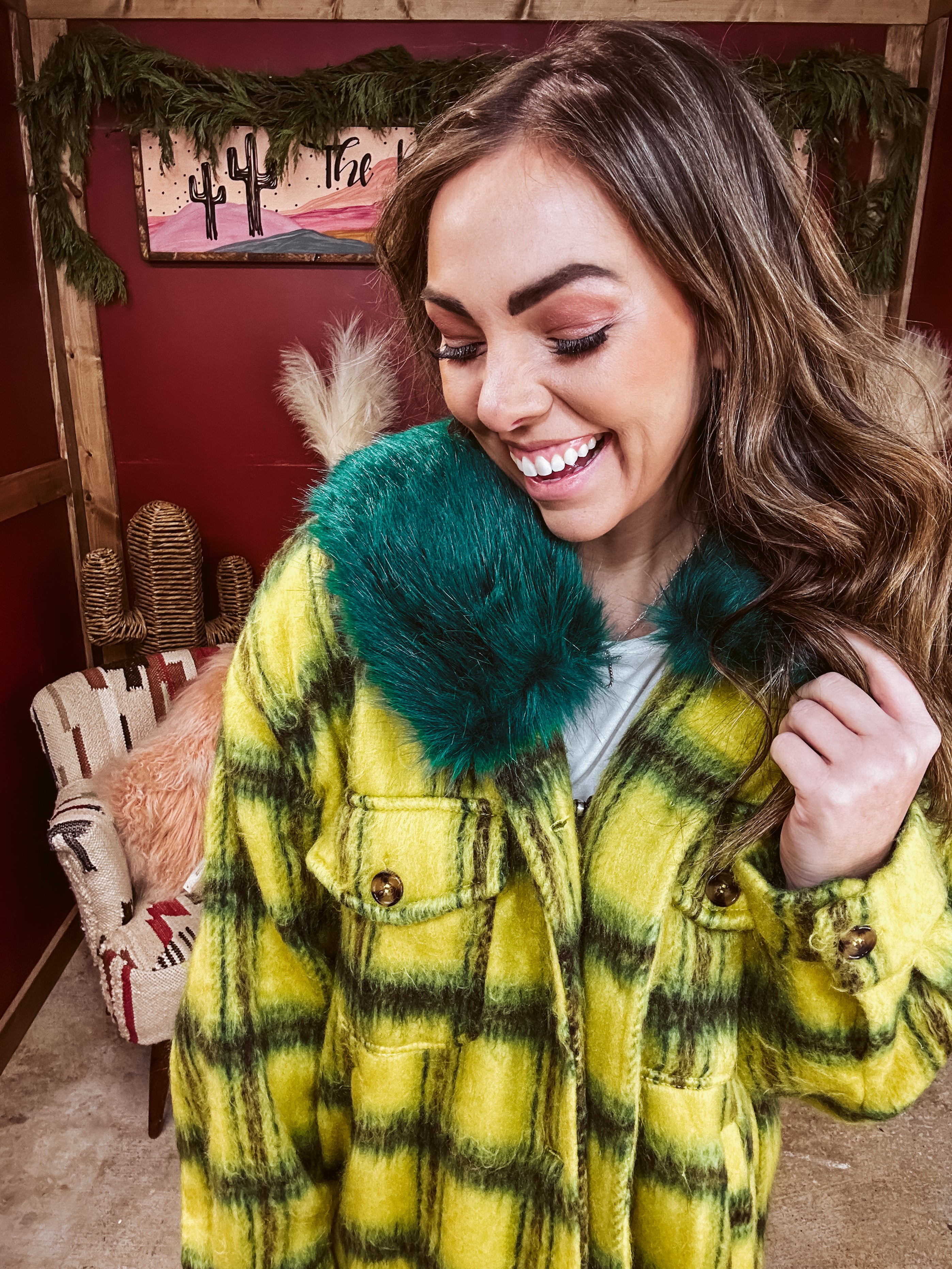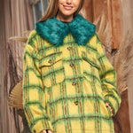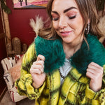 Lime + Yellow Fuzzy Plaid Jacket with Furry Collar