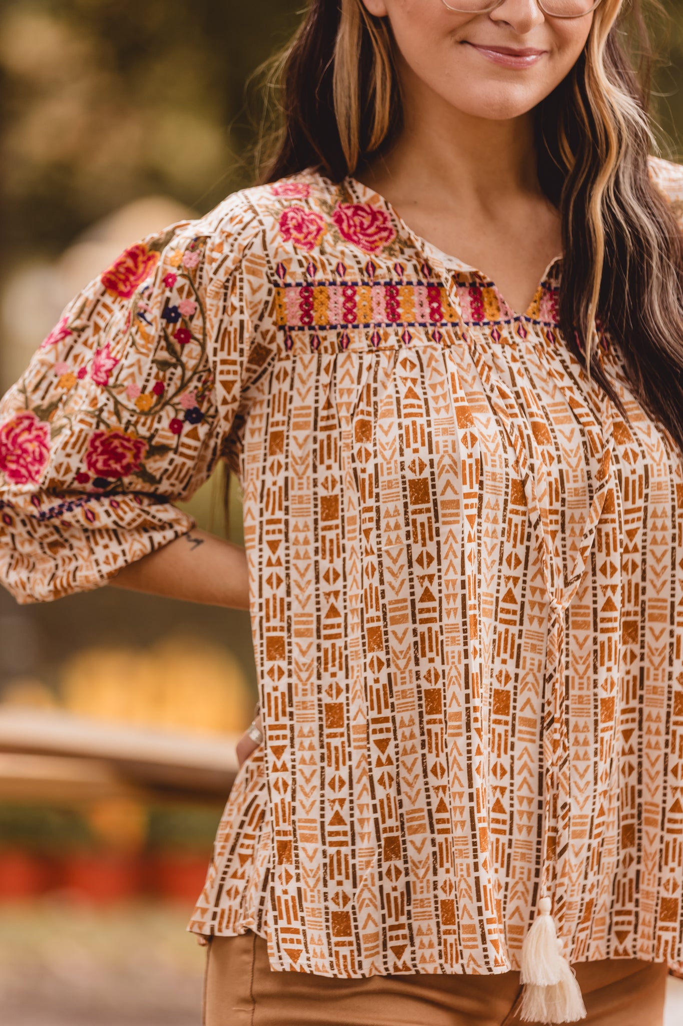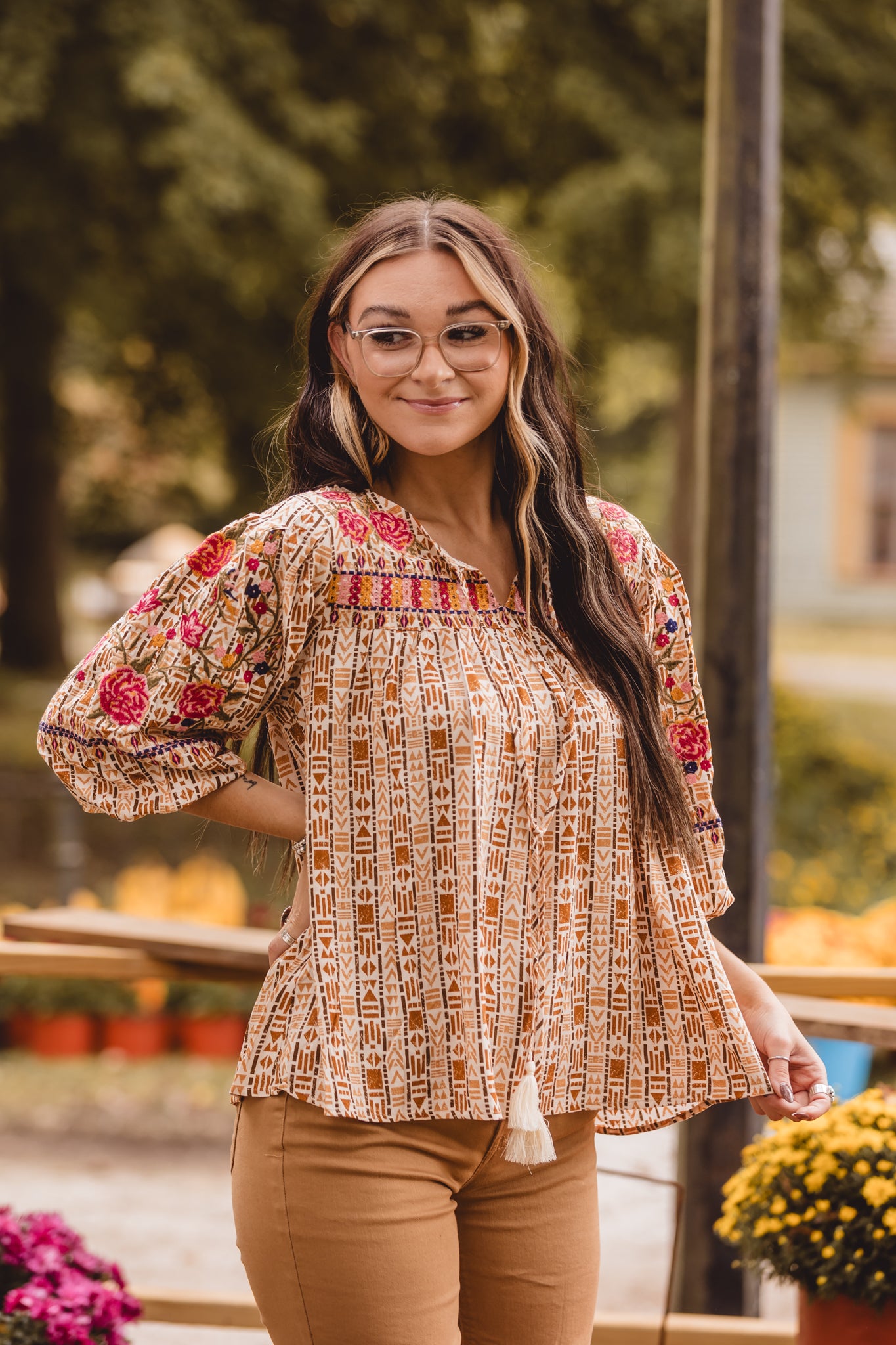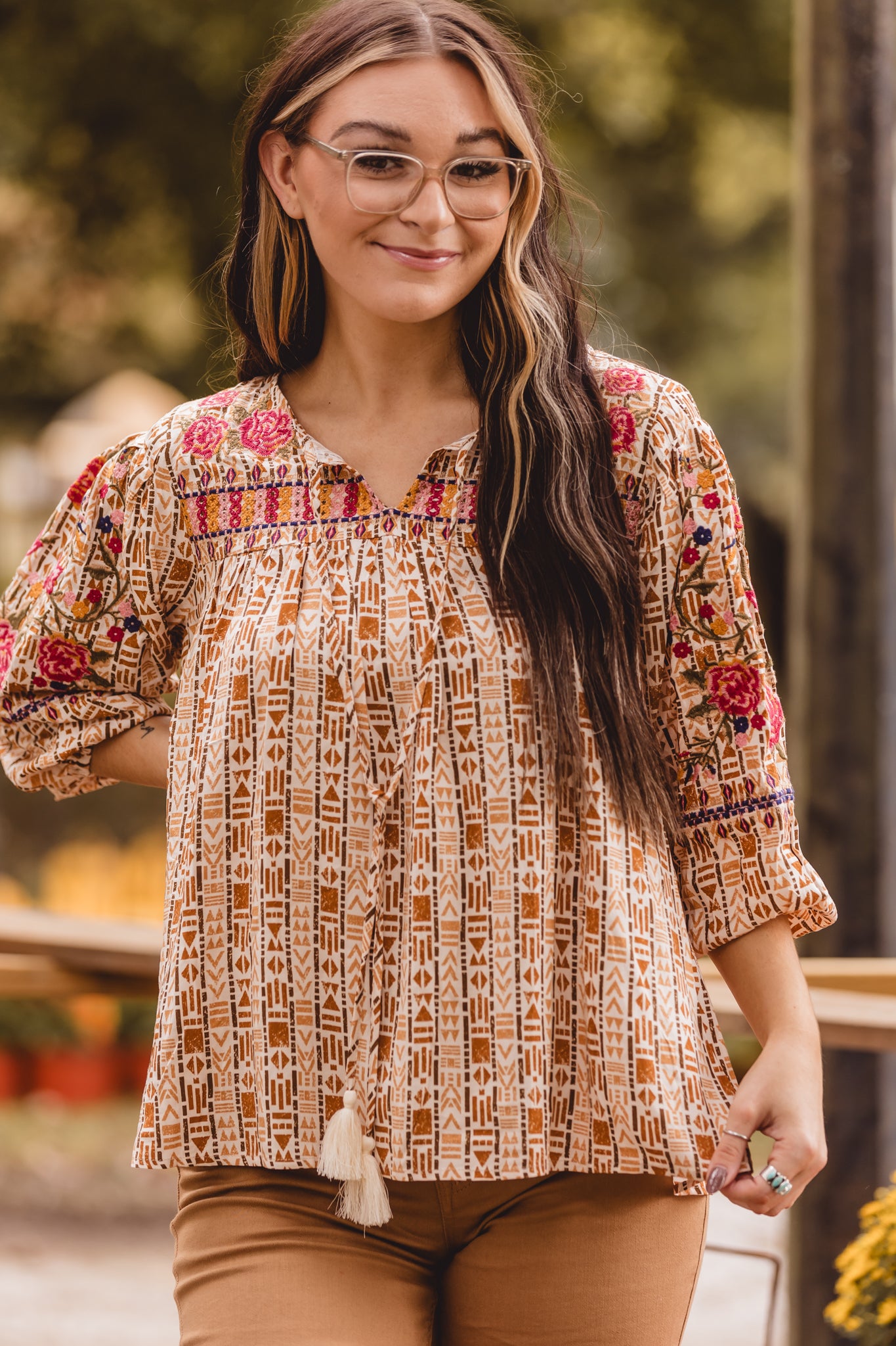 Experience bohemian bliss with this Rust Geometric Embroidered Top from Savanna Jane. This peasant-style blouse boasts a one-of-a-kind geometric design and stunning embroidered flowers on the sleeves. Complete with an elastic wrist and a small v-neck adorned with tasseled strings, this lightweight top offers a versatile, yet standout look. Bring your boho chic game to the next level.